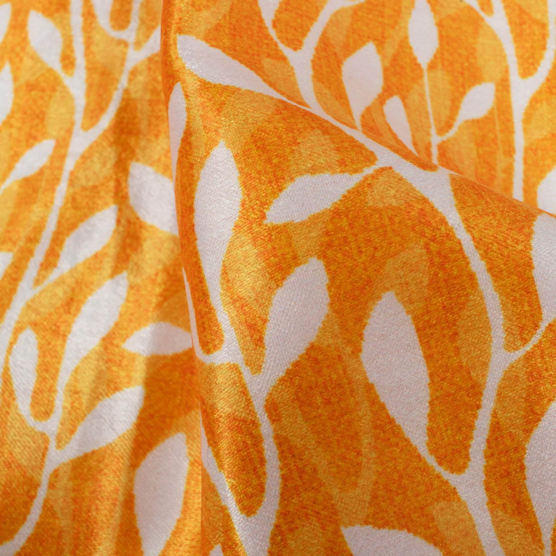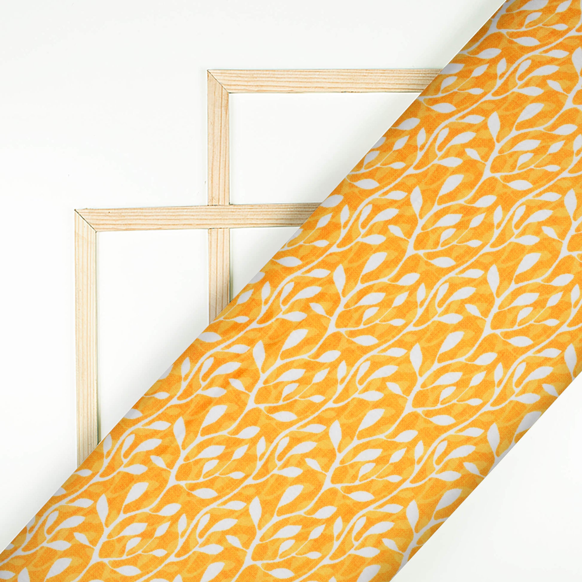 Amber Yellow And White Leaf Pattern Digital Print Lush Satin Fabric