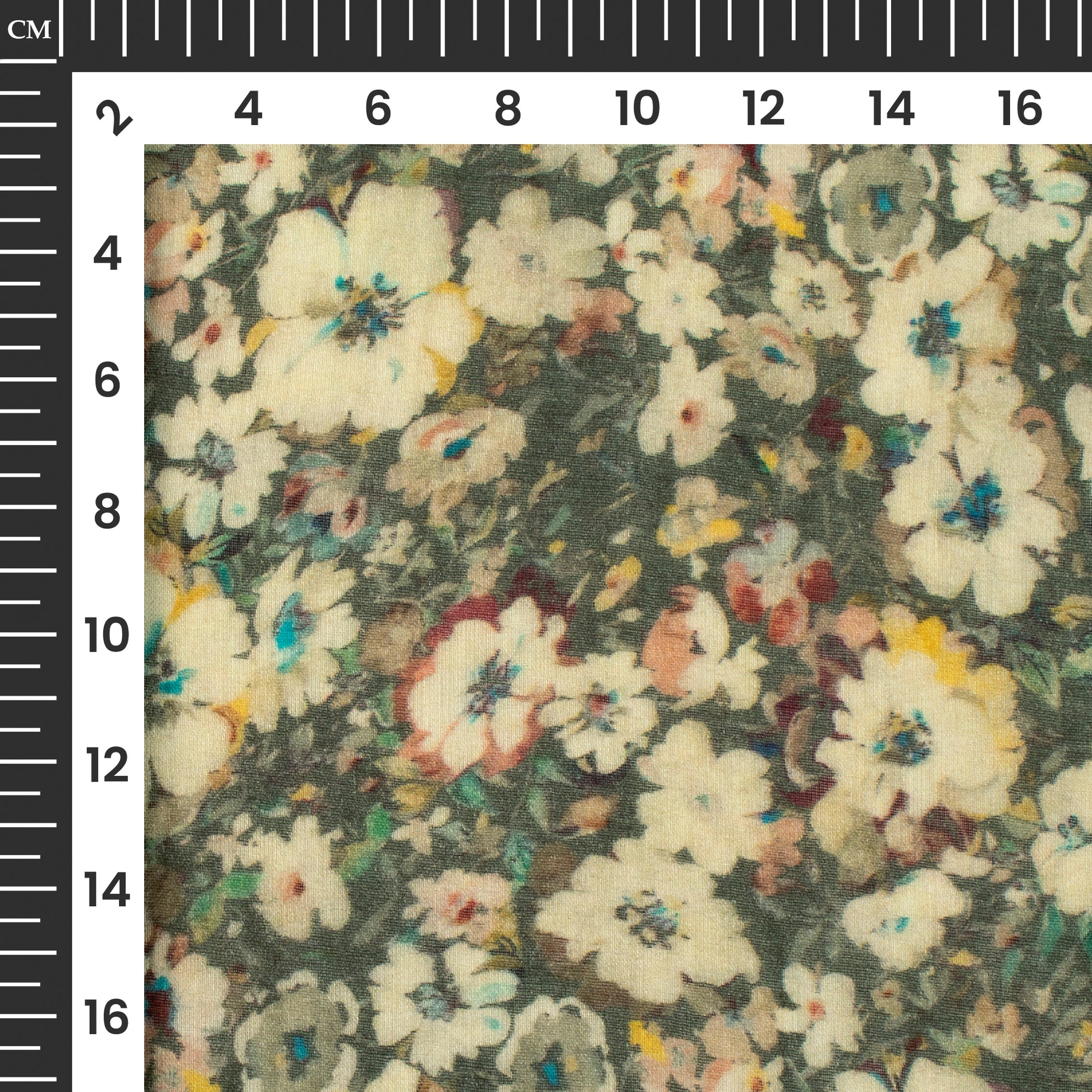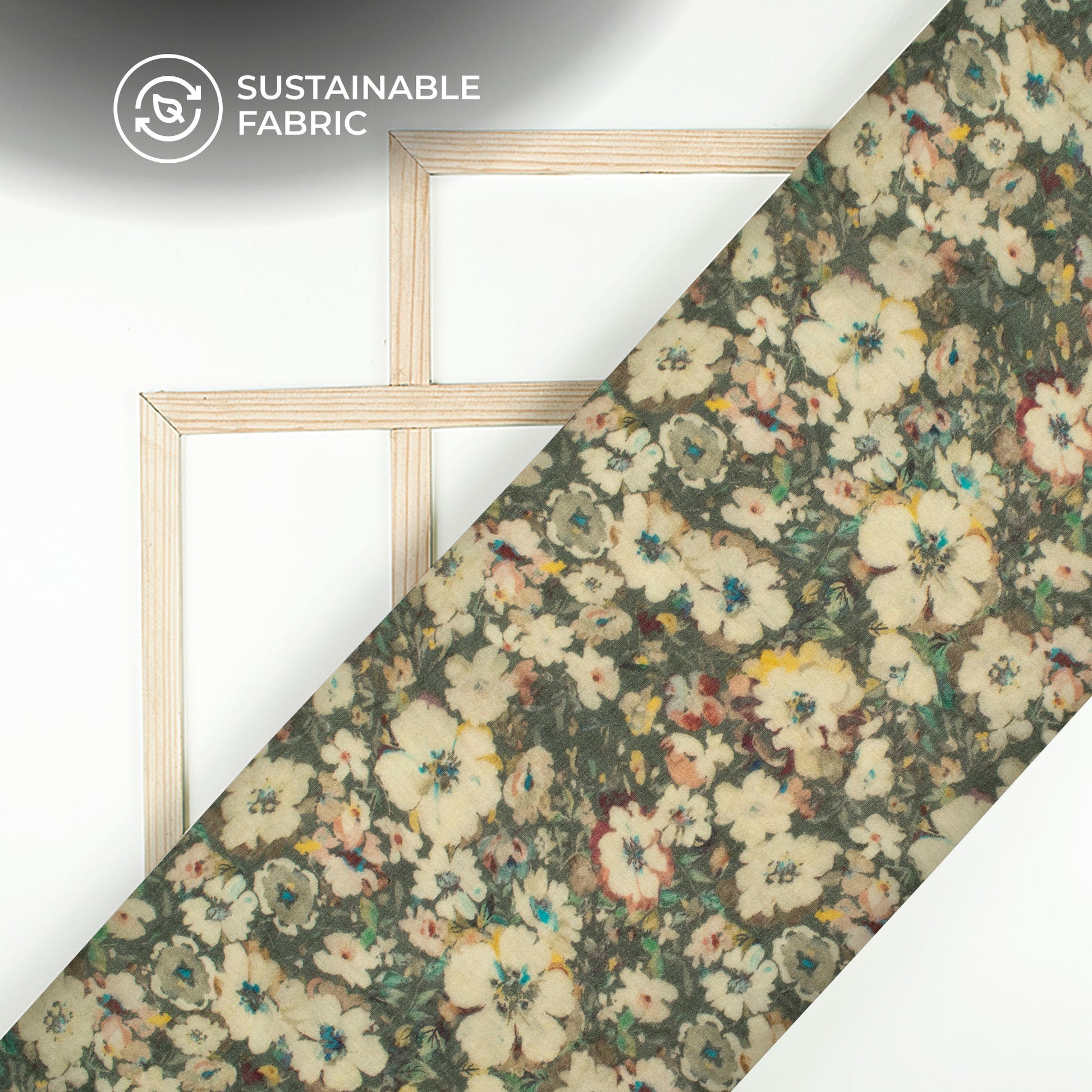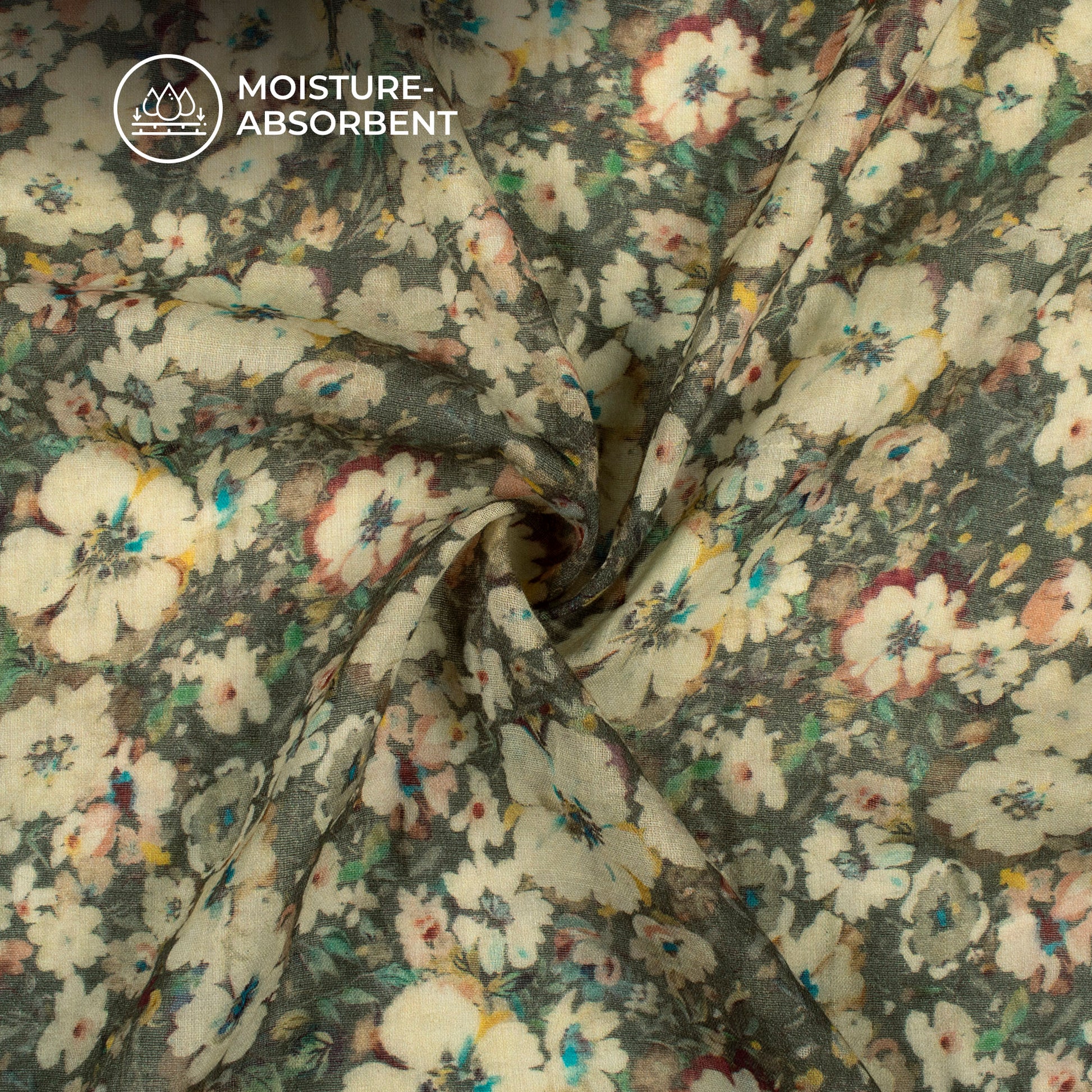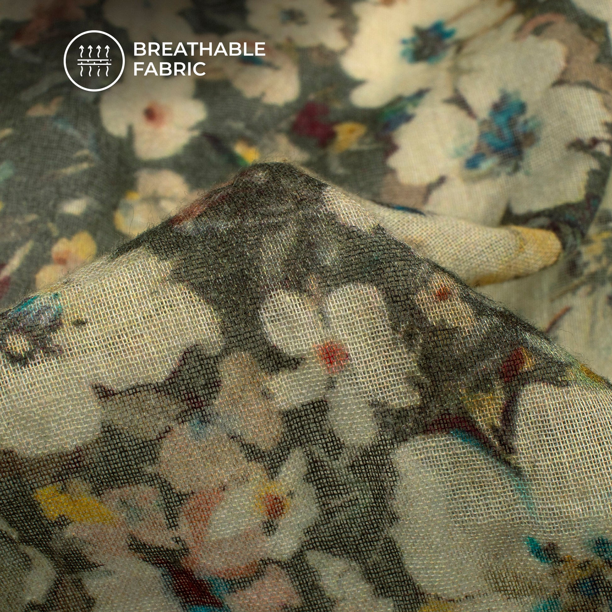 Army Green And Beige Floral Digital Print Pure Cotton Mulmul Fabric