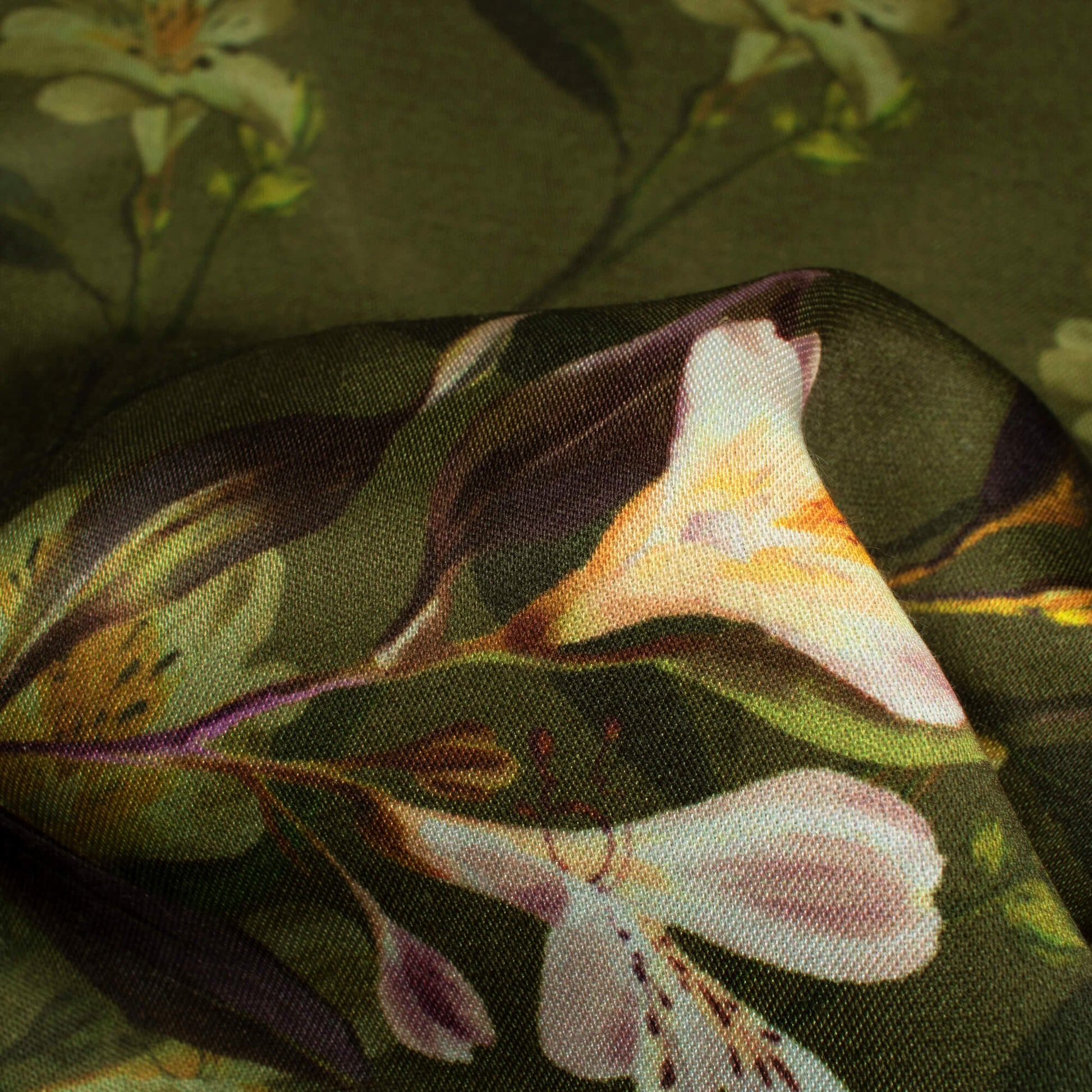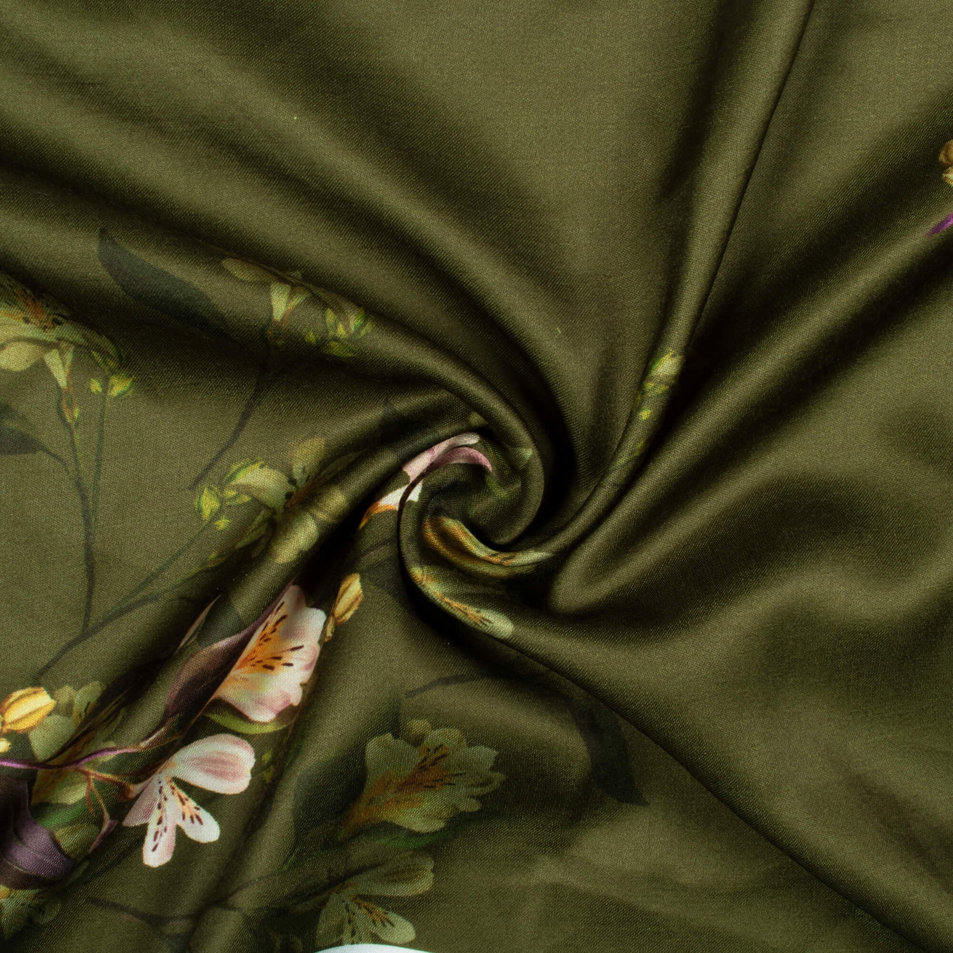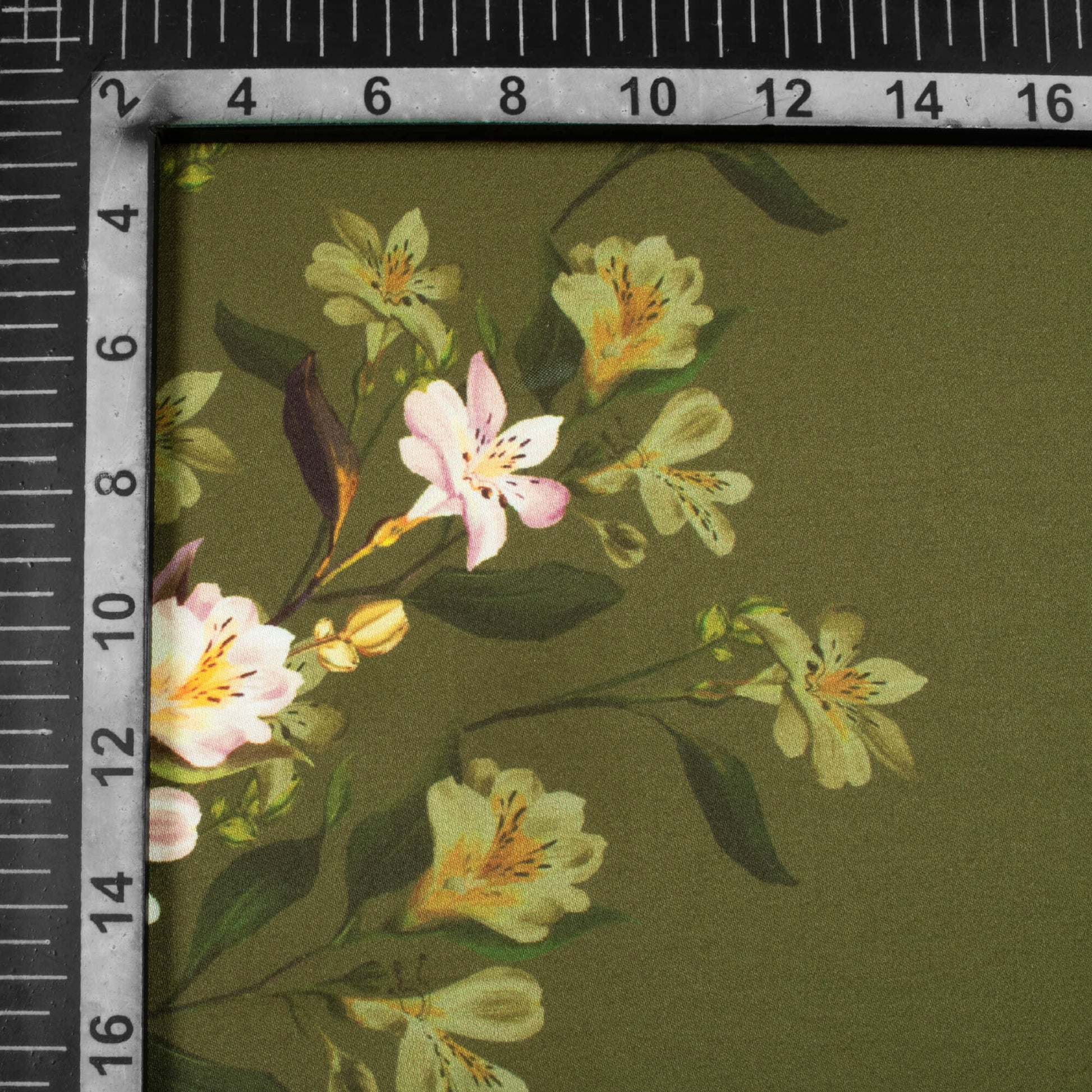 Army Green And White Floral Pattern Digital Print Premium Lush Satin Fabric