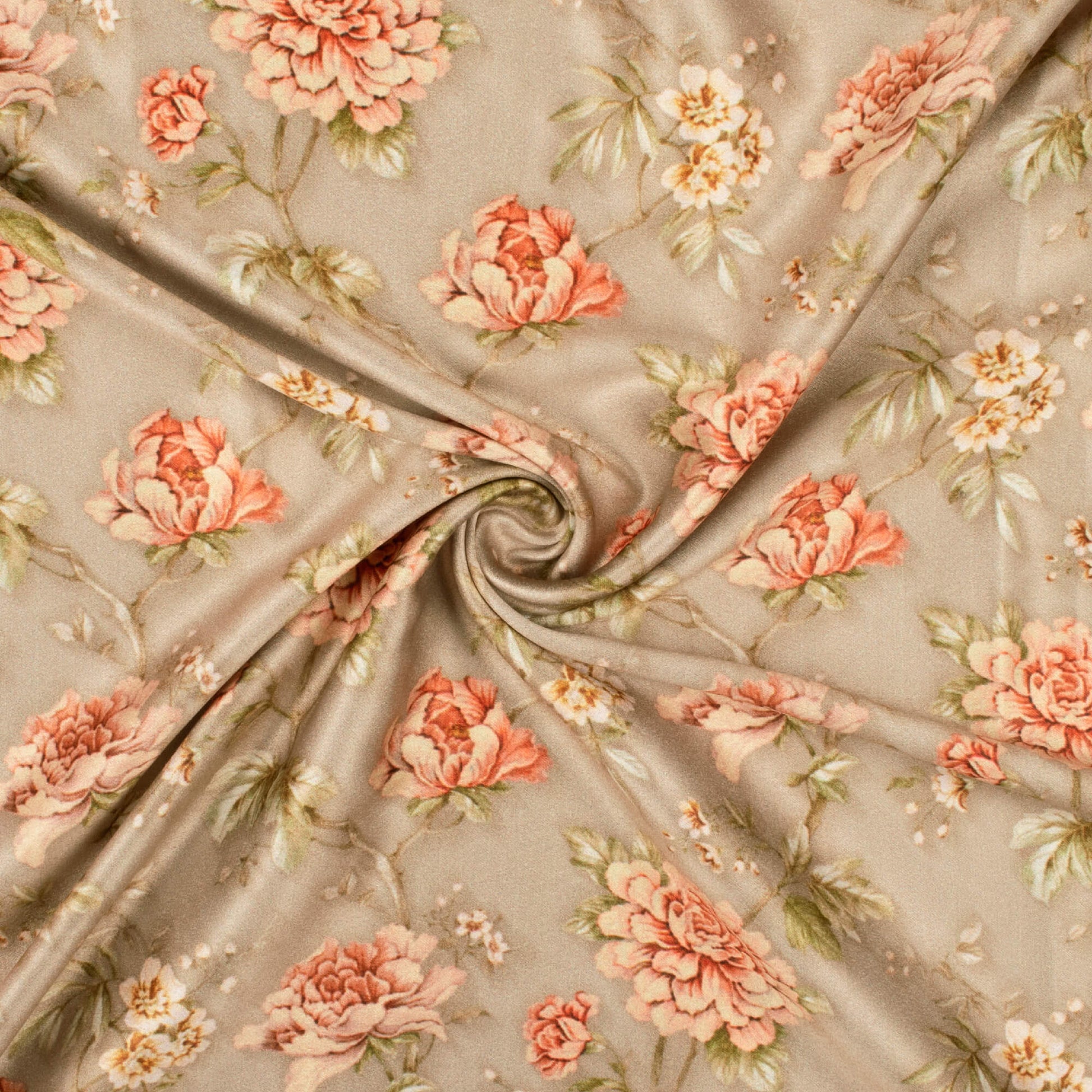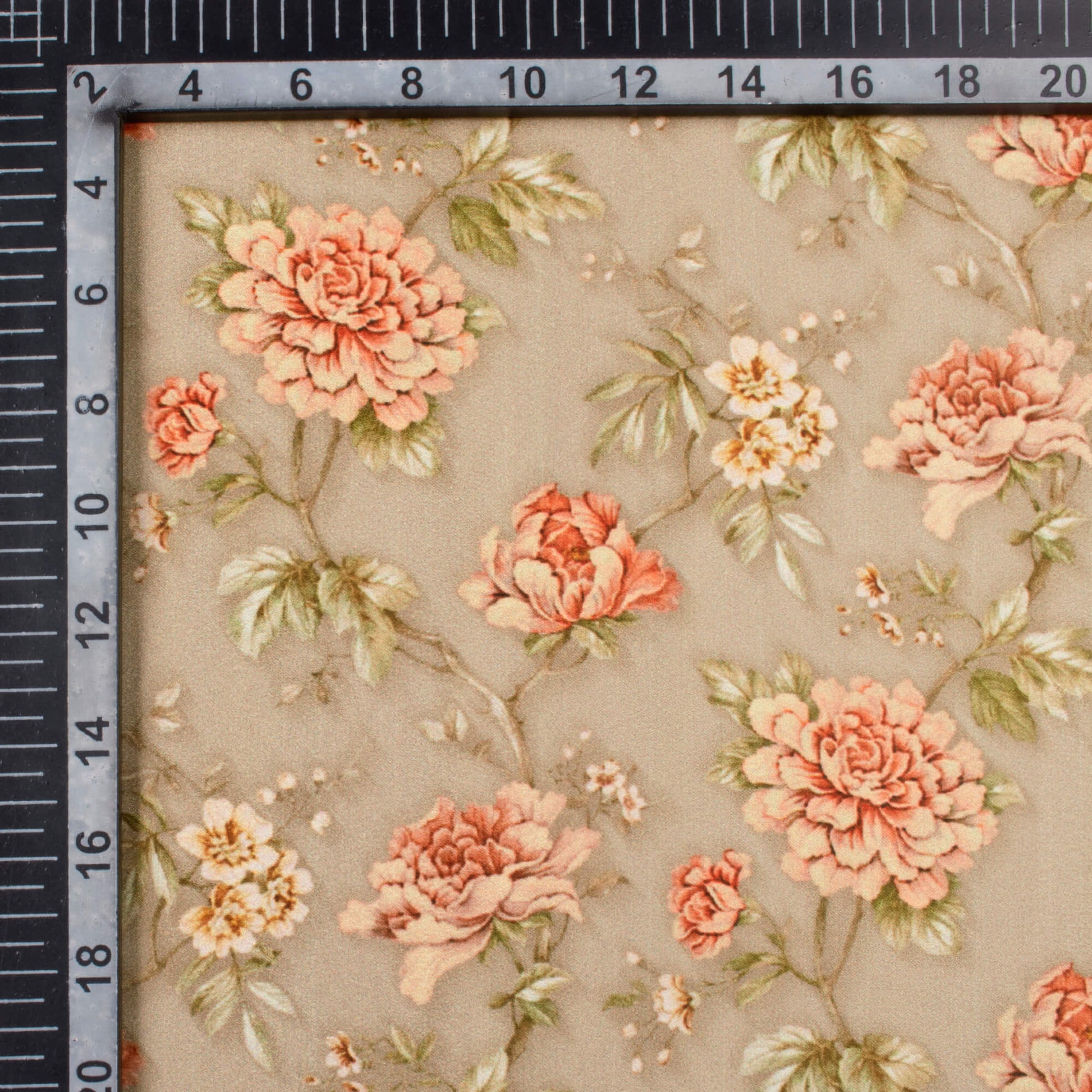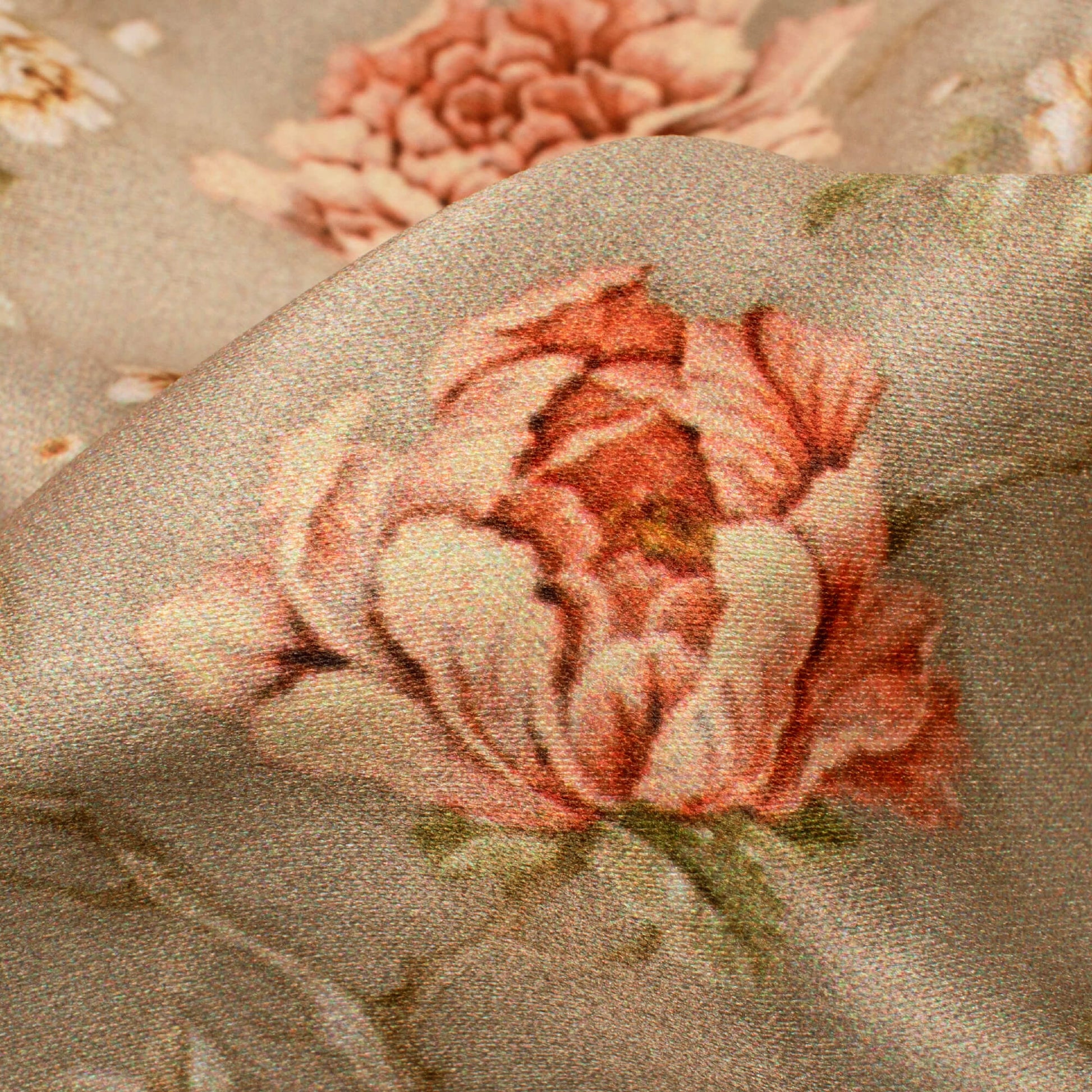 Artichoke Green And Peach Floral Pattern Digital Print Lush Satin Fabric