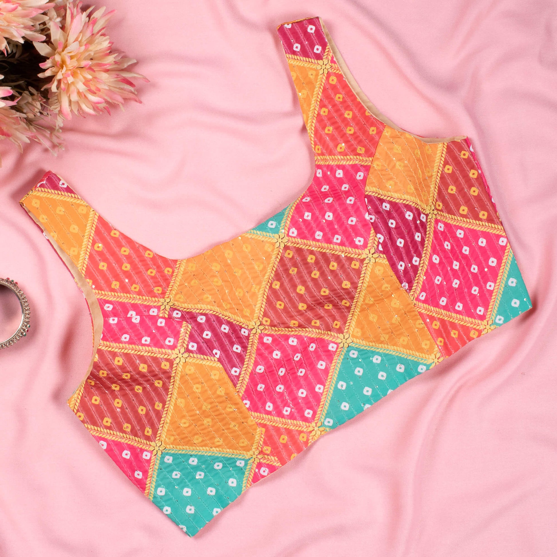 Georgette with Bandhani Craft embedded with sequins printing is flawless. It features a back-hook, a U-neckline, and is sleeveless. Cotton is draped easily and has a good breathing characteristic. Match your preferred saree with this blouse and mark an impression on any occasion or even regular days. Available in pad/without pad.