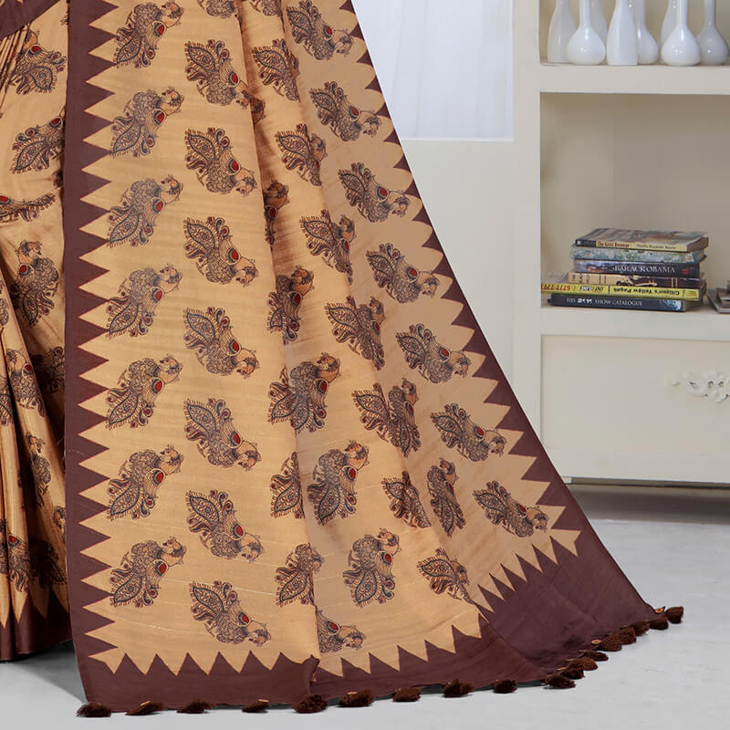 Beige And Dark Brown Kalamkrii Pattern Digital Printed Art Tussar Silk Saree With Tassels