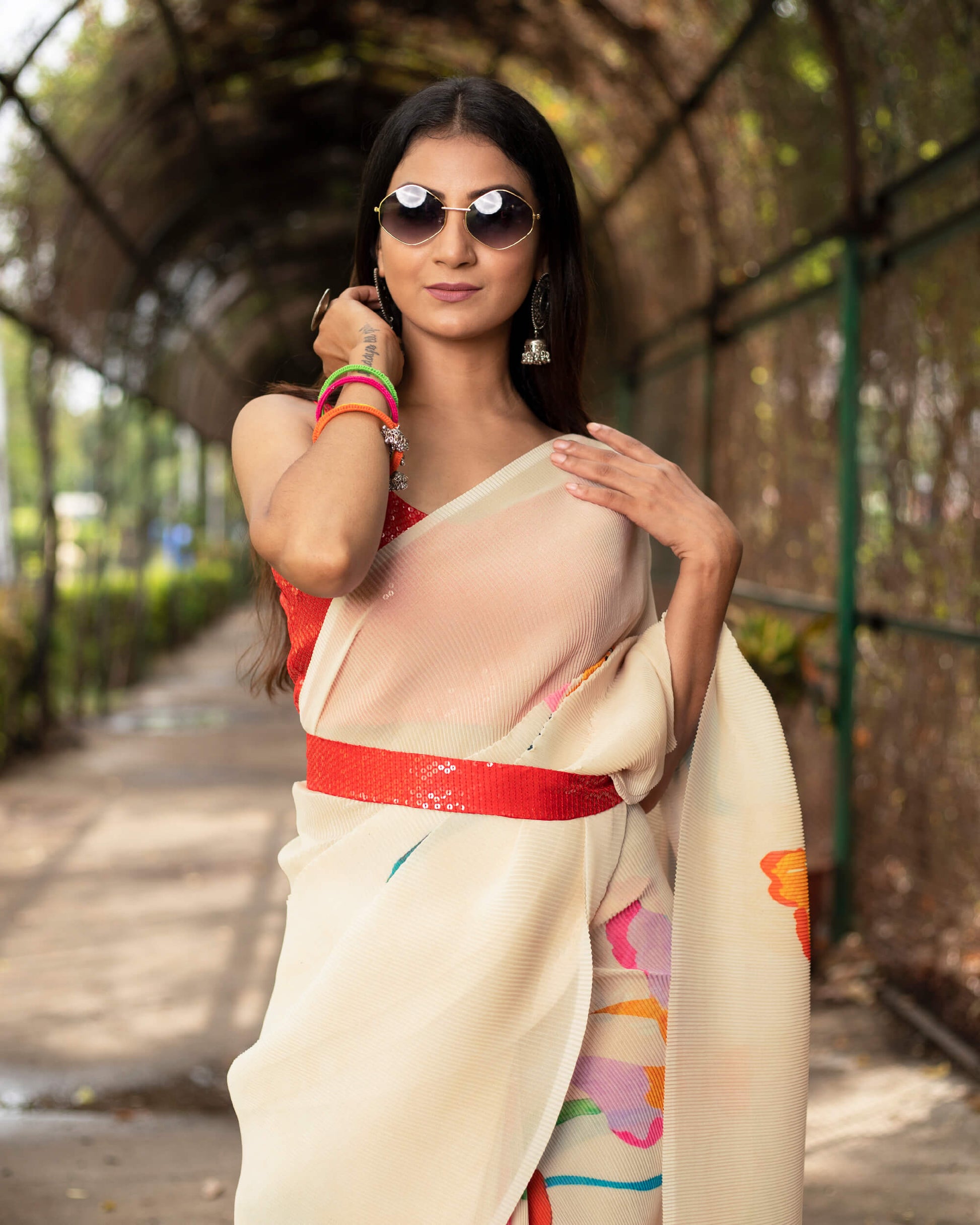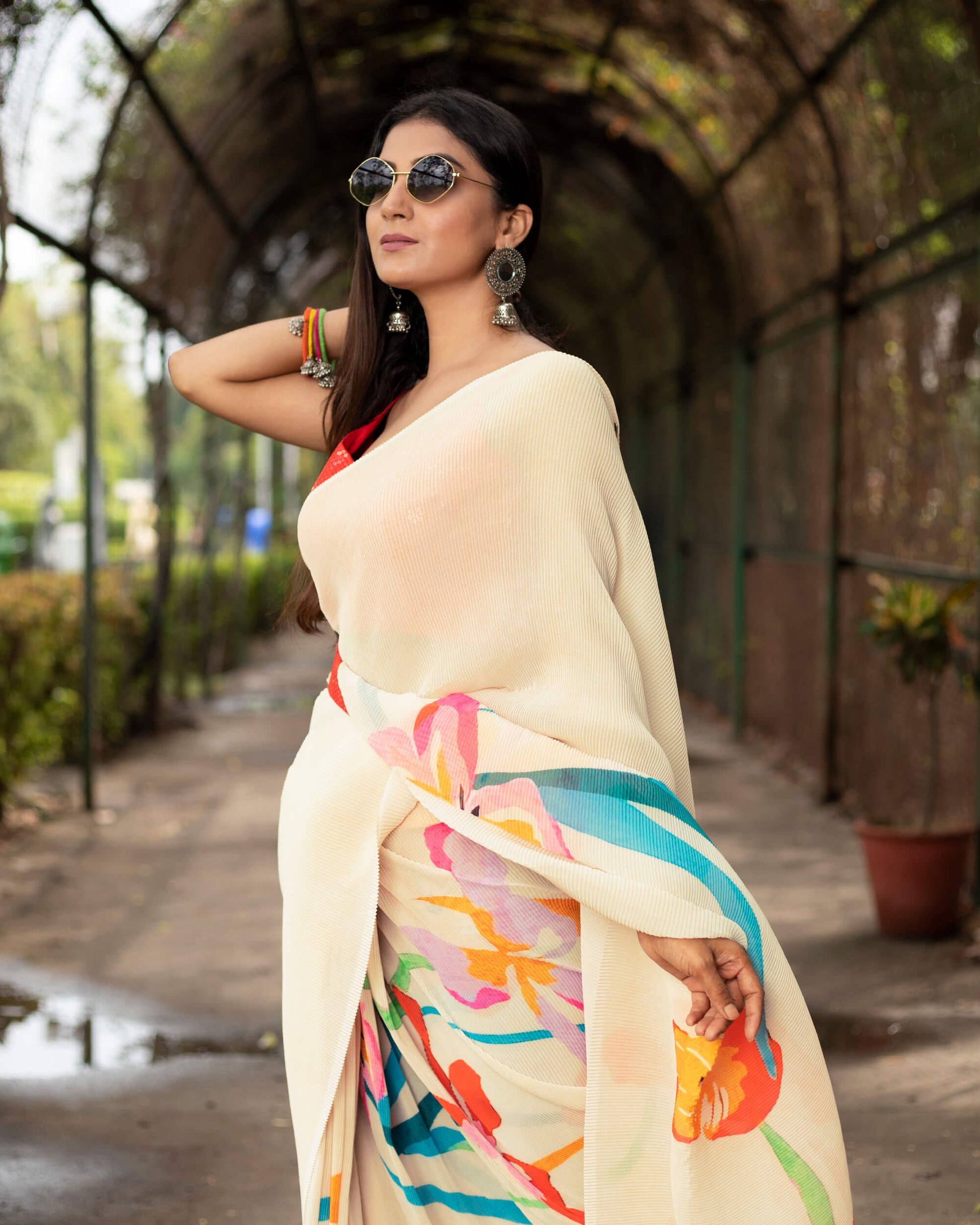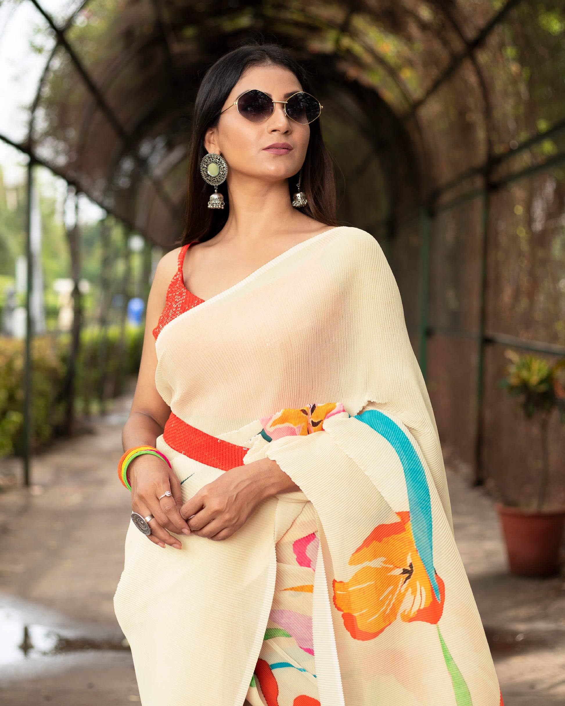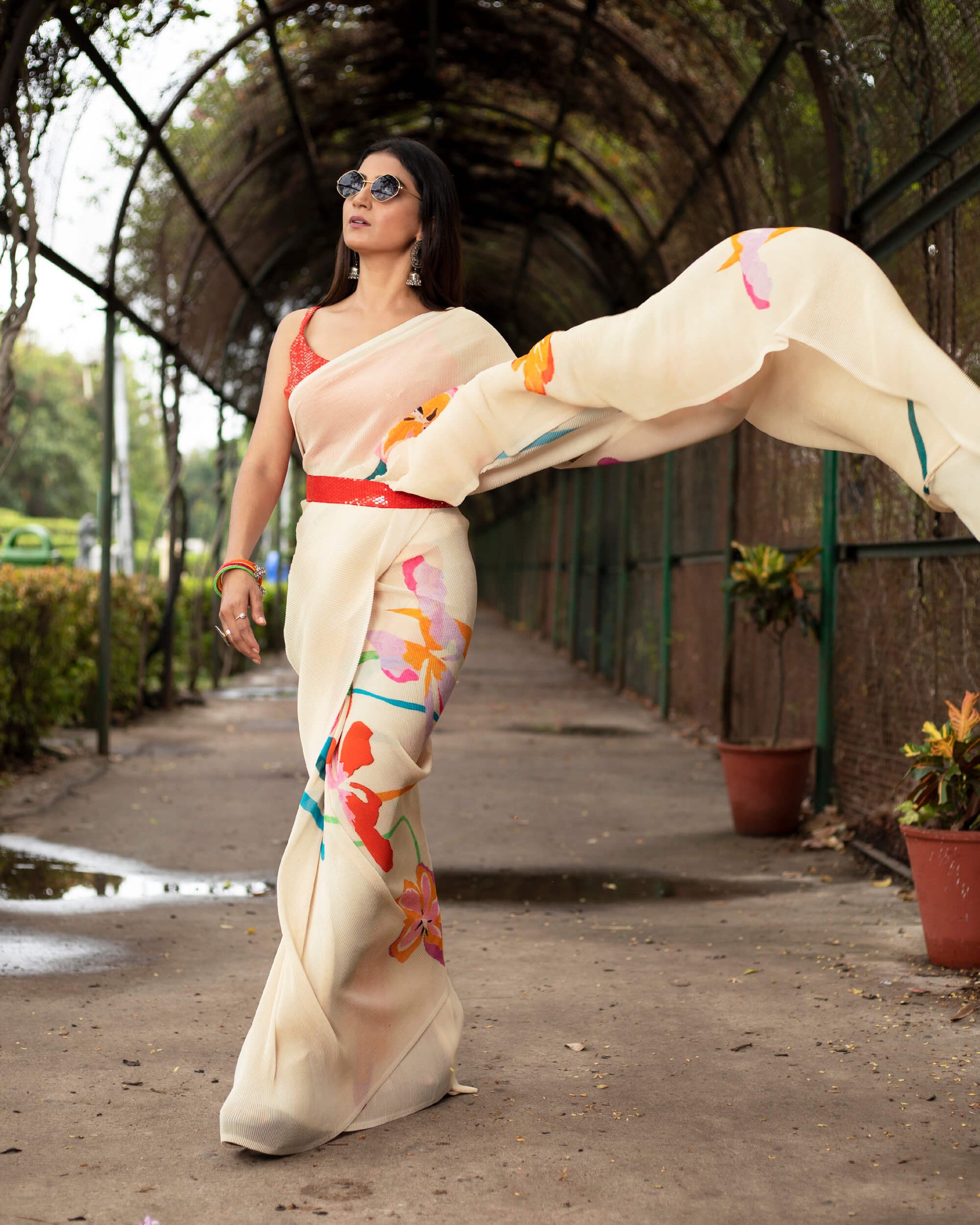 Beige And Red Floral Pattern Digital Print Georgette Pleated Saree
