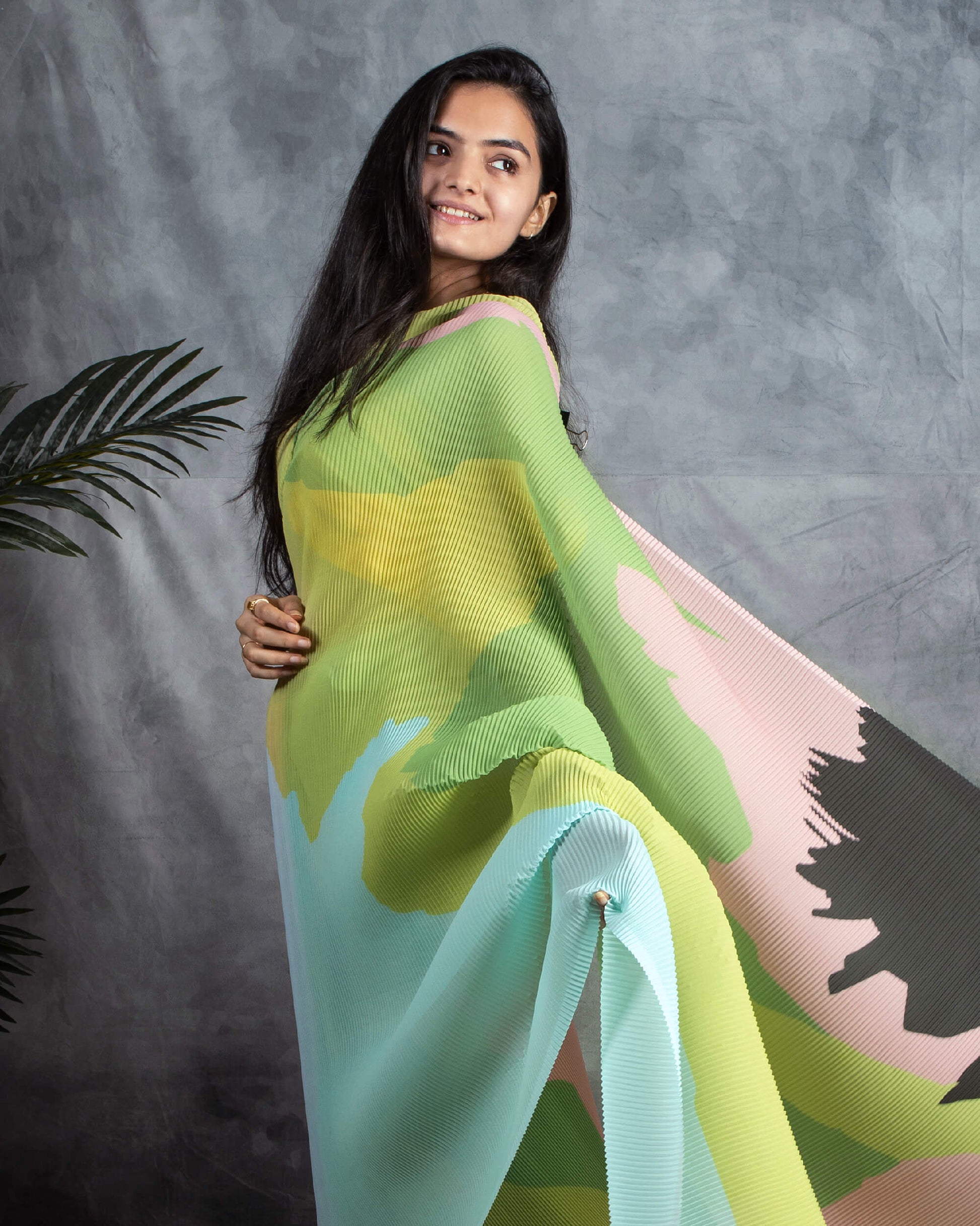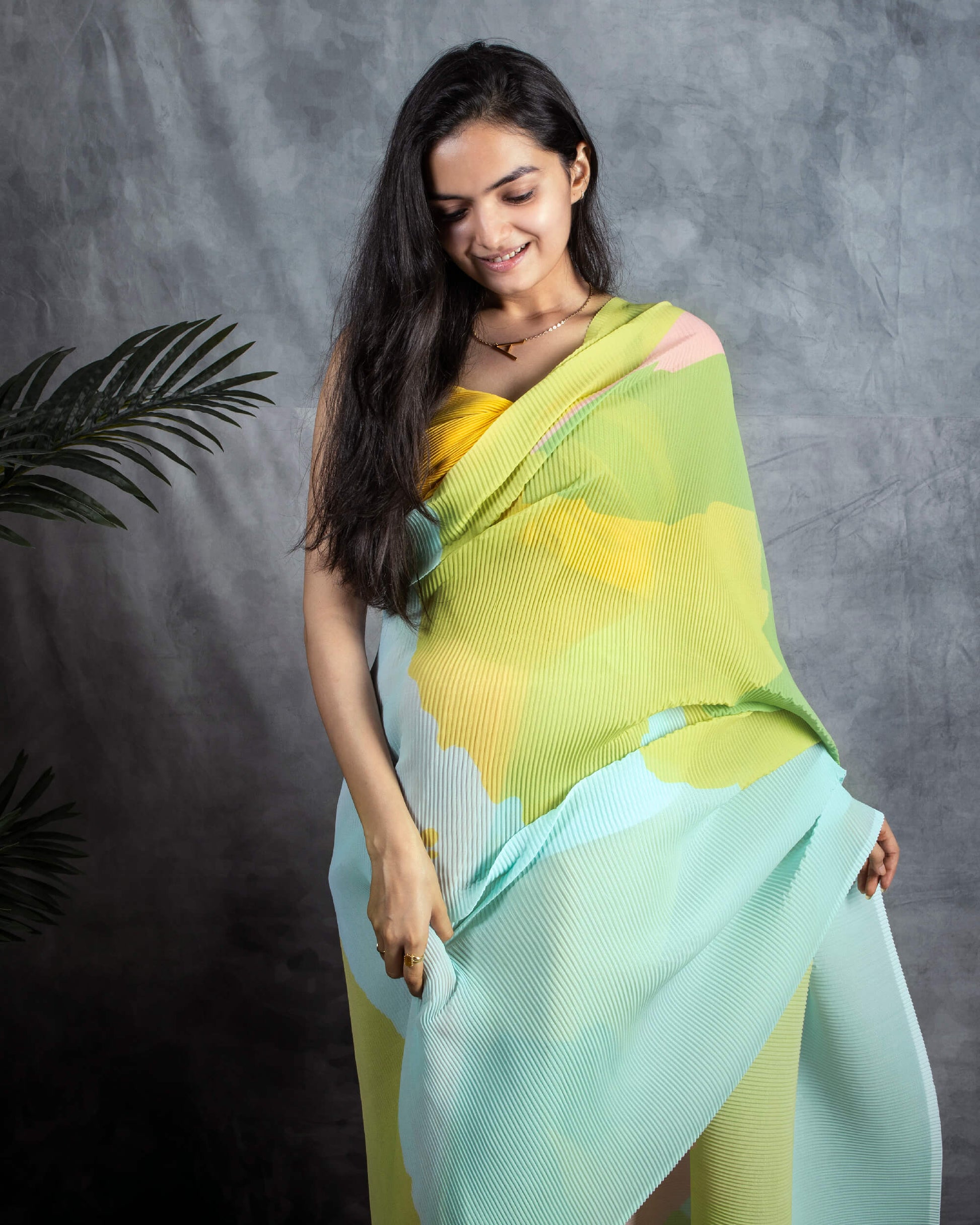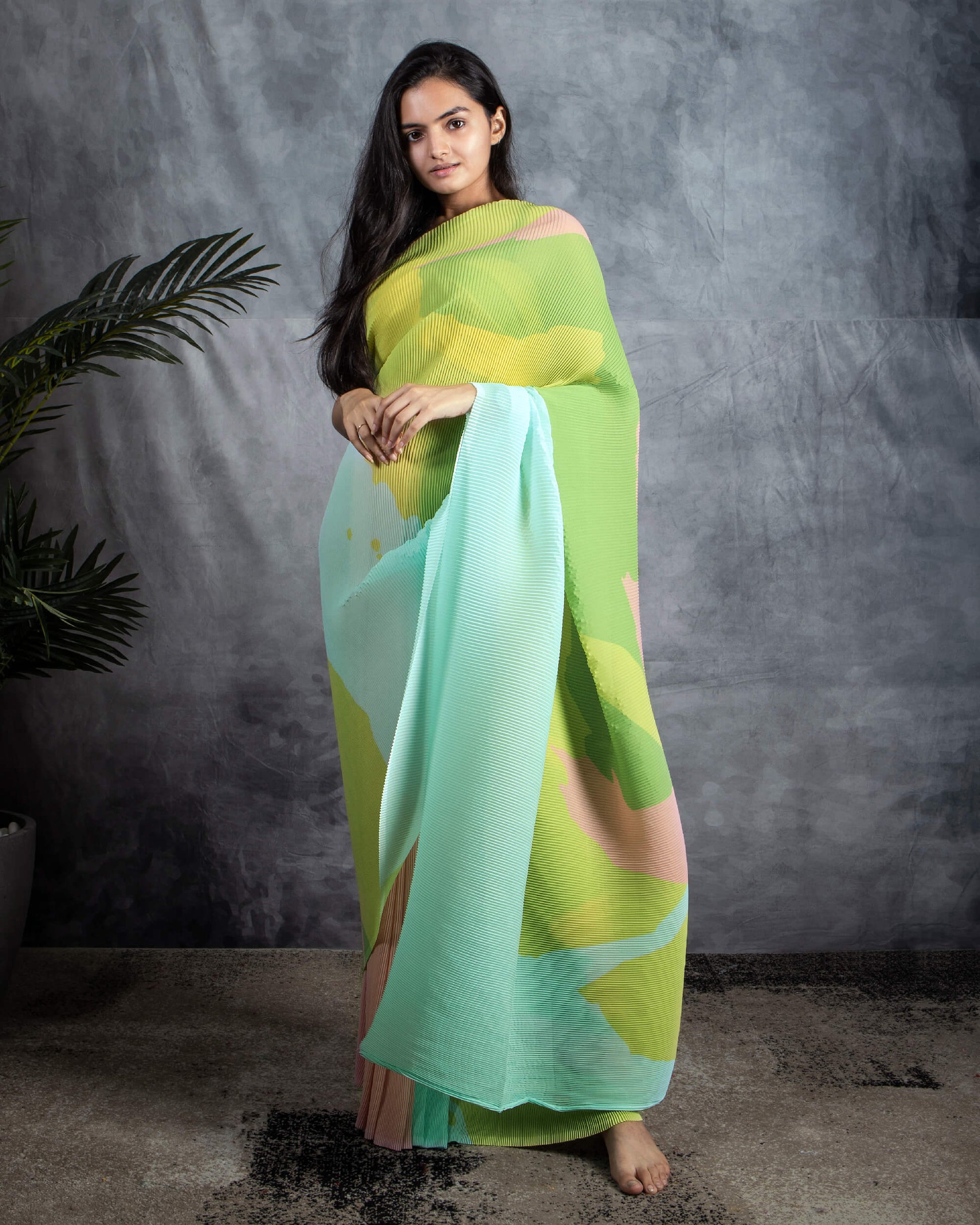 Mint Green And Yellow Abstract Pattern Digital Print Georgette Pleated Saree