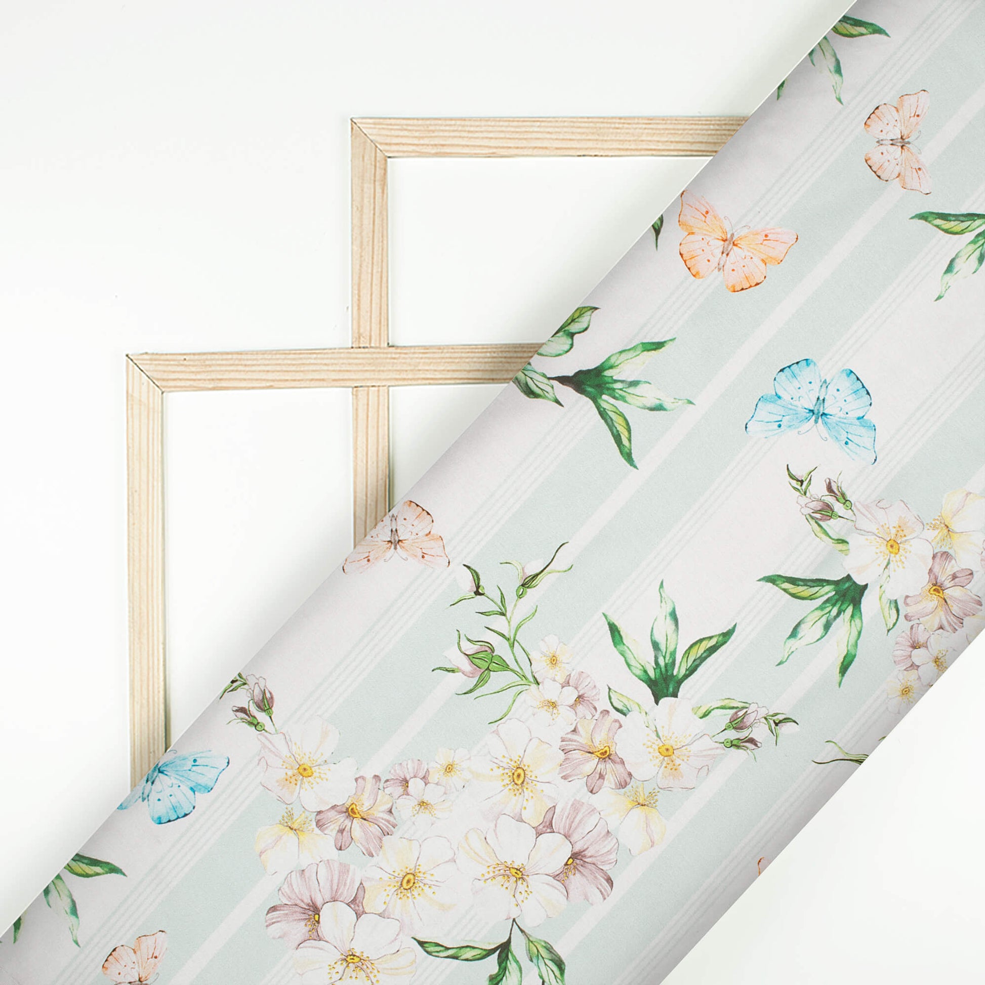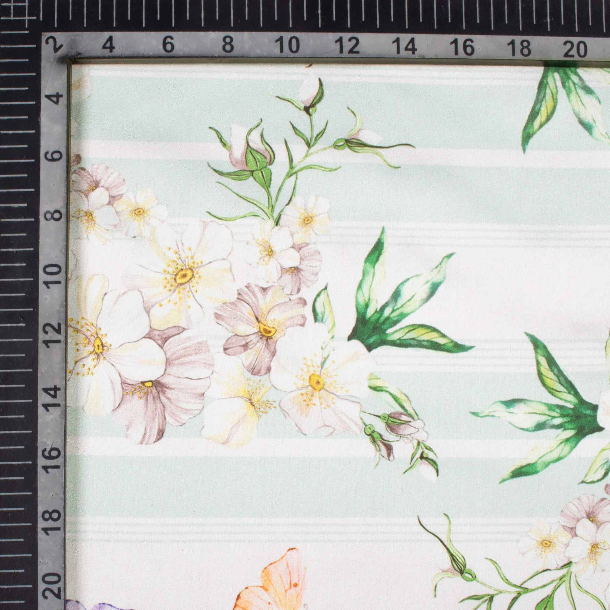 White And Pastel Green Floral Pattern Digital Print Japan Satin Fabric