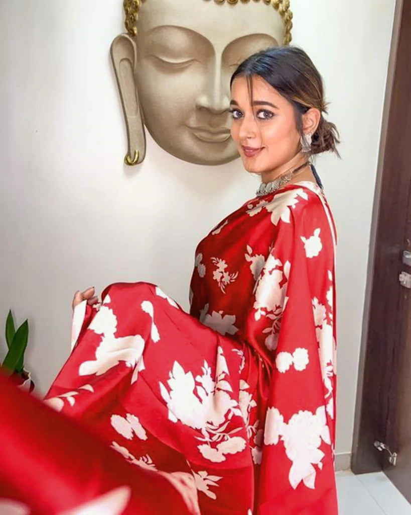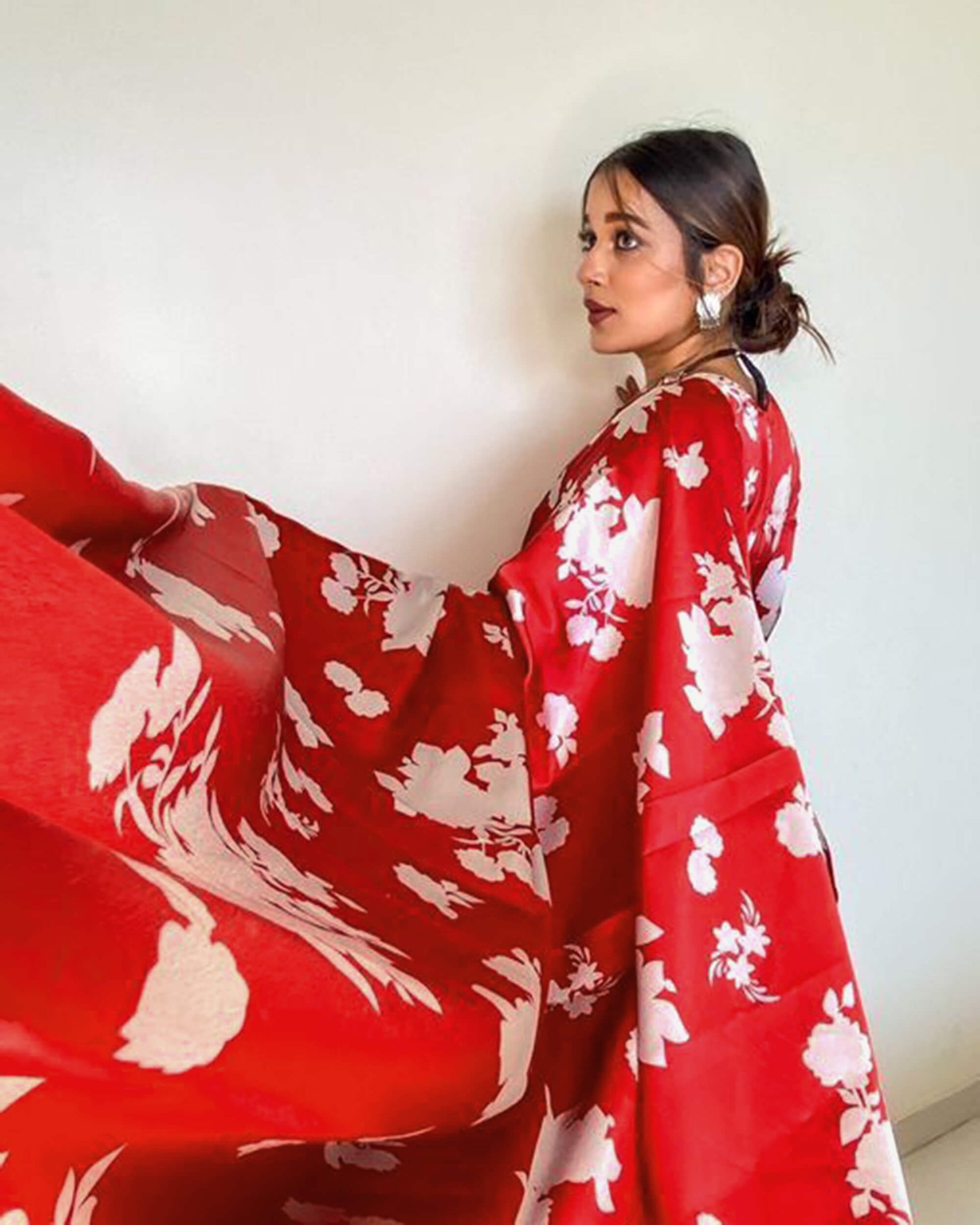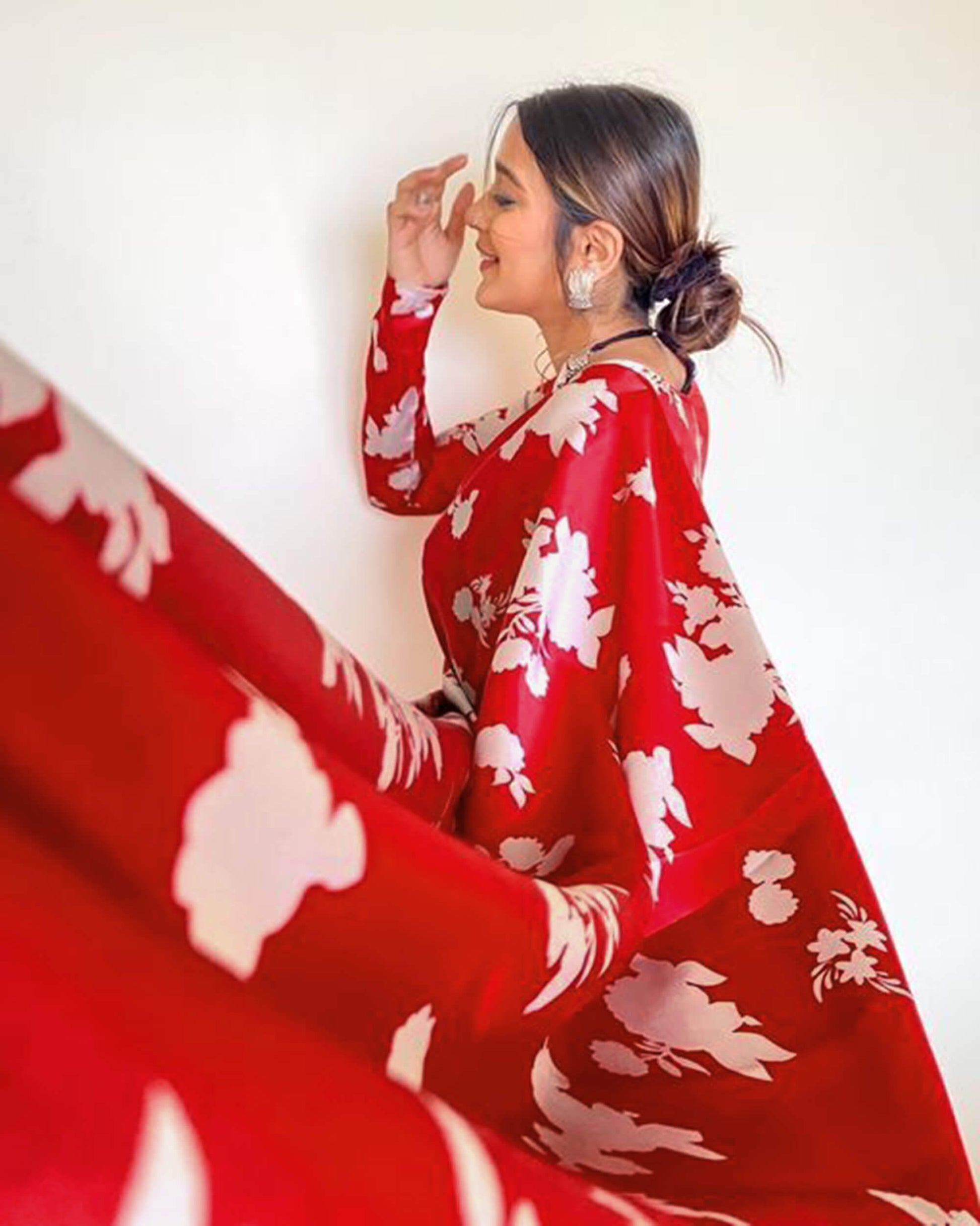Vermilion Red And Pearl Grey Floral Pattern Digital Print Japan Satin Saree