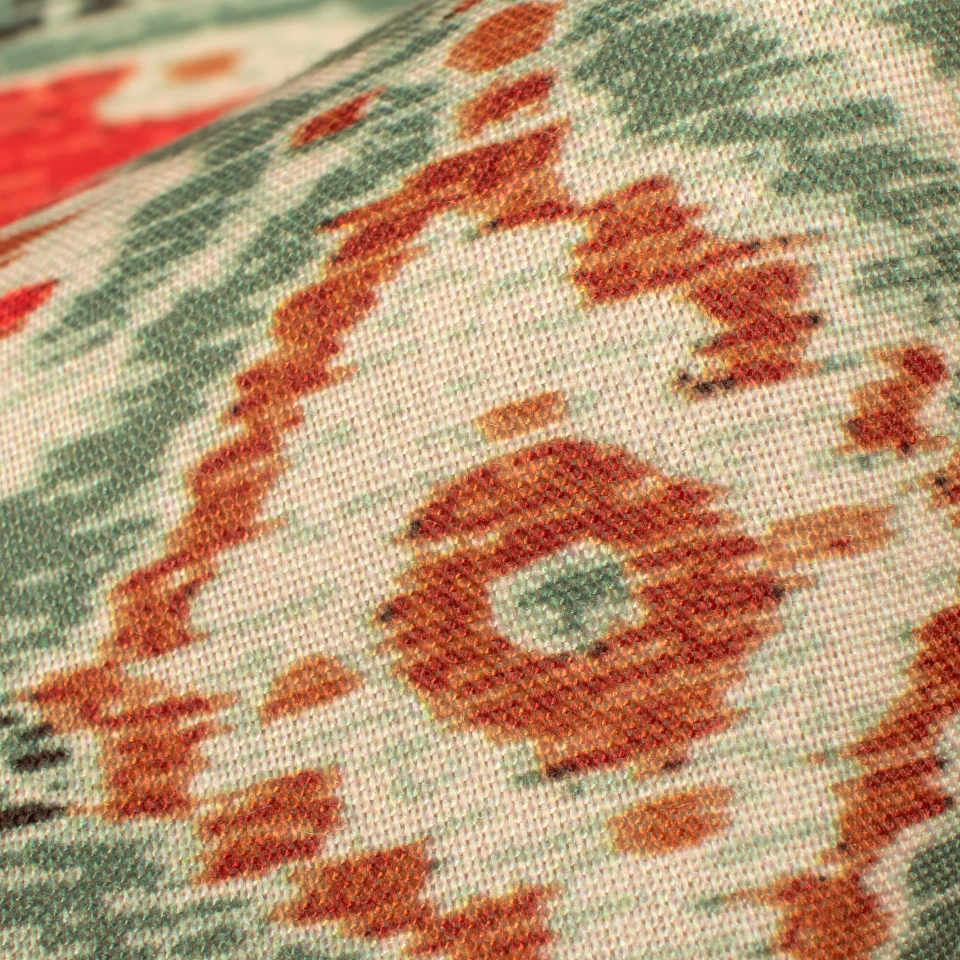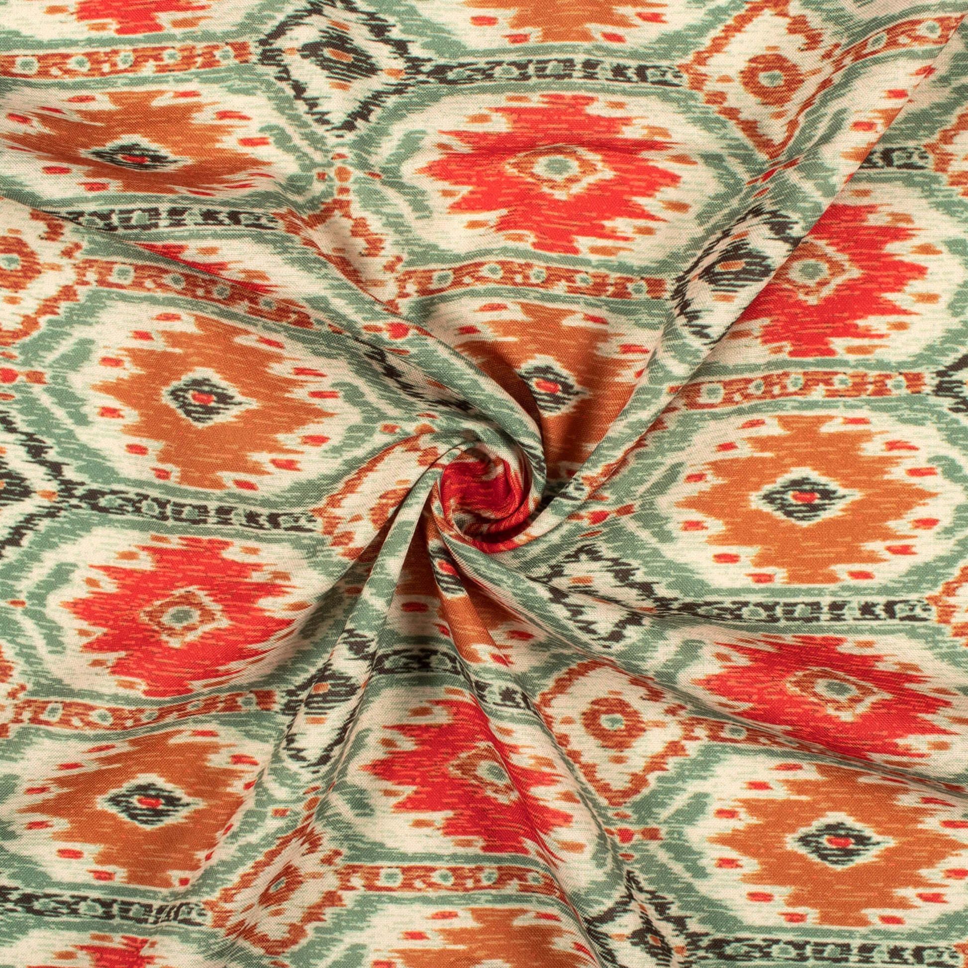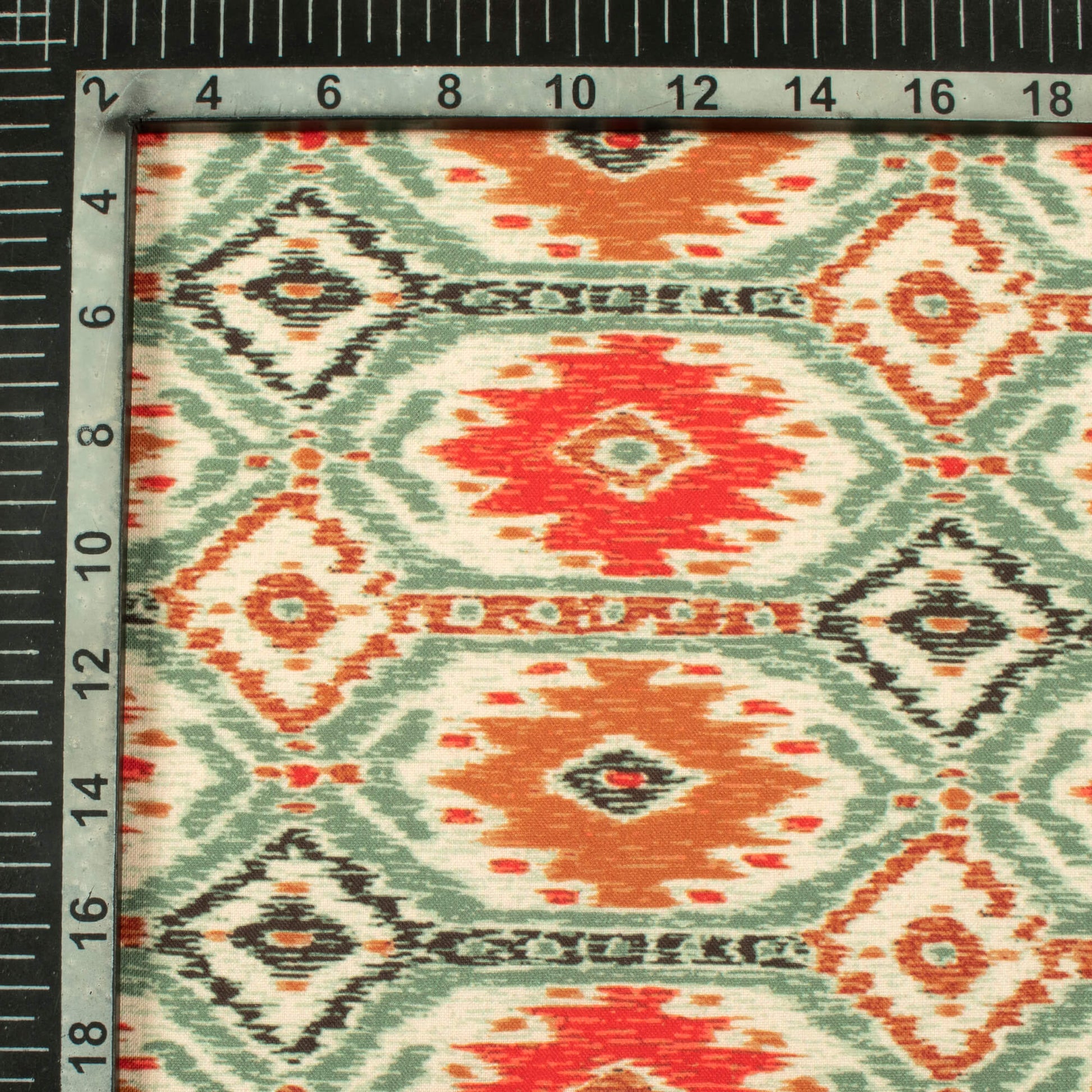 Viridian Green And Red Traditional Pattern Digital Print Rayon Fabric