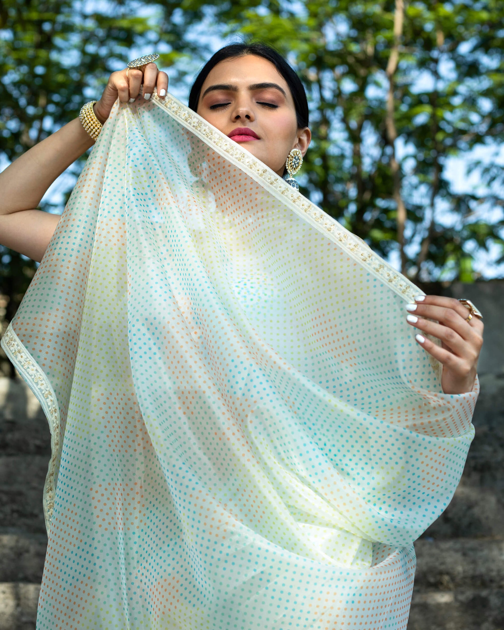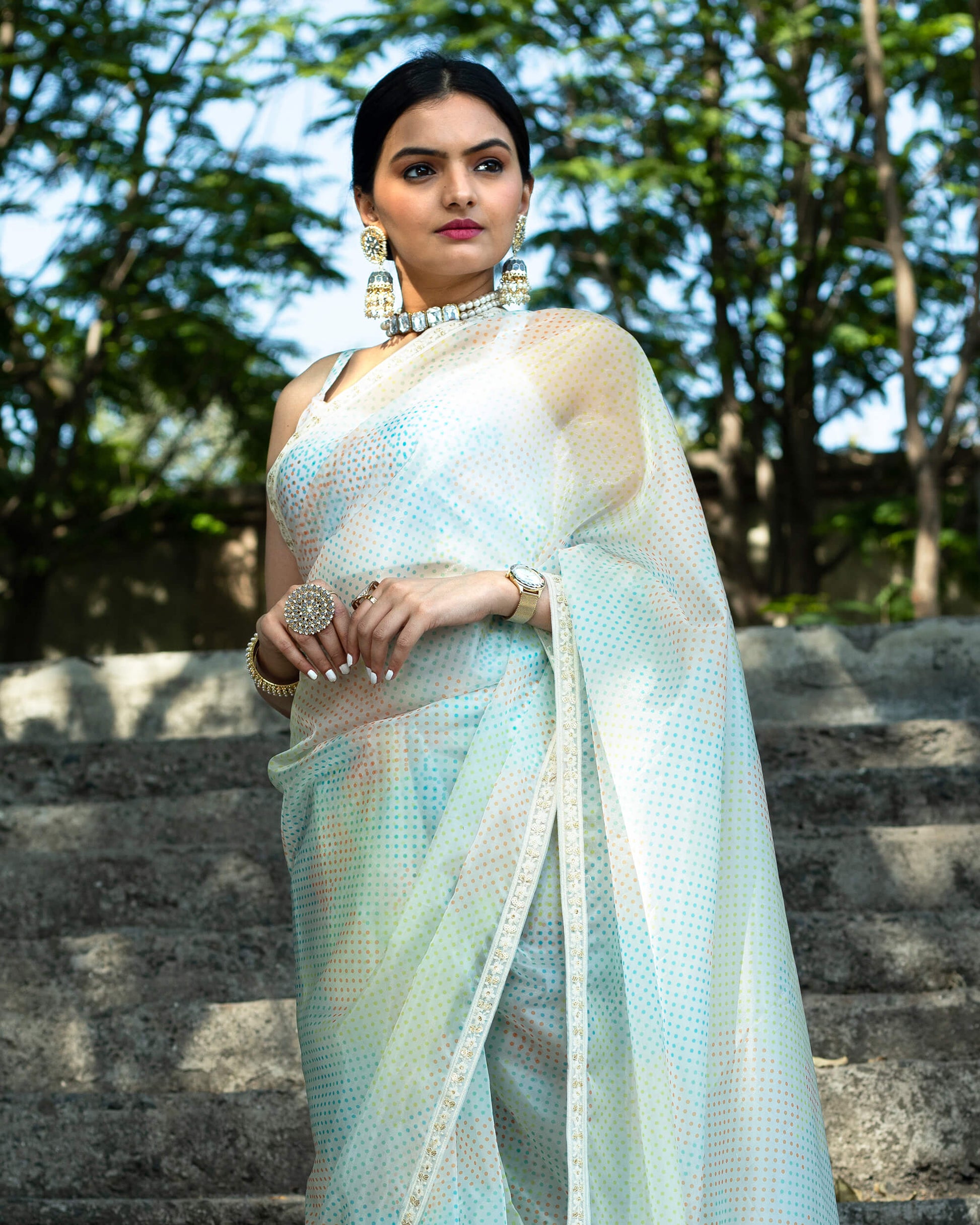 White And Blue Polka Dots Pattern Digtal Print Liquid Organza Saree