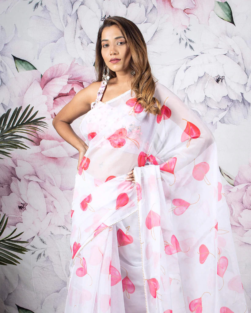 White And Pink Heart Pattern Hand Paint Effect Organza Saree With Pearl Work Lace Border