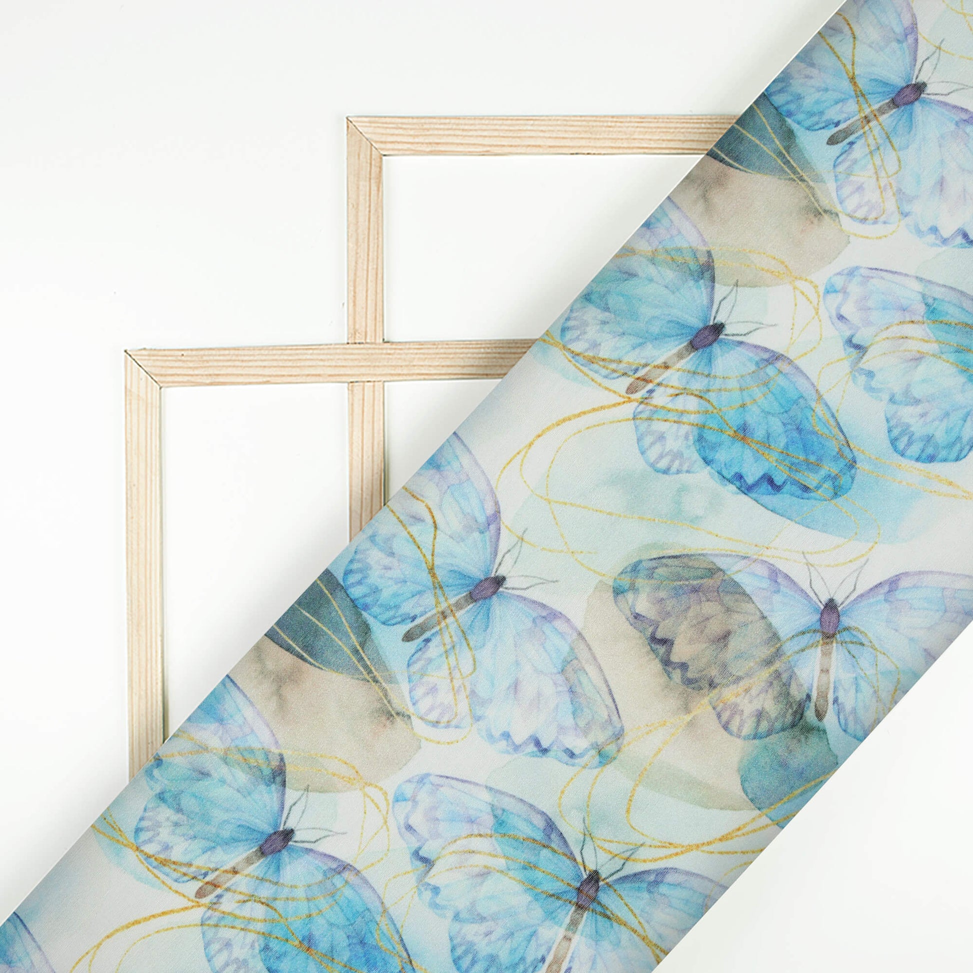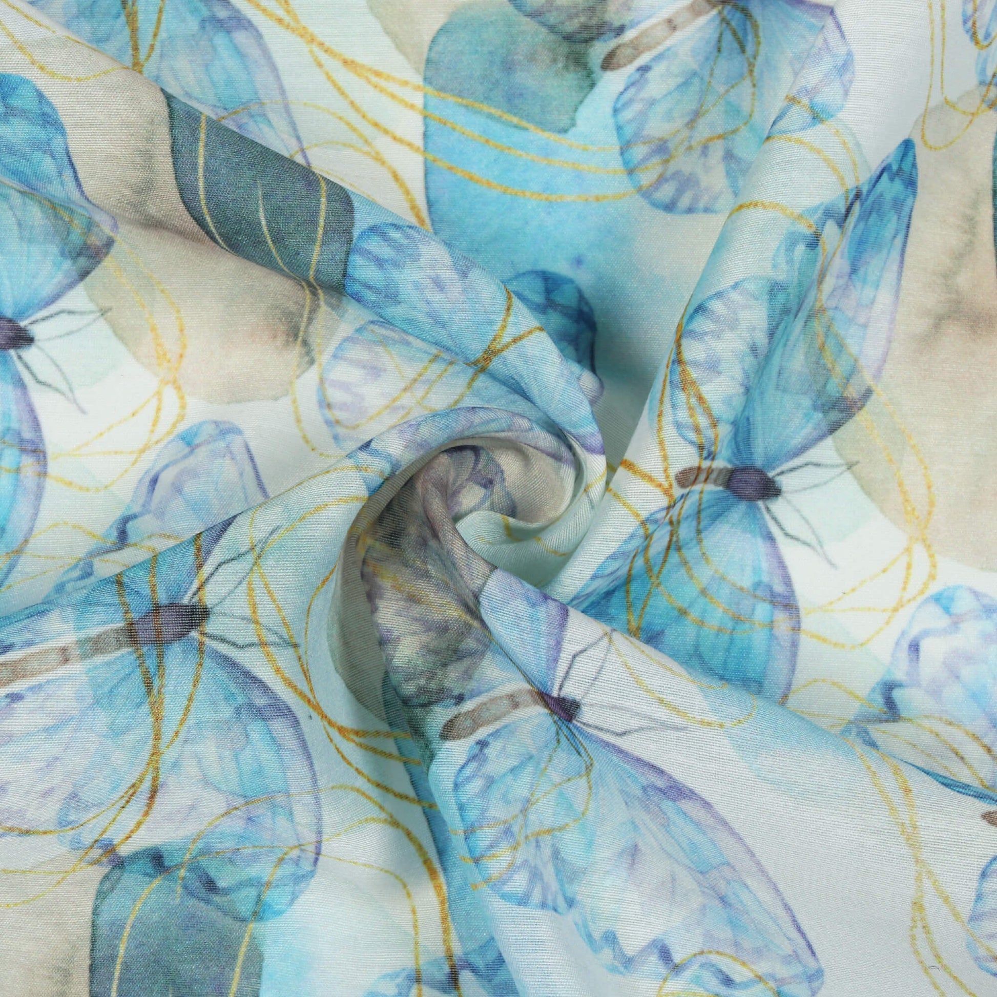 White And Purple Butterfly Pattern Digital Print Chanderi Fabric