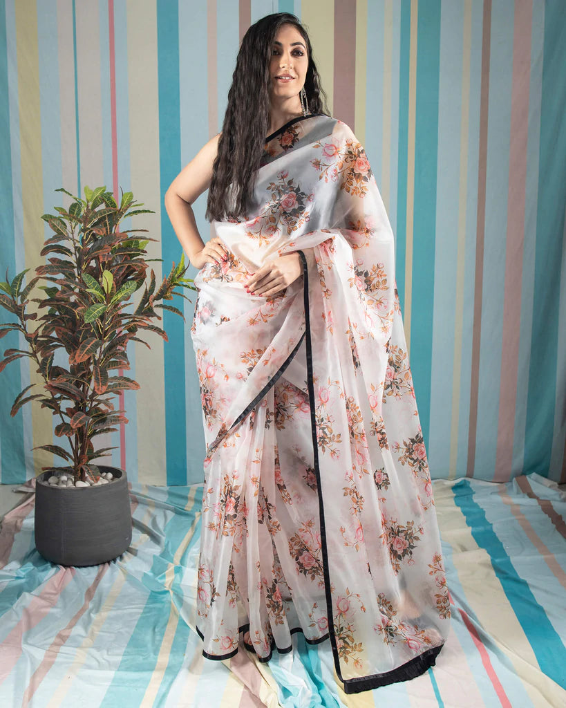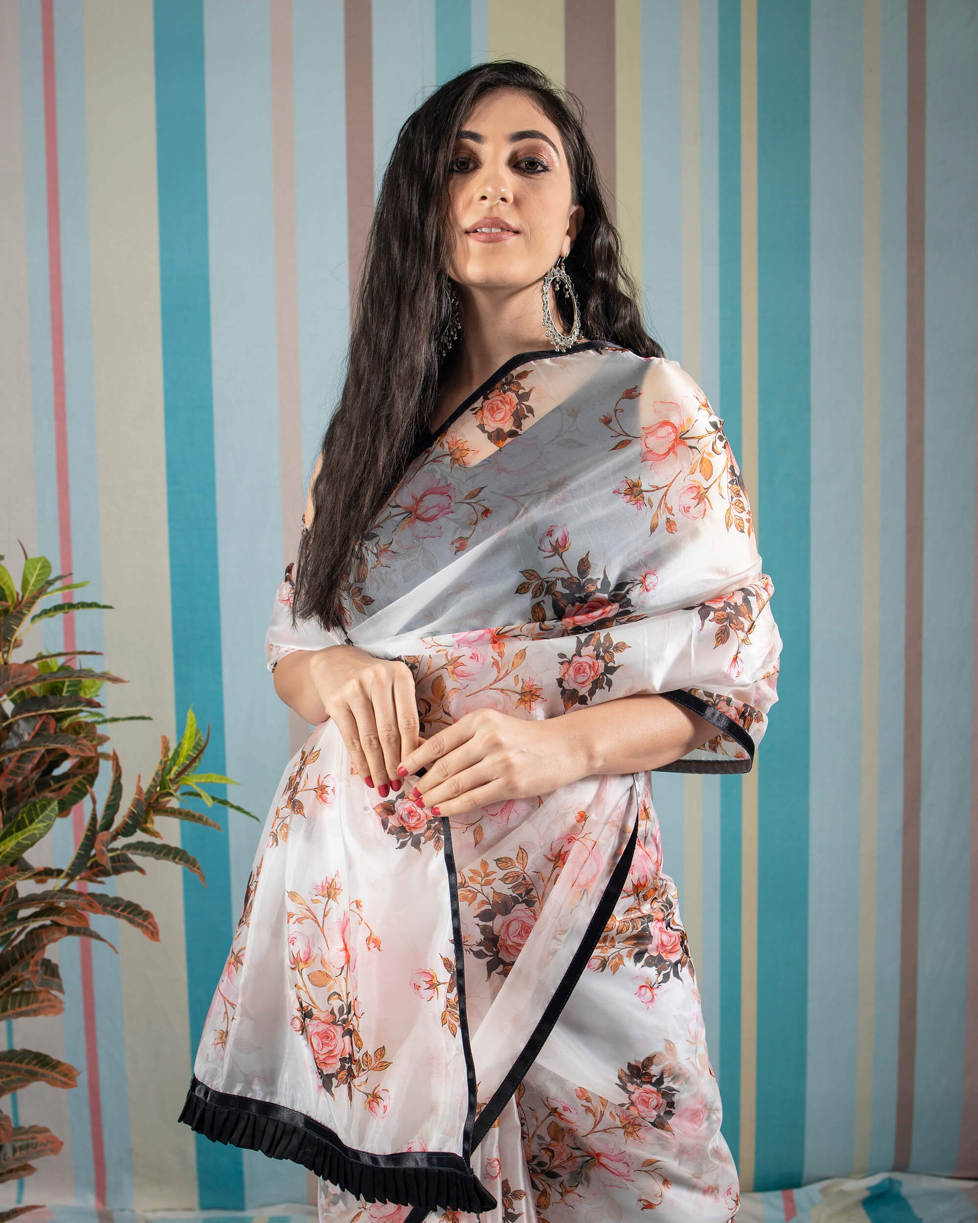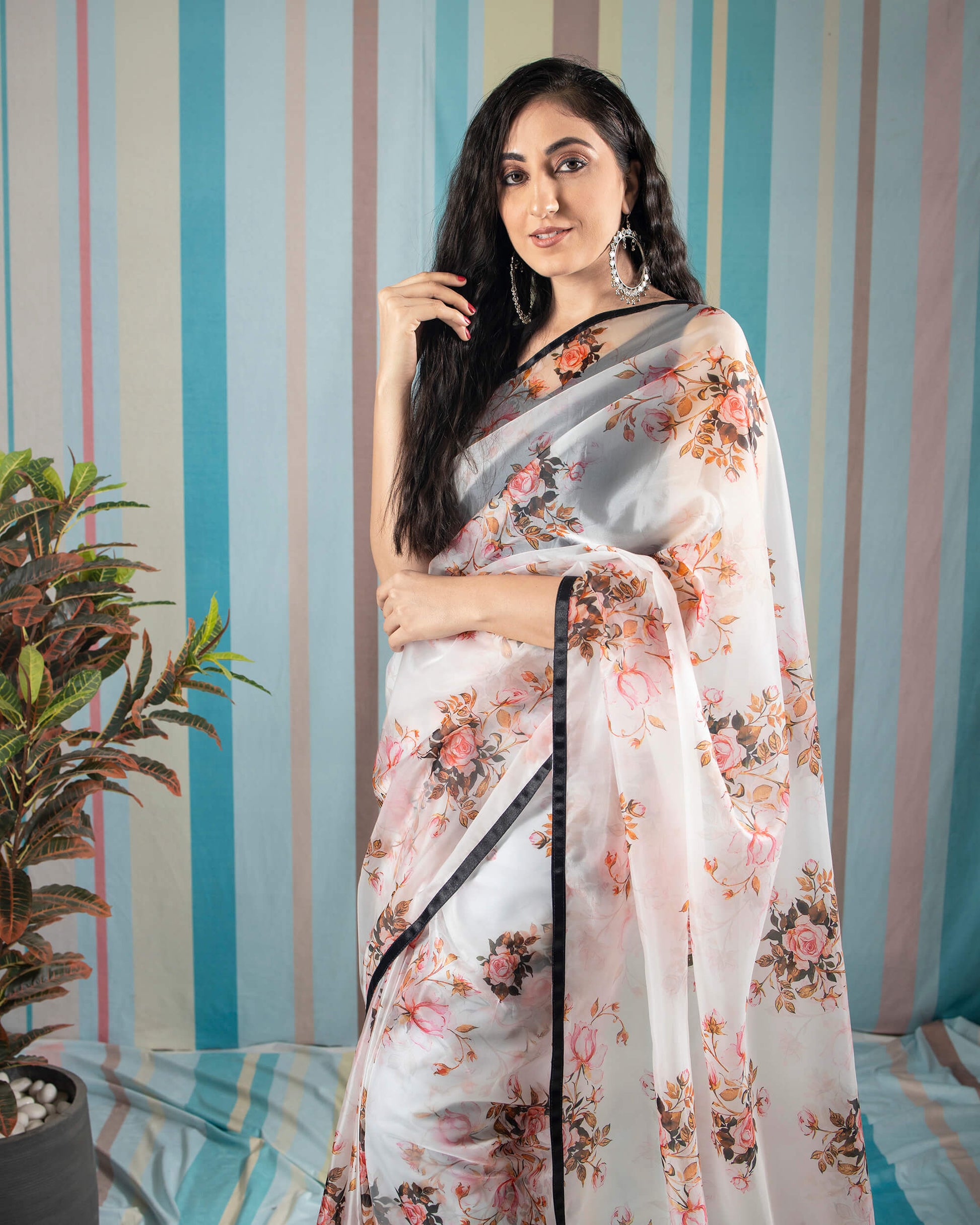White And Taffy Pink Floral Pattern Liquid Organza Saree With Satin Border