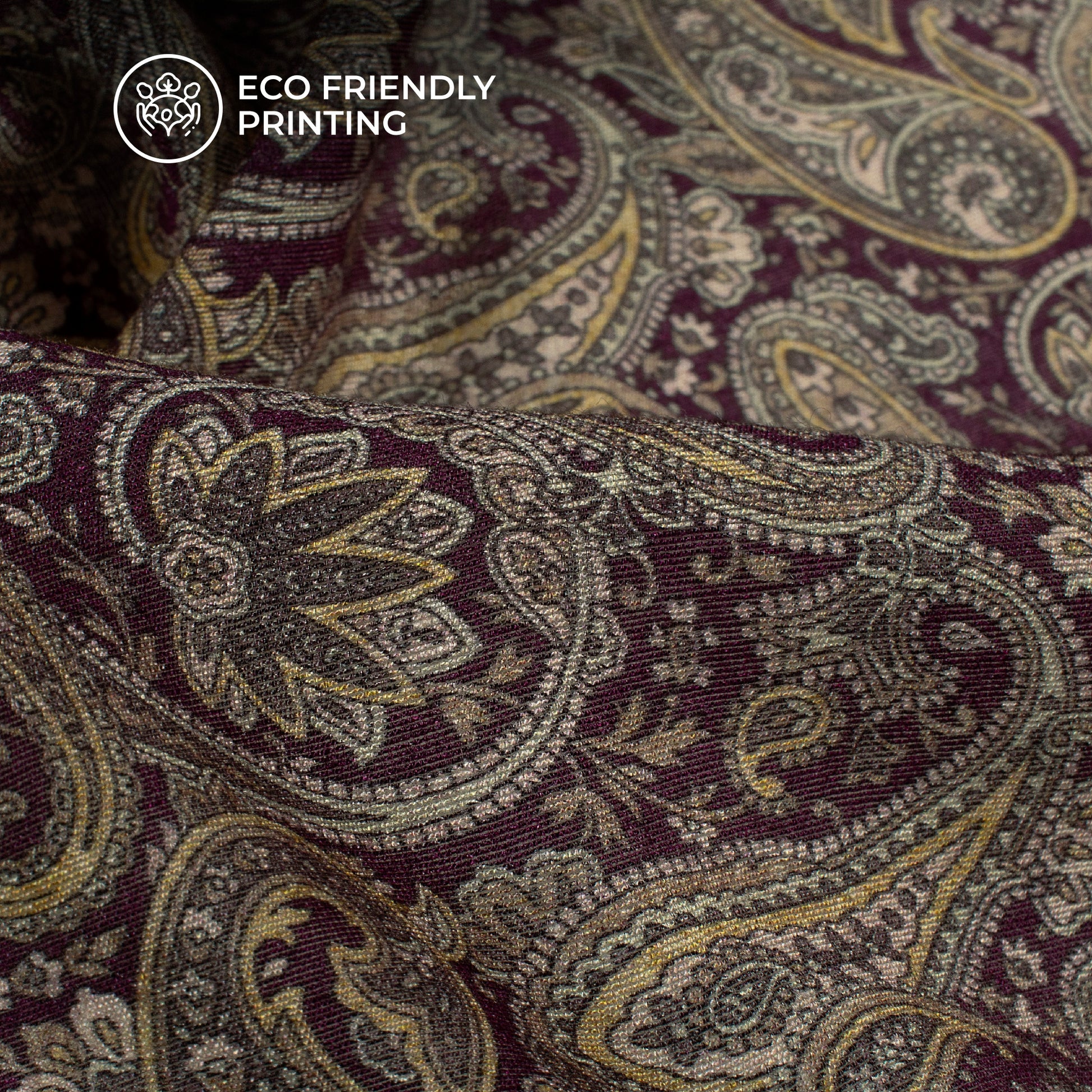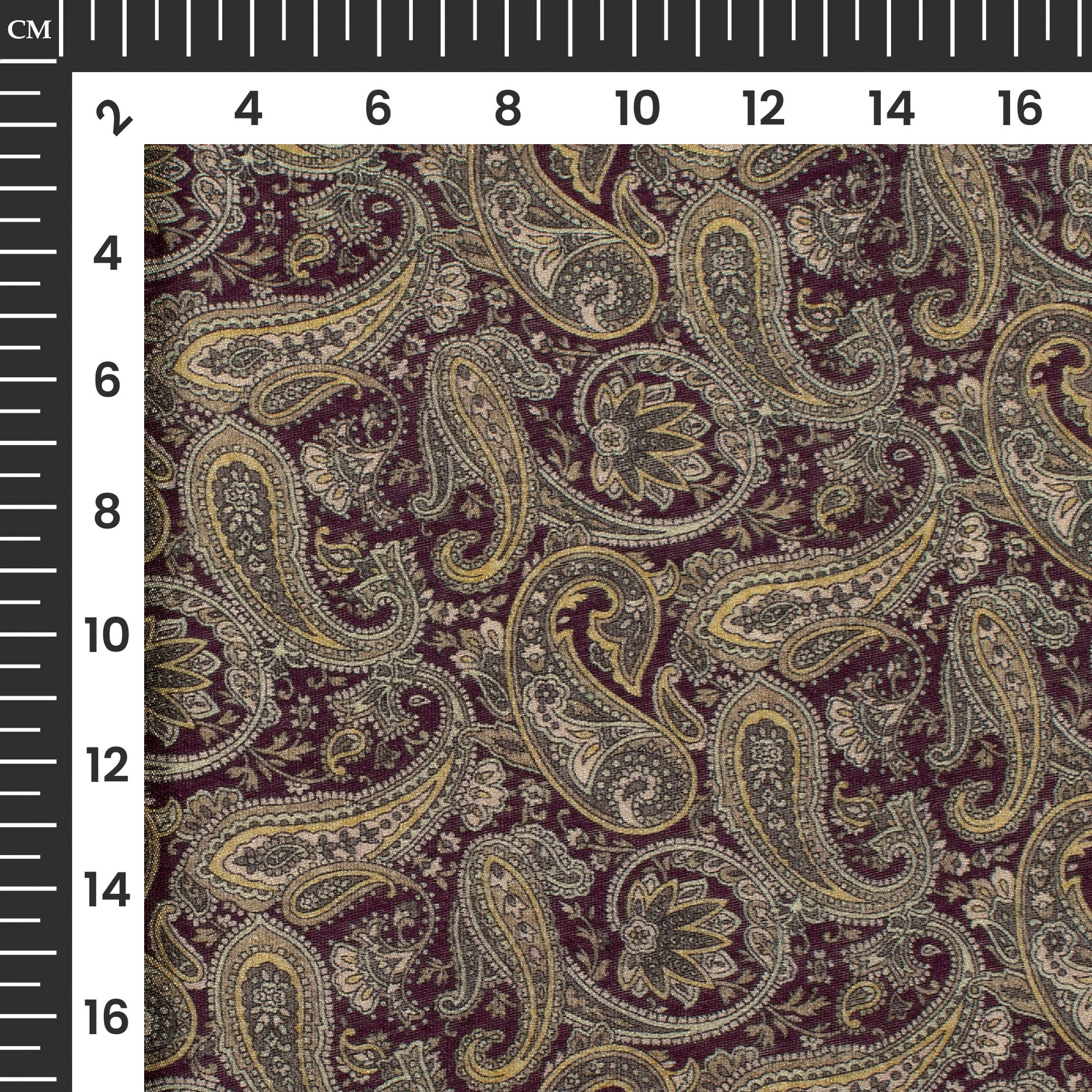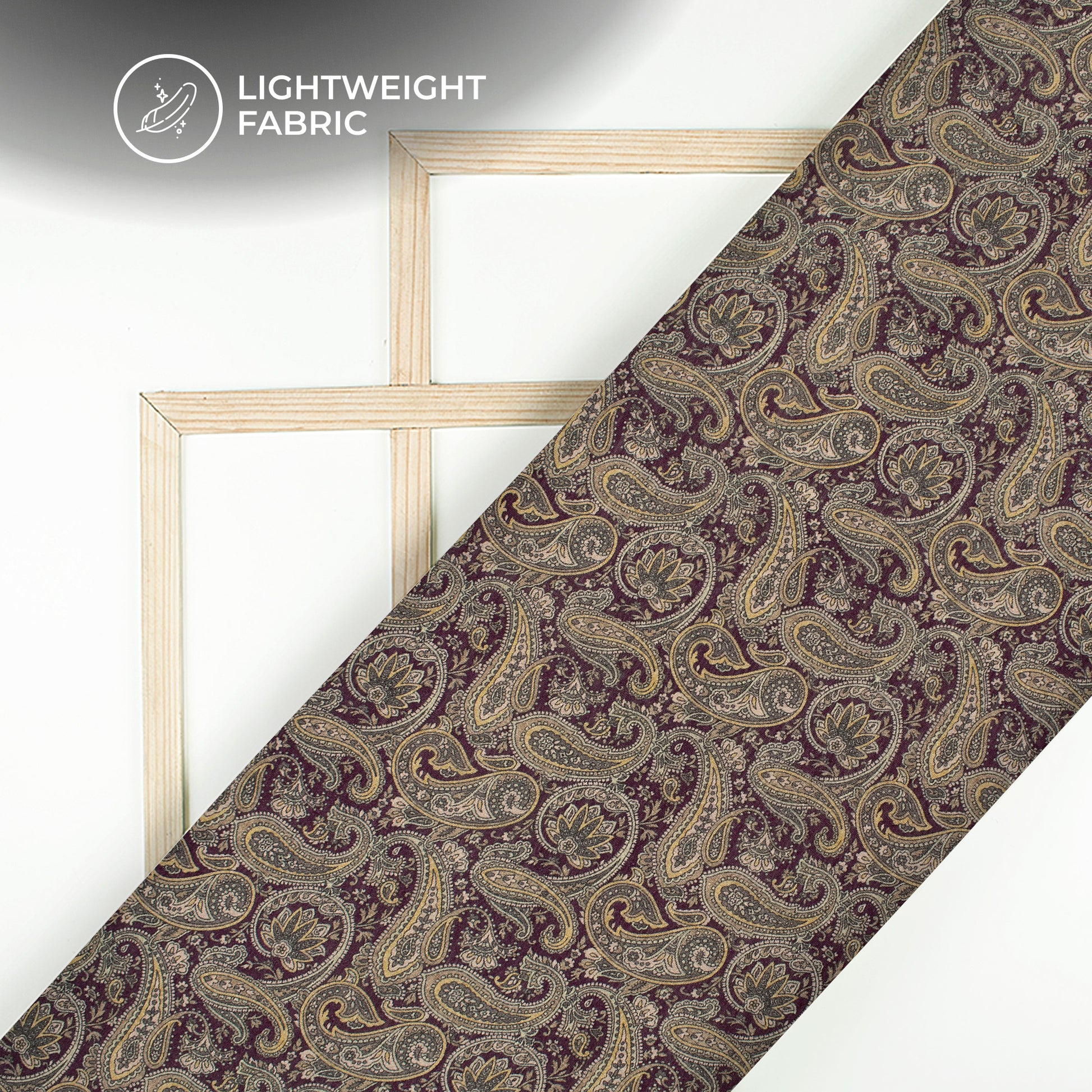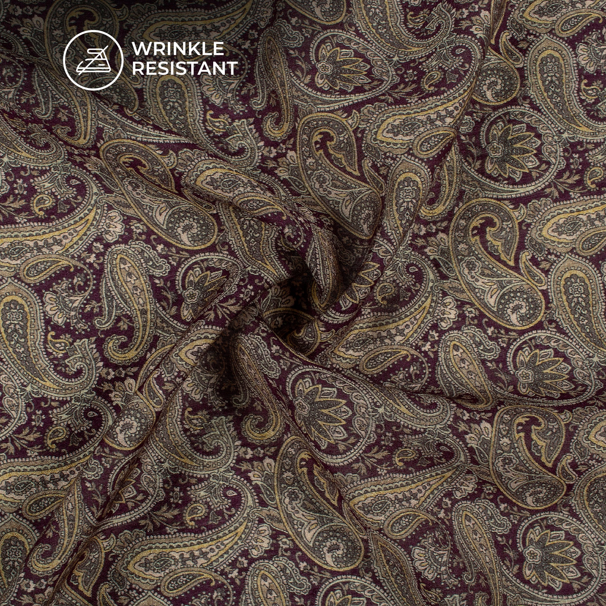 Wine Purple And Yellow Paisley Digital Print Viscose Chanderi Fabric