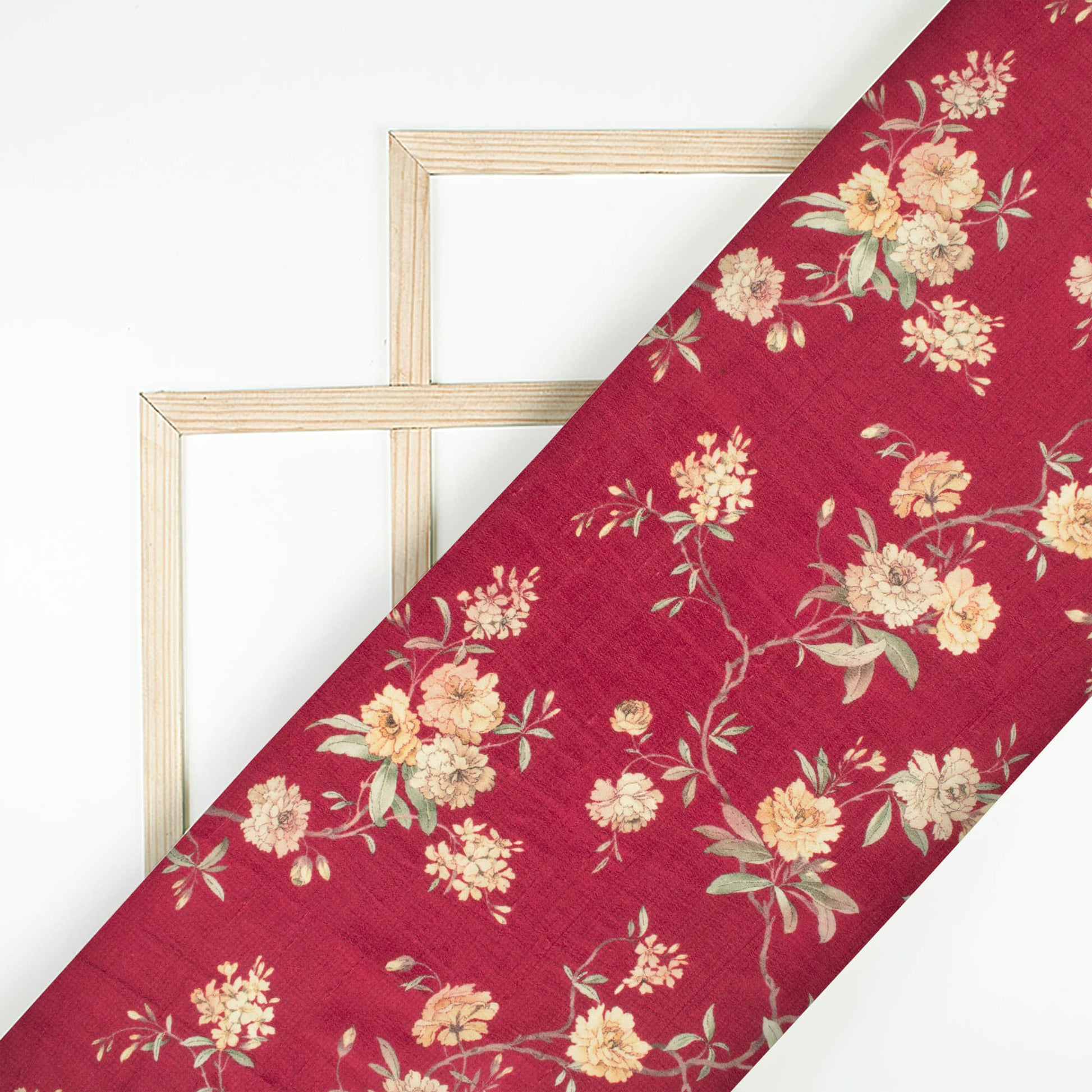 Wine Red And Beige Floral Digital Print Bemberg Raw Silk Fabric