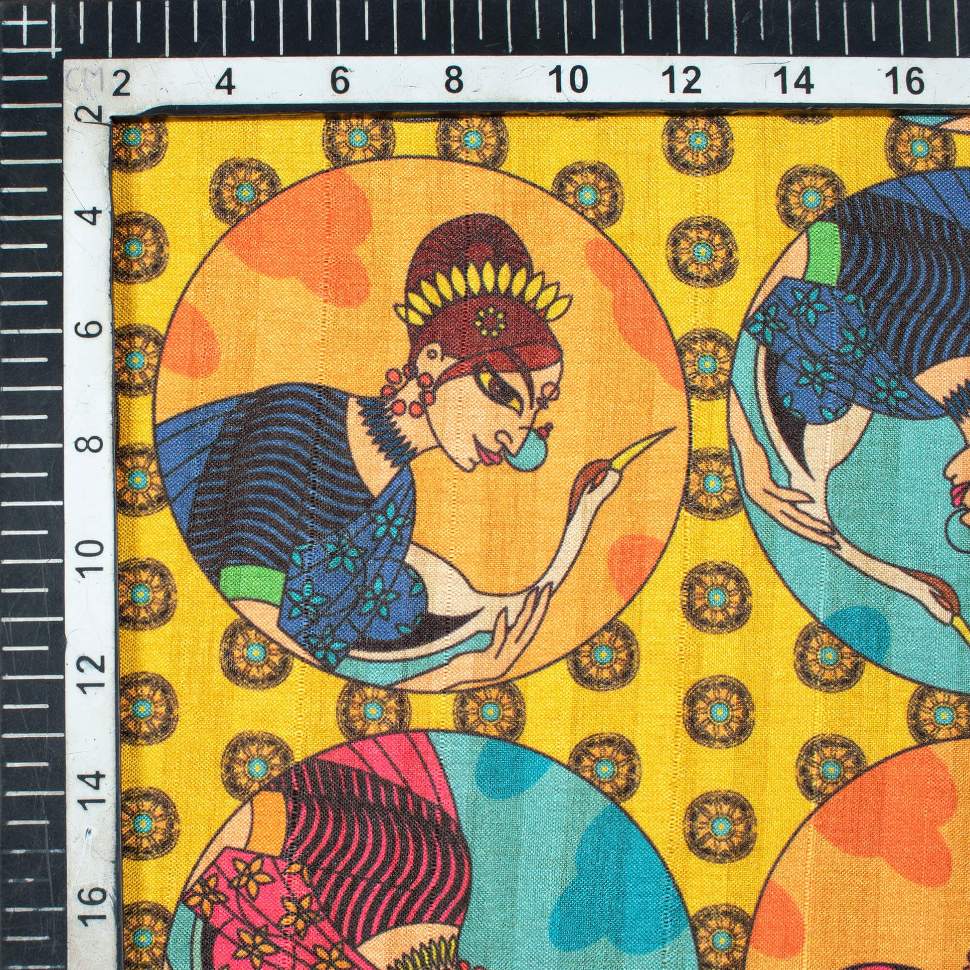 Yellow And Salmon Orange Madhubani Pattern Digital Print Art Tussar Silk Fabric