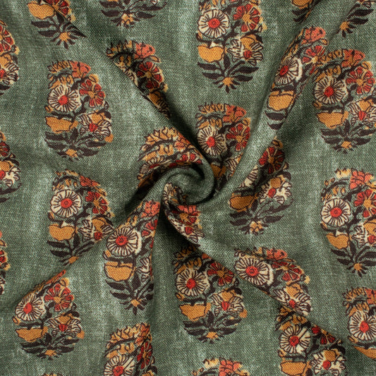 Basil Green And Ochre Orange Floral Pattern Digital Print Linen Textured Fabric (Width 56 Inches) Basil Green And Ochre Orange Floral Pattern Digital Print Linen Textured Fabric (Width 56 Inches)