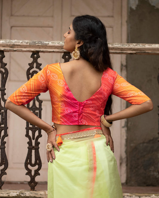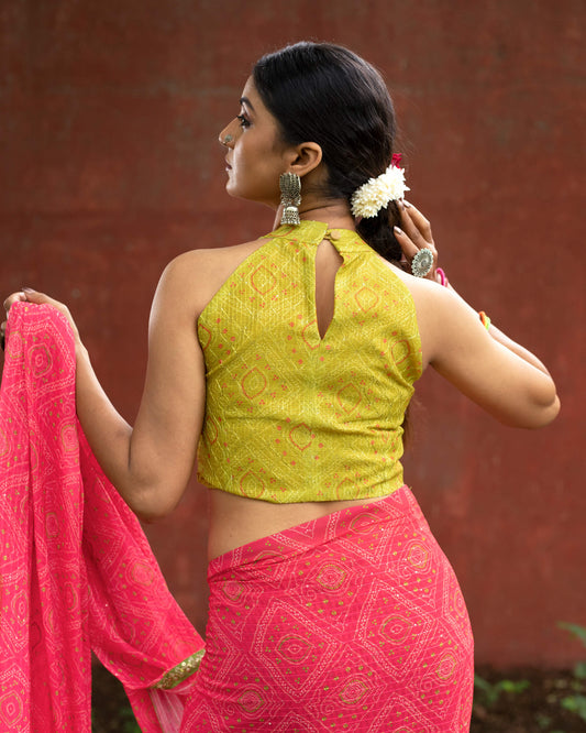 Barn Red And Green Bandhanii Pattern Digital Print Georgette Saree With Premium Lace Barn Red And Green Bandhanii Pattern Digital Print Georgette Saree With Premium Lace