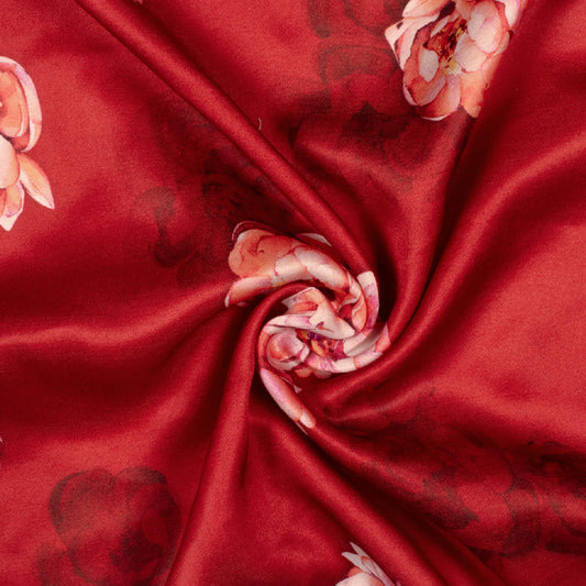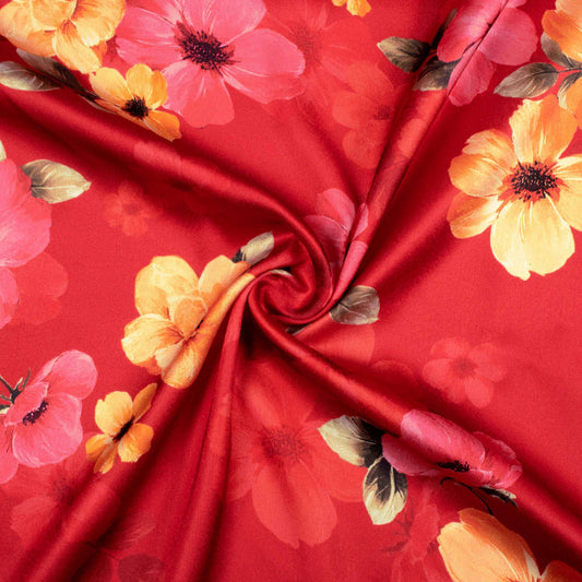 Vermilion Red And Pink Floral Pattern Digital Print Premium Lush Satin Fabric Vermilion Red And Pink Floral Pattern Digital Print Premium Lush Satin Fabric