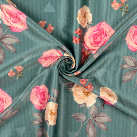 Viridian Green And Rose Pink Floral Pattern Digital Print Lush Satin Fabric Viridian Green And Rose Pink Floral Pattern Digital Print Lush Satin Fabric