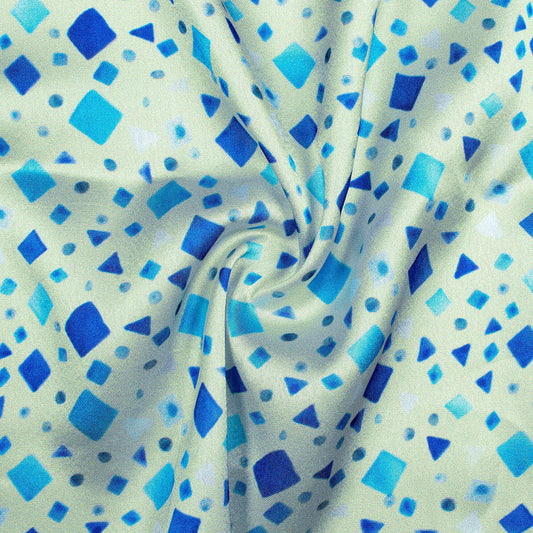 Vrunda's Choice Snow White And Blue Geometric Pattern Digital Print Japan Satin Fabric Vrunda's Choice Snow White And Blue Geometric Pattern Digital Print Japan Satin Fabric