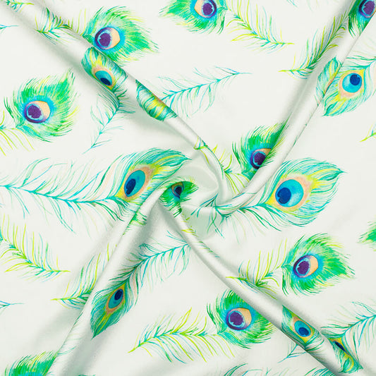 -10% offWhite And Green Peacock Feather Pattern Digital Print Japan Satin Fabric White And Green Peacock Feather Pattern Digital Print Japan Satin Fabric