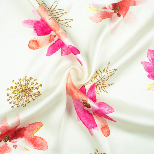 White And Fuchsia Floral Pattern Digital Print Bemberg Chiffon Fabric White And Fuchsia Floral Pattern Digital Print Bemberg Chiffon Fabric