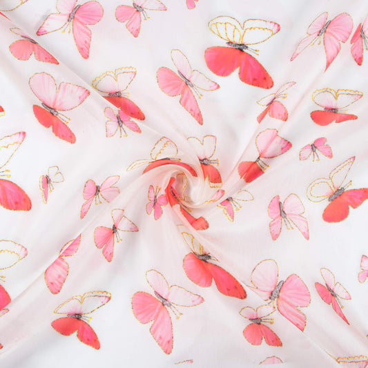 White And Punch Pink Butterfly Pattern Hand Paint Effect Digital Print Organza Satin Fabric White And Punch Pink Butterfly Pattern Hand Paint Effect Digital Print Organza Satin Fabric