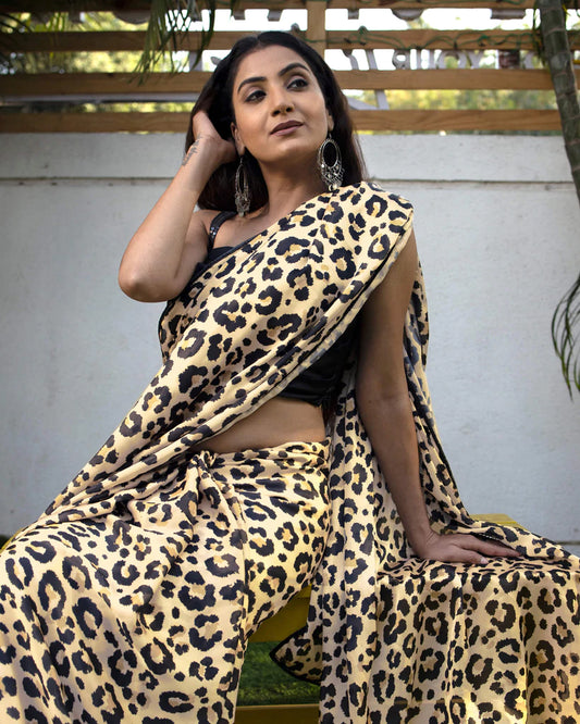 Black and Beige Animal Pattern Digital Print Georgette Satin Saree With Lace Border Black and Beige Animal Pattern Digital Print Georgette Satin Saree With Lace Border