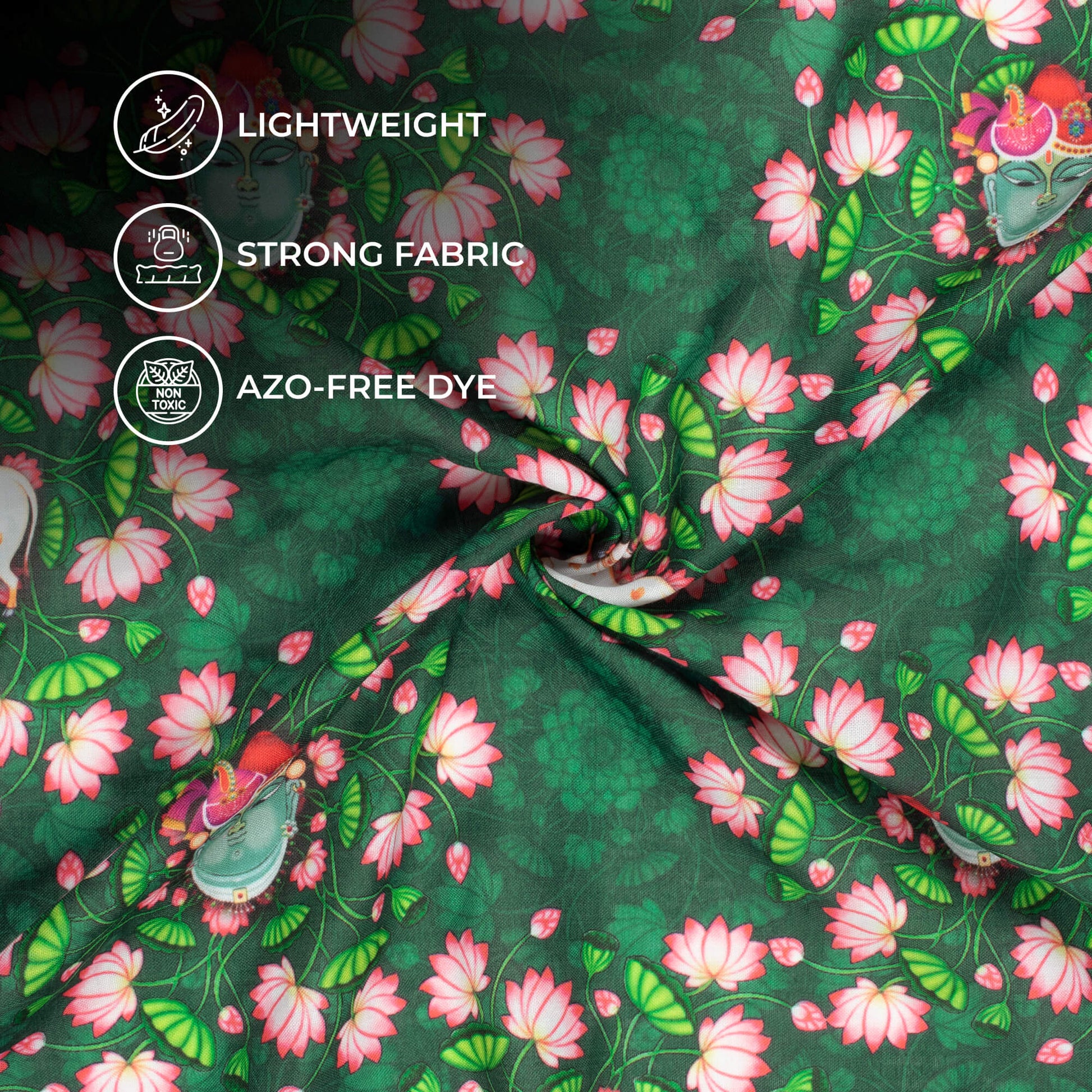 The Pichwai pattern collection from fabcurate is an adoption of the Pichwai painting that depicts the historical events of Lord Krishna's life. Motifs of leaves, trees, and scenic beauty on the fabric will surely mesmerize you at a glance. Digitally printed Pichwai patterns are something unique that tell a lot about our culture and one can display them in style. You can wear these fabrics during festive days and special occasions. One can make dresses, sarees, tops, and much more using this fabric.
