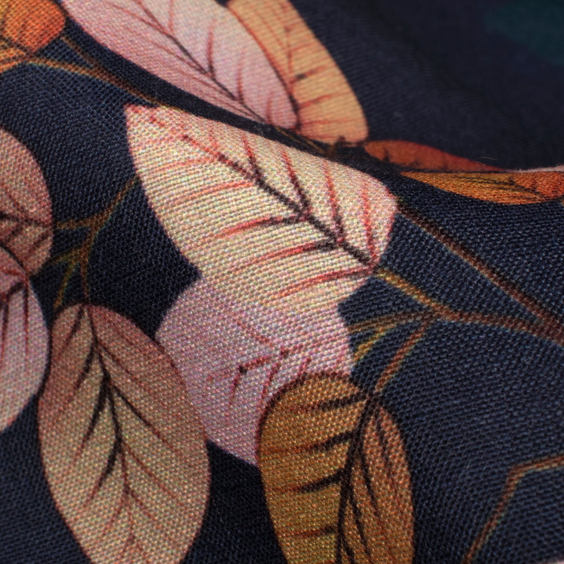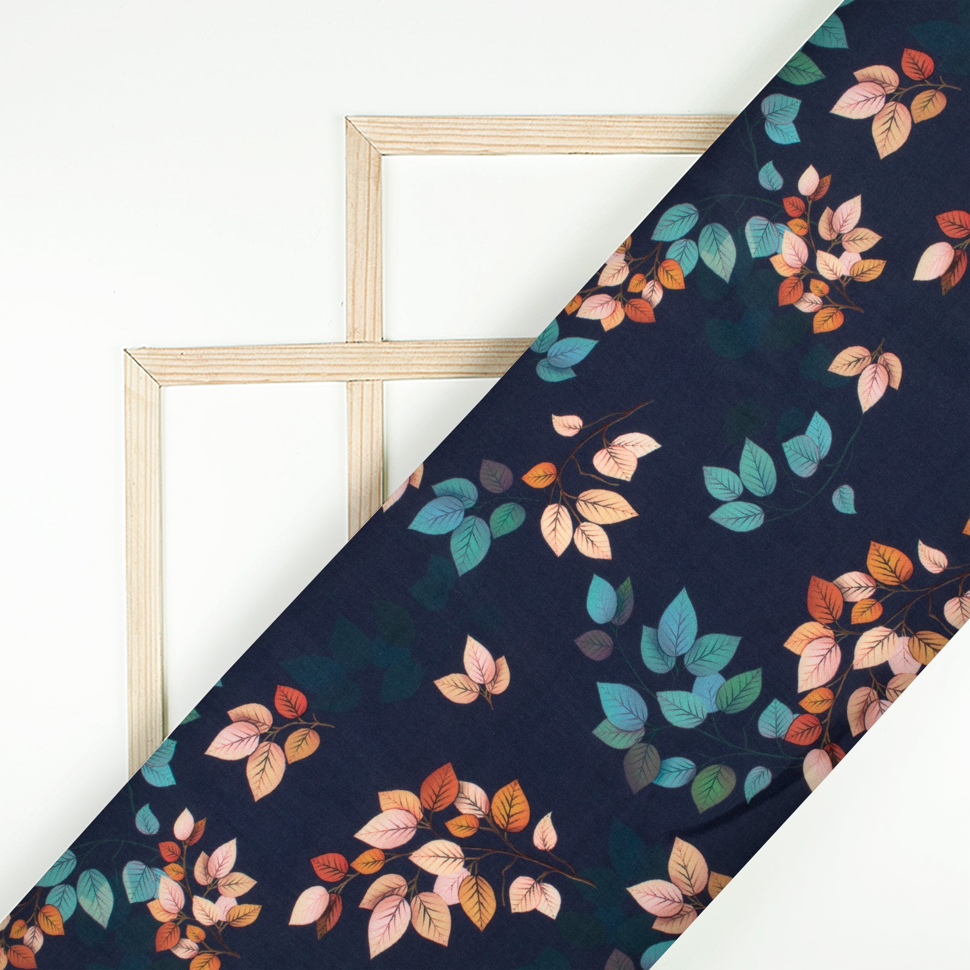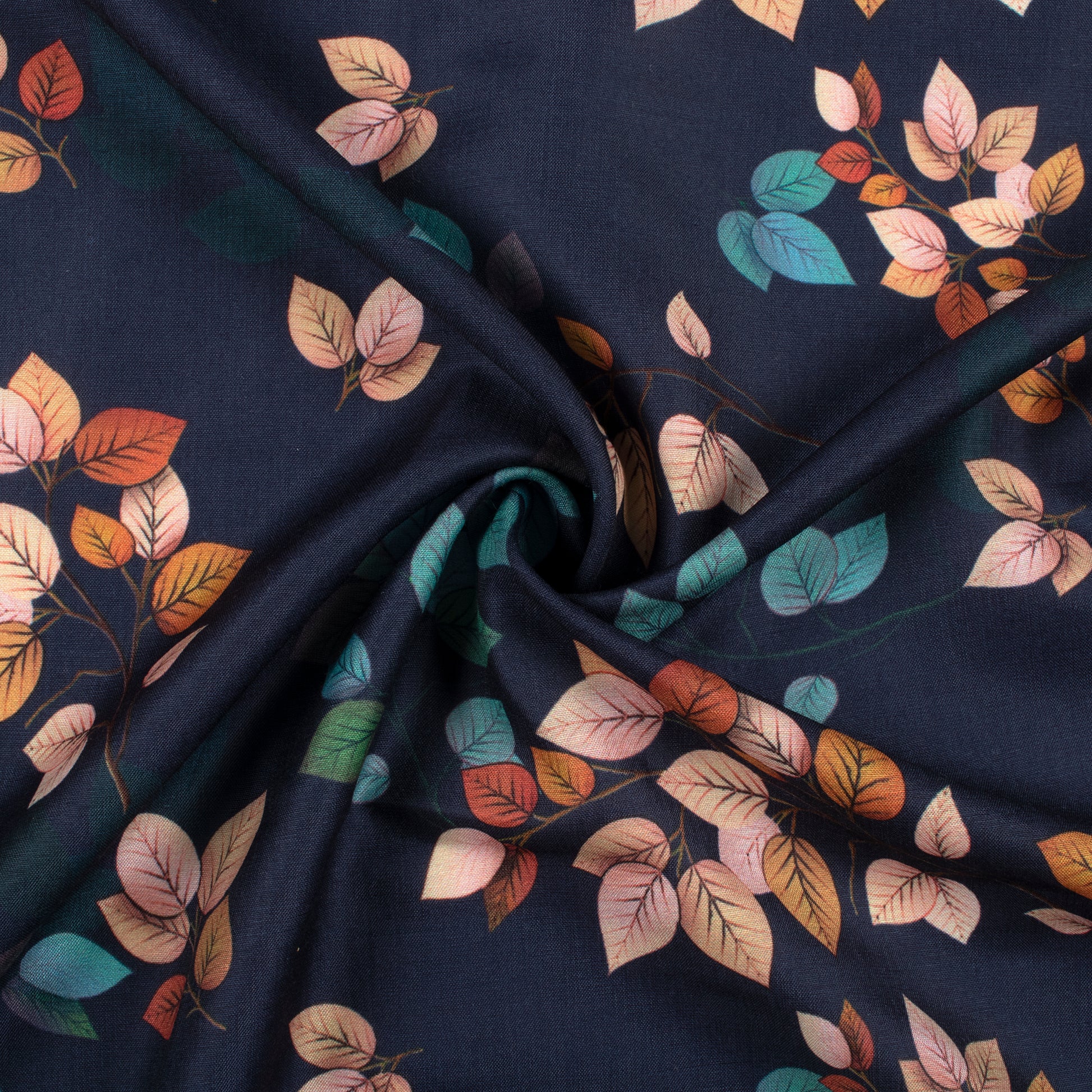 Navy Blue And Light Peach Leaf Pattern Digital Print Muslin Fabric