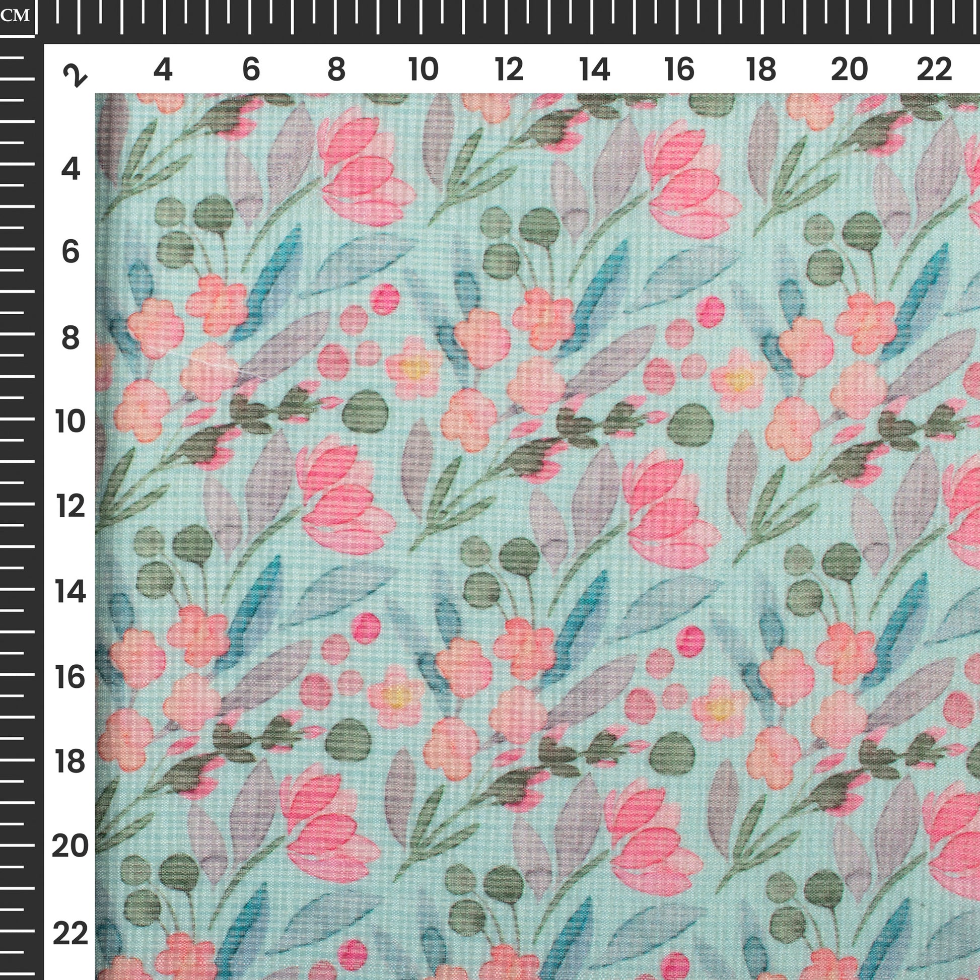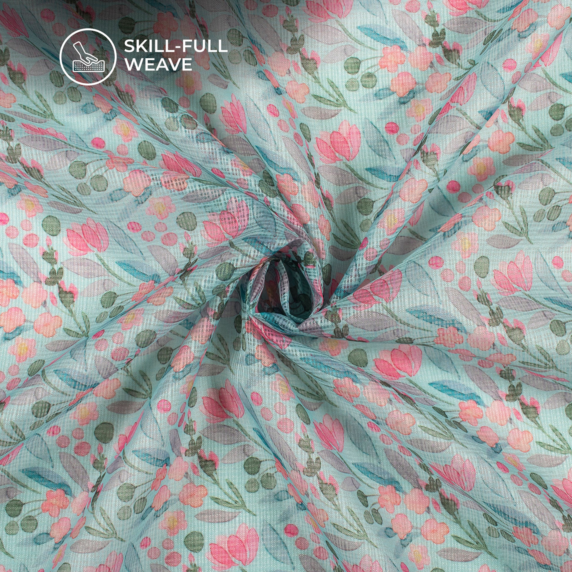 Sky Blue And Pink Floral Digital Print Kota Doria Fabric