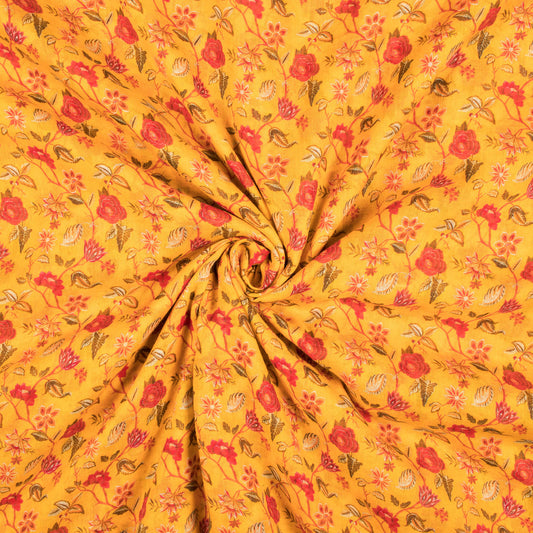 Merigold Yellow And Red Floral Pattern Digital Print Pure Cotton Mulmul Fabric Merigold Yellow And Red Floral Pattern Digital Print Pure Cotton Mulmul Fabric
