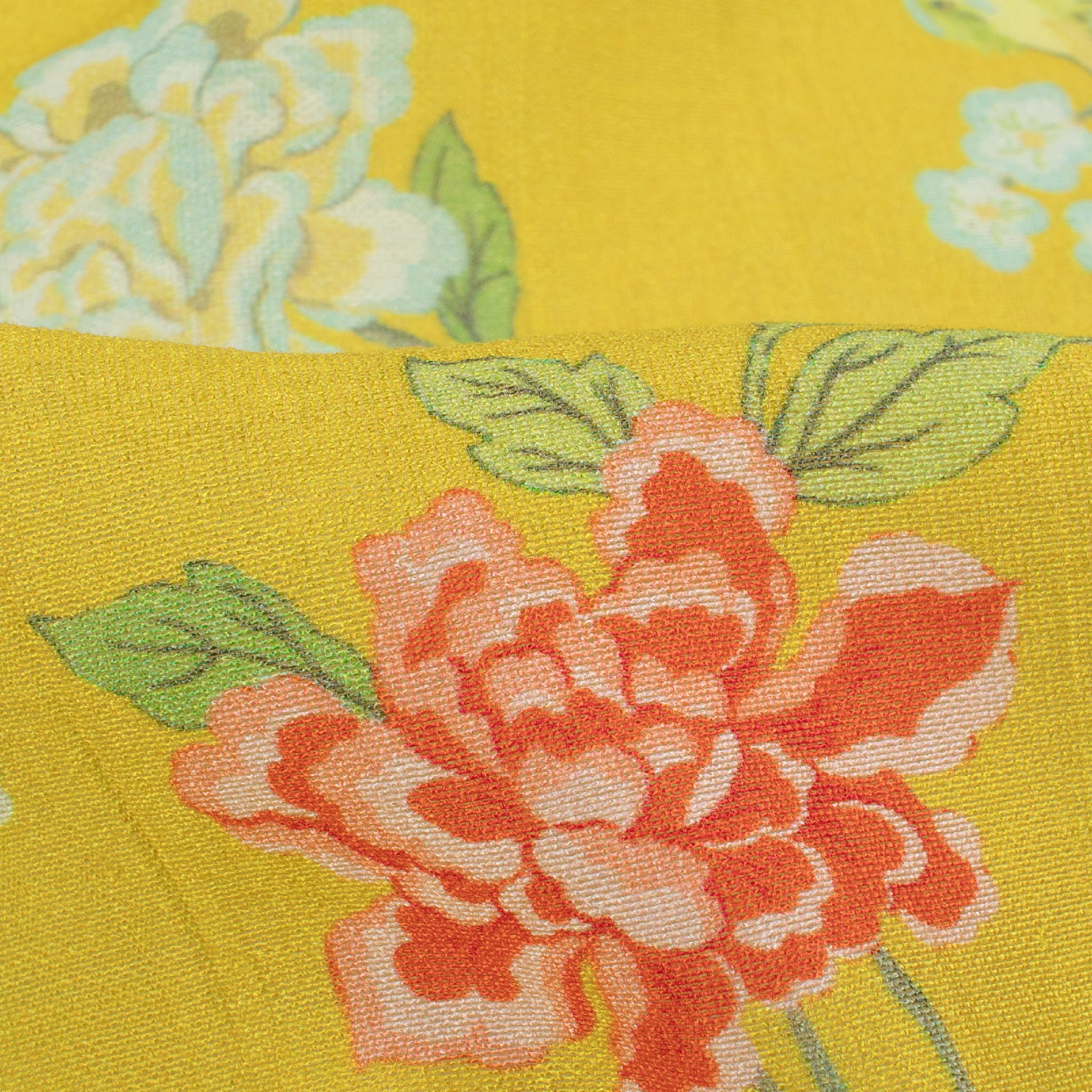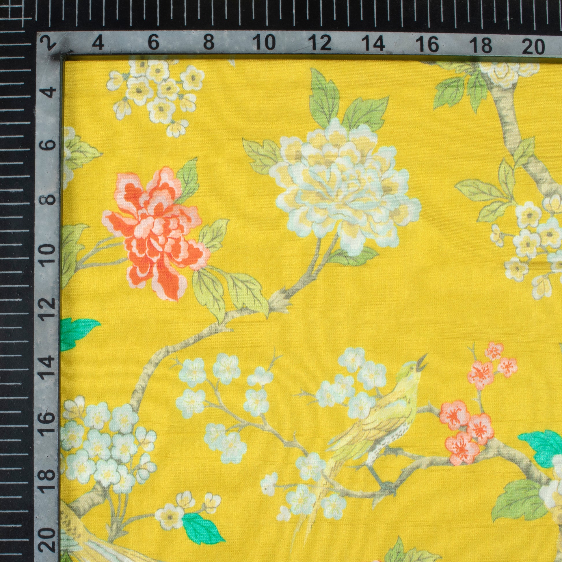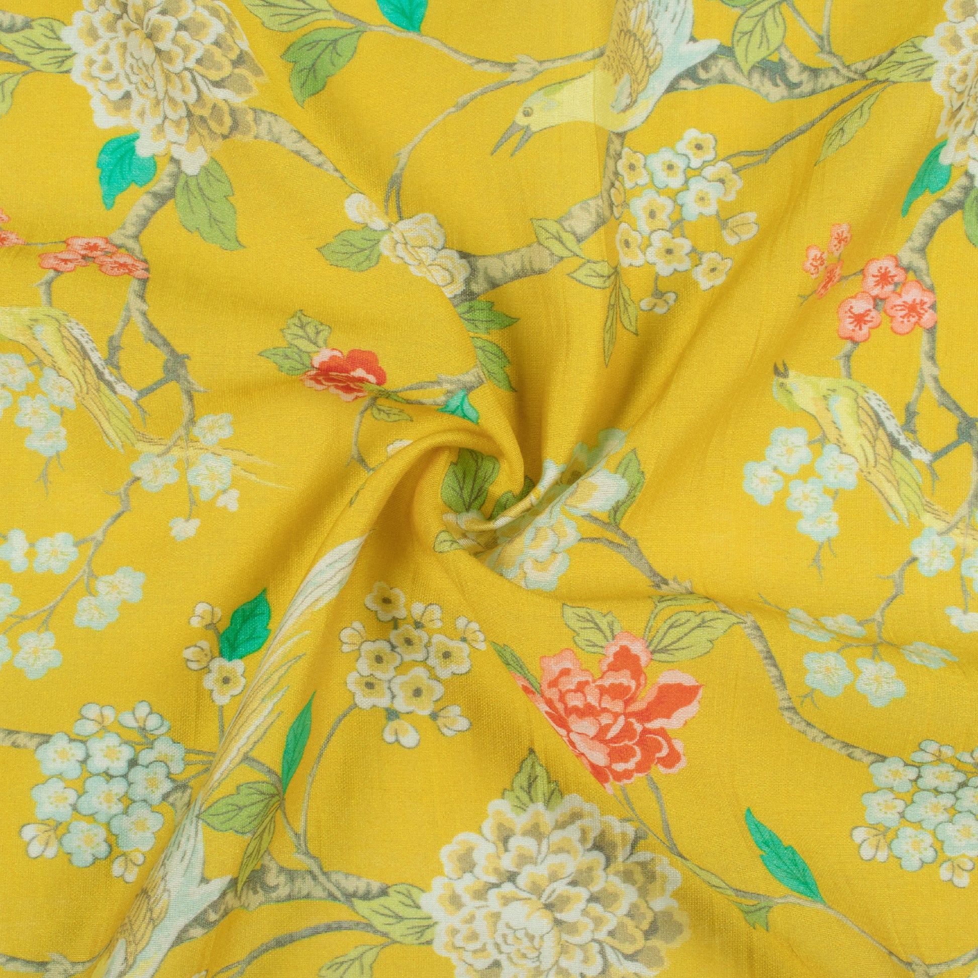 Bumblebee Yellow And Steel Grey Bird Pattern Digital Print Viscose Chanderi Fabric