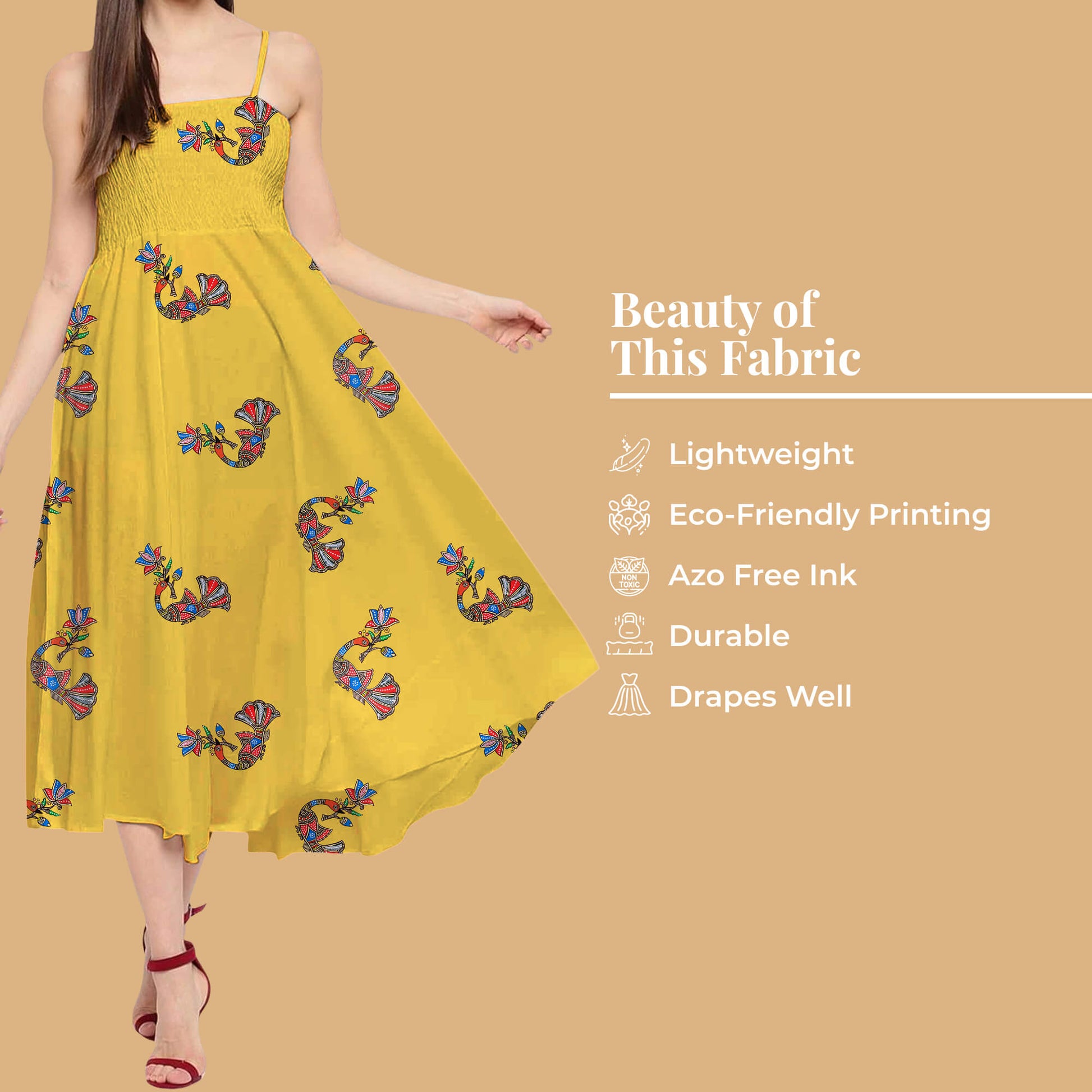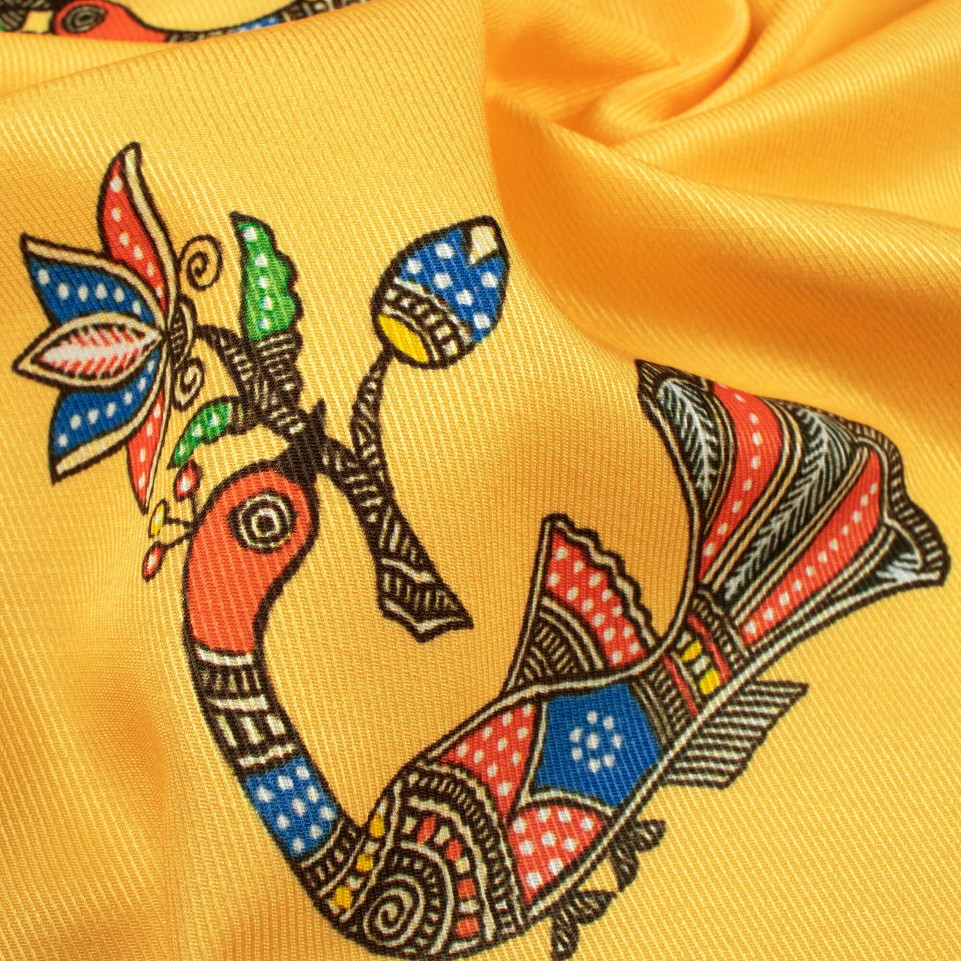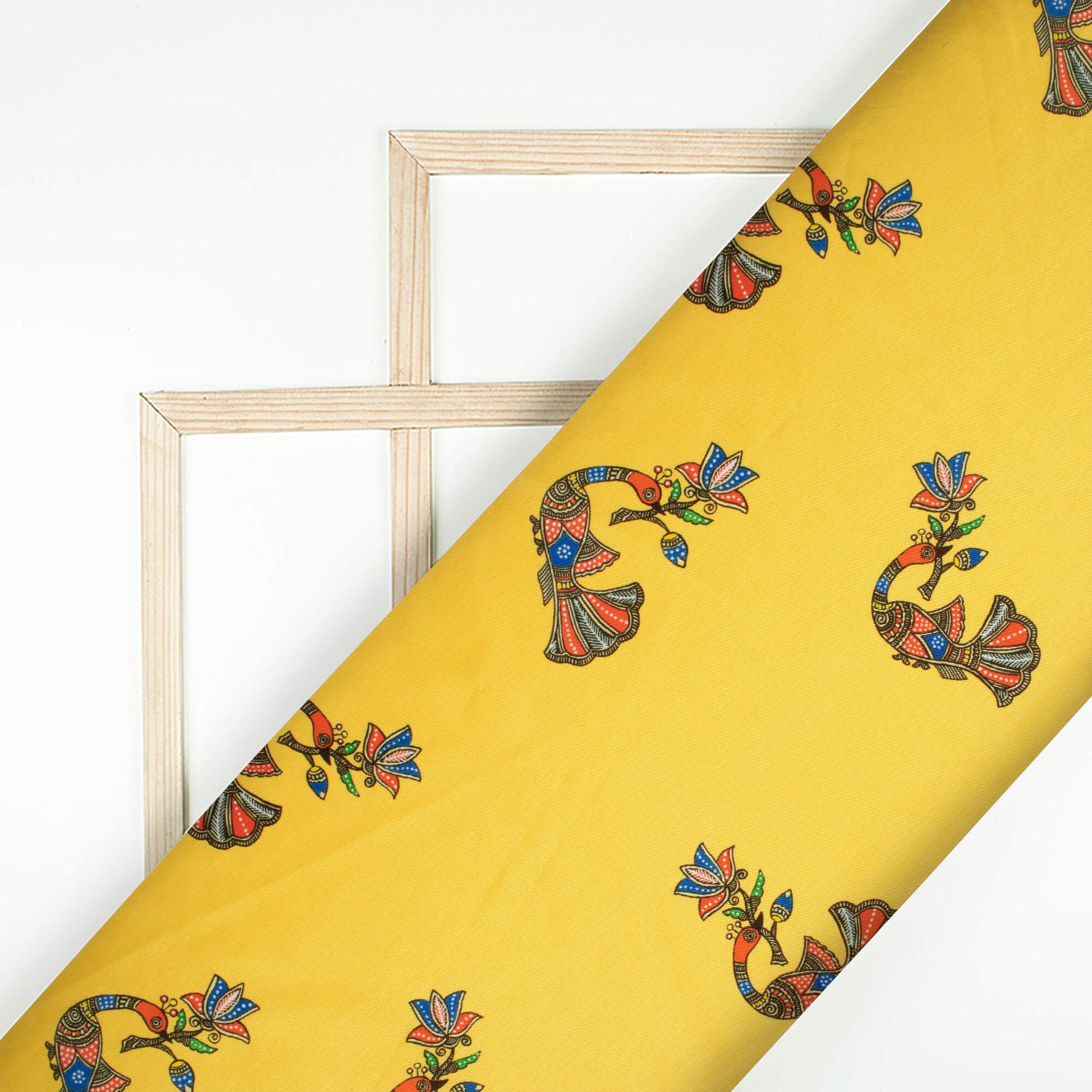 Mustard Yellow And Burnt Orange Bird Pattern Digital Print Twill Fabric (Width 56 Inches)