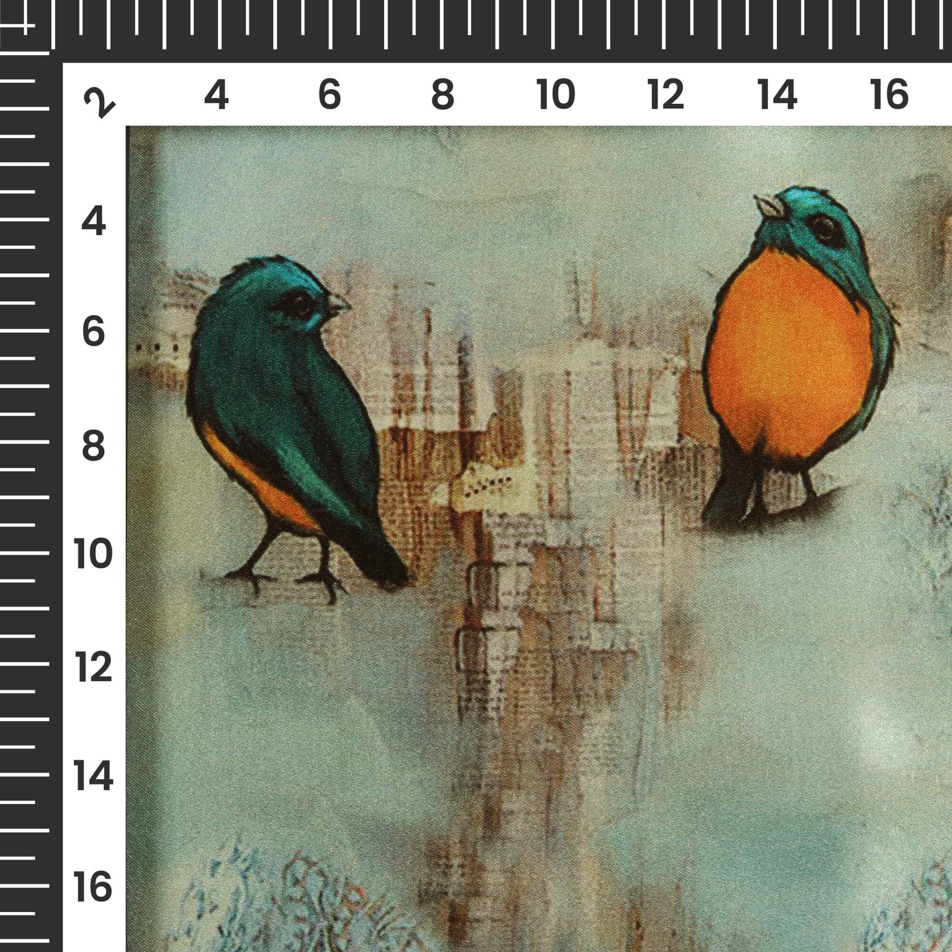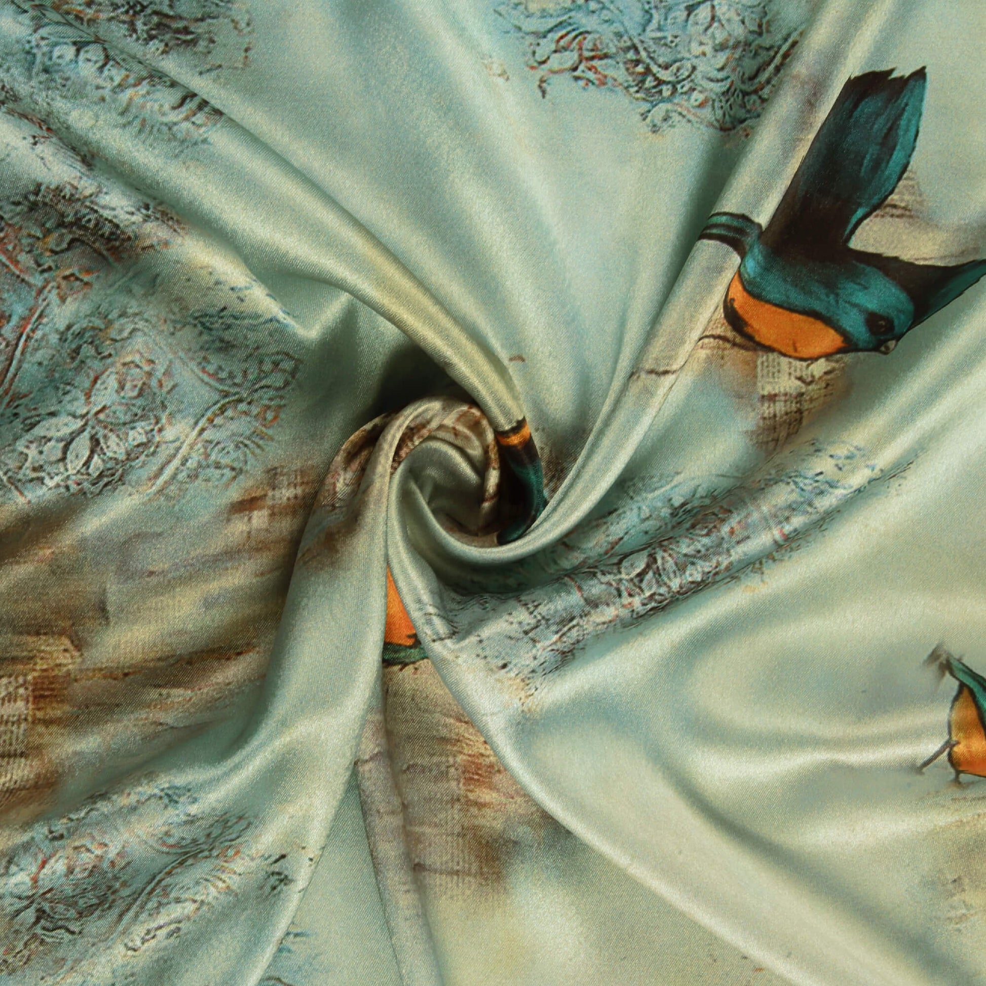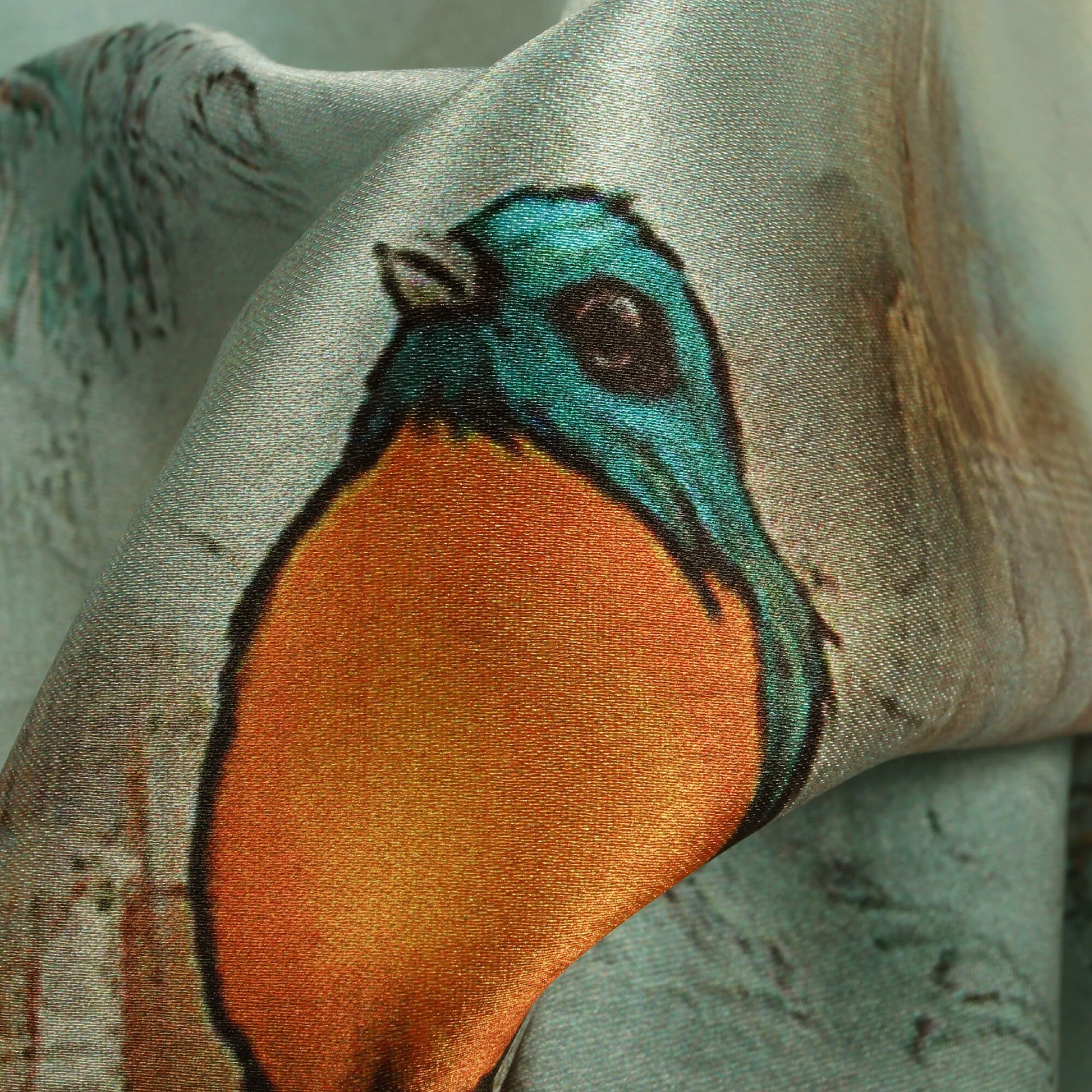 Tea Green And Orange Bird Pattern Digital Print Japan Satin Fabric