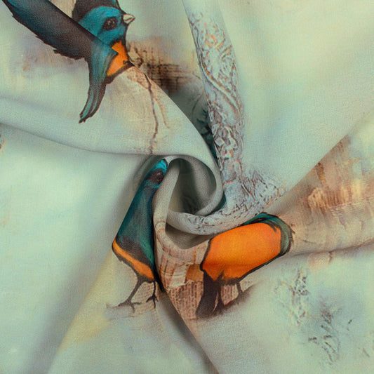-10% offStone Blue And Orange Bird Pattern Digital Print Georgette Fabric Stone Blue And Orange Bird Pattern Digital Print Georgette Fabric