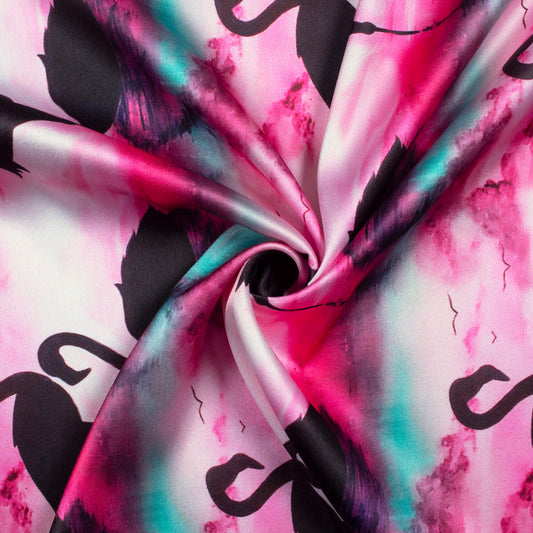-10% offSteel Grey And Flamingo Pink Bird Pattern Digital Print Japan Satin Fabric Steel Grey And Flamingo Pink Bird Pattern Digital Print Japan Satin Fabric