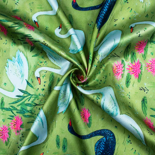 -10% offGrass Green And White Bird Pattern Digital Print Japan Satin Fabric Grass Green And White Bird Pattern Digital Print Japan Satin Fabric