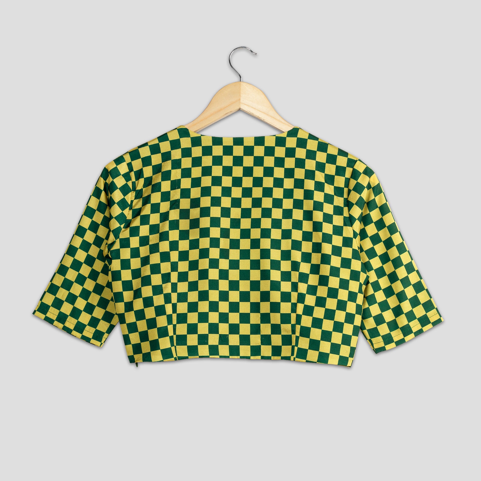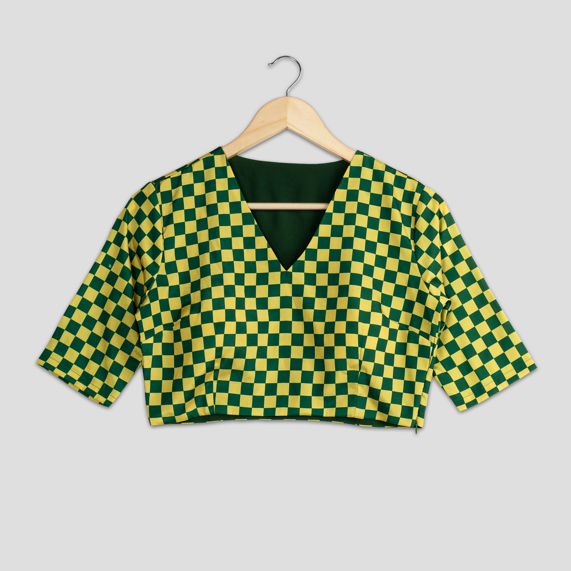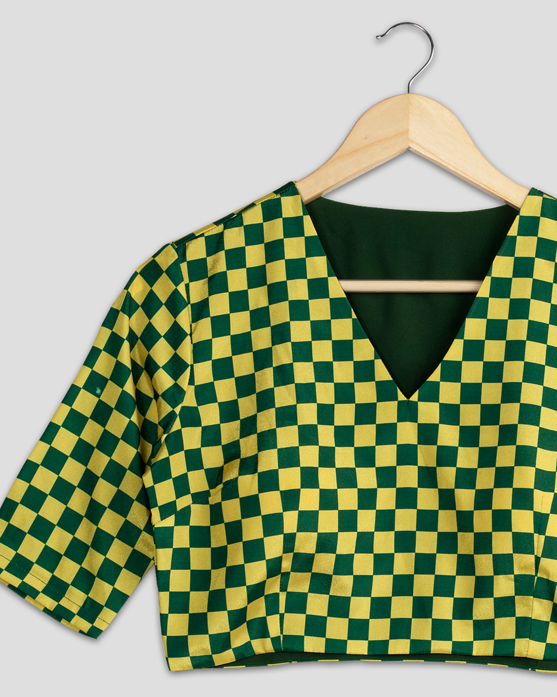 DescriptionDescriptionThis designer blouse is made to keep the trends culturally alive. Match these gorgeous blouses with sarees that will lift your spirits in many ways. Wear it to special occasions, wedding days, festivals, and more. For a more ethnic look, pair it up with minimal accessories. MaterialCrepe Silk ColorYellow Neck TypeV-Neck Sleeve TypeShort Sleeve OpeningSide Zip Fabric CompositionPolyester Style CodeBL0041 Blouse Length