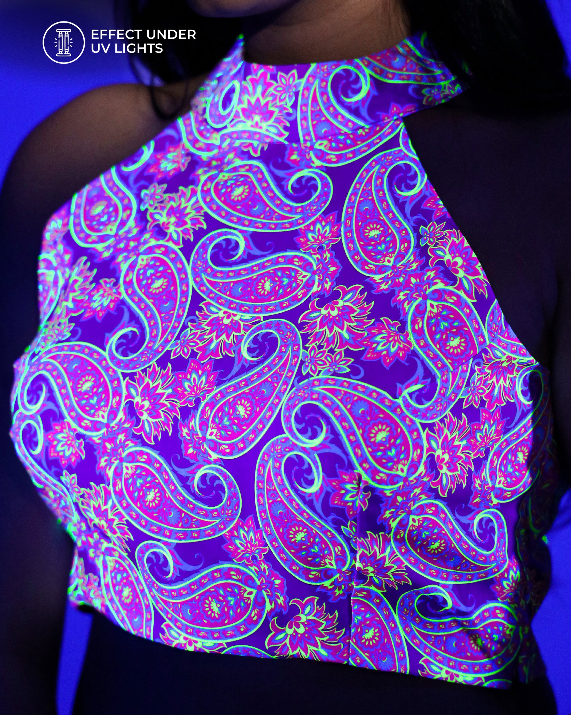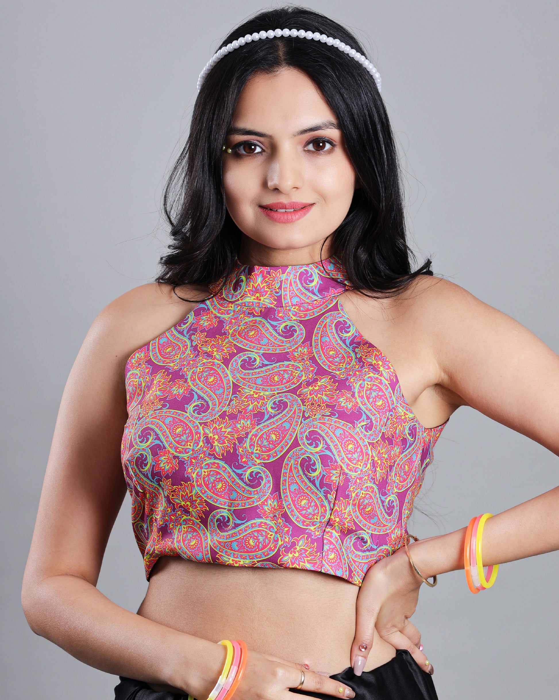 This playful blouse will add a pop of color to your wardrobe with its neon hue. In UV light, it shines even brighter! Perfect to pair with sarees, this blouse will surely make you stand out.