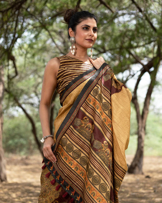 Tussock Brown And Chocolate Brown Madhuvanii Pattern Digital Print Art Tusser Silk Saree With Tassels Tussock Brown And Chocolate Brown Madhuvanii Pattern Digital Print Art Tusser Silk Saree With Tassels