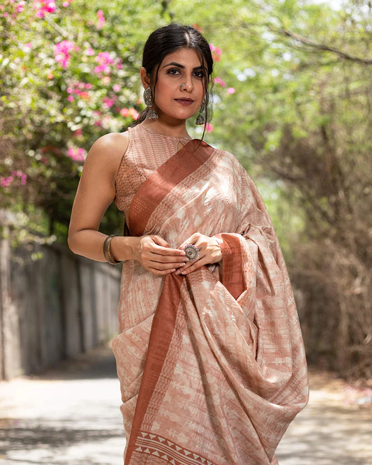 Brick Brown And White Booti Pattern Digital Print Art Tusser Silk Saree With Tassels Brick Brown And White Booti Pattern Digital Print Art Tusser Silk Saree With Tassels