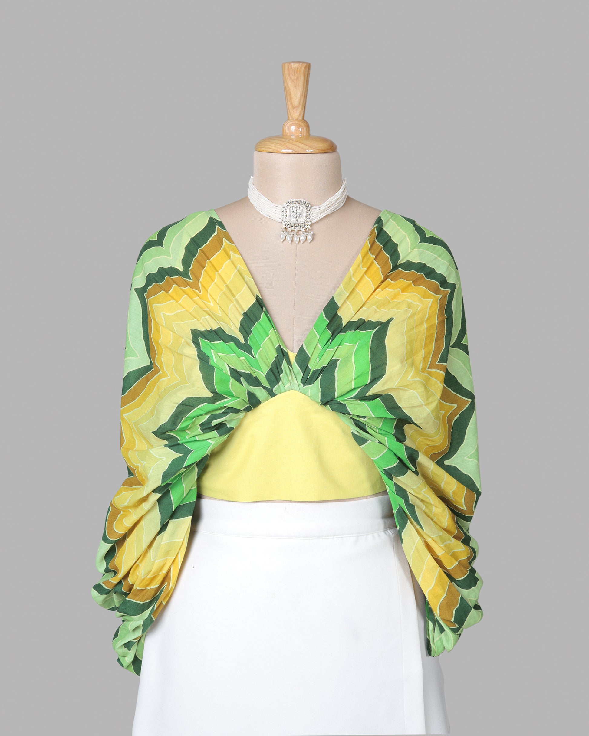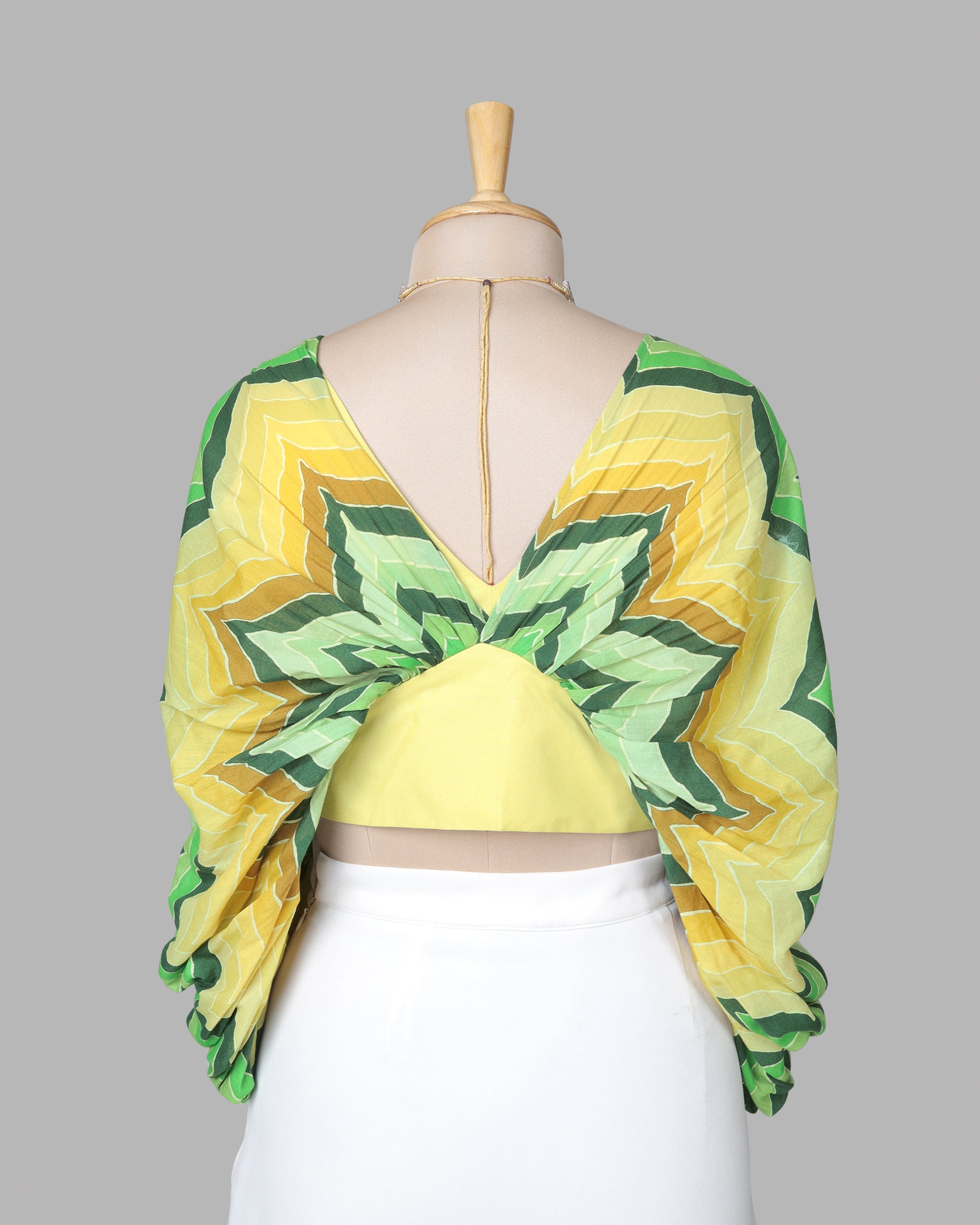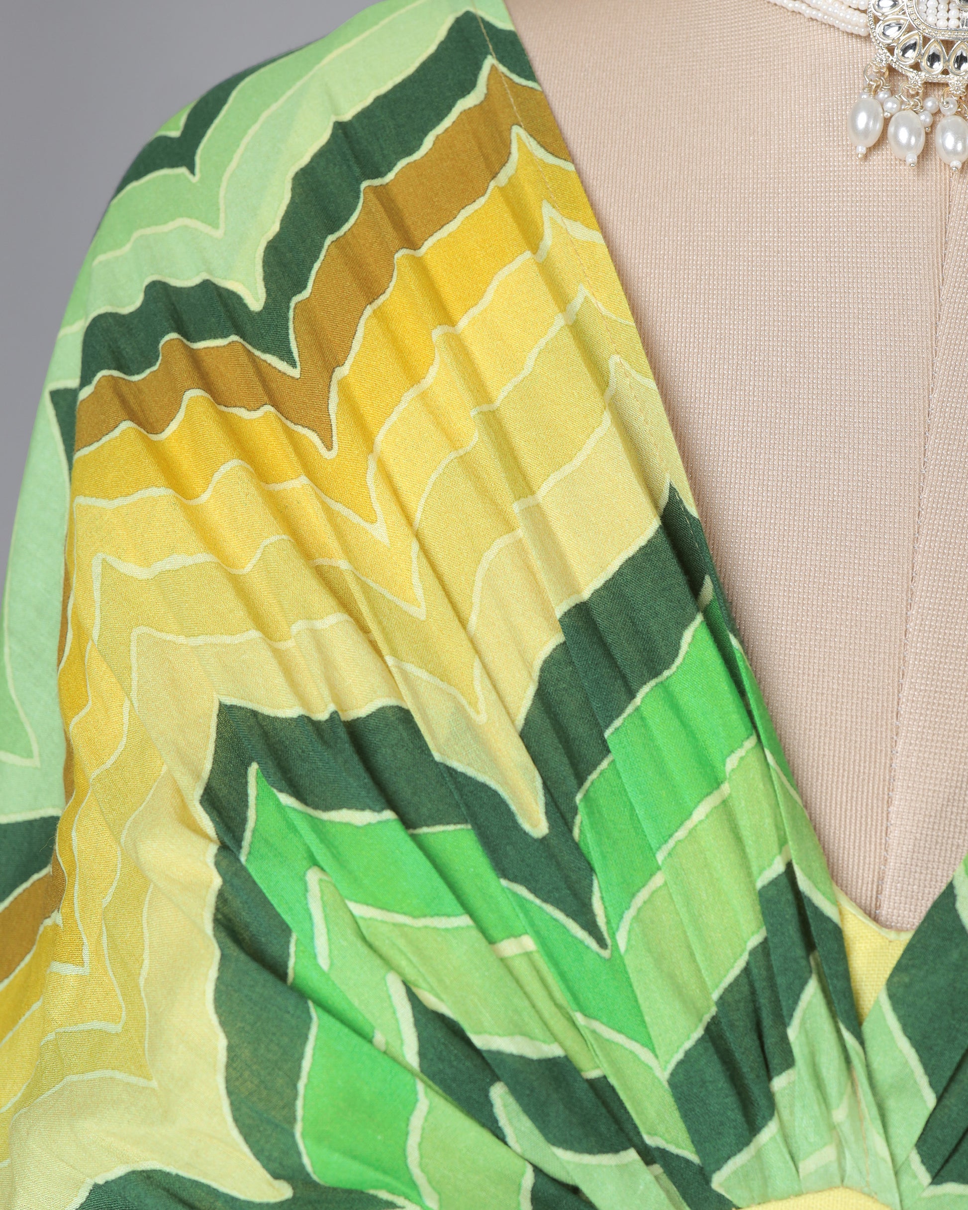 Green And Yellow Chevron Ruffle Sleeve Cotton Blouse