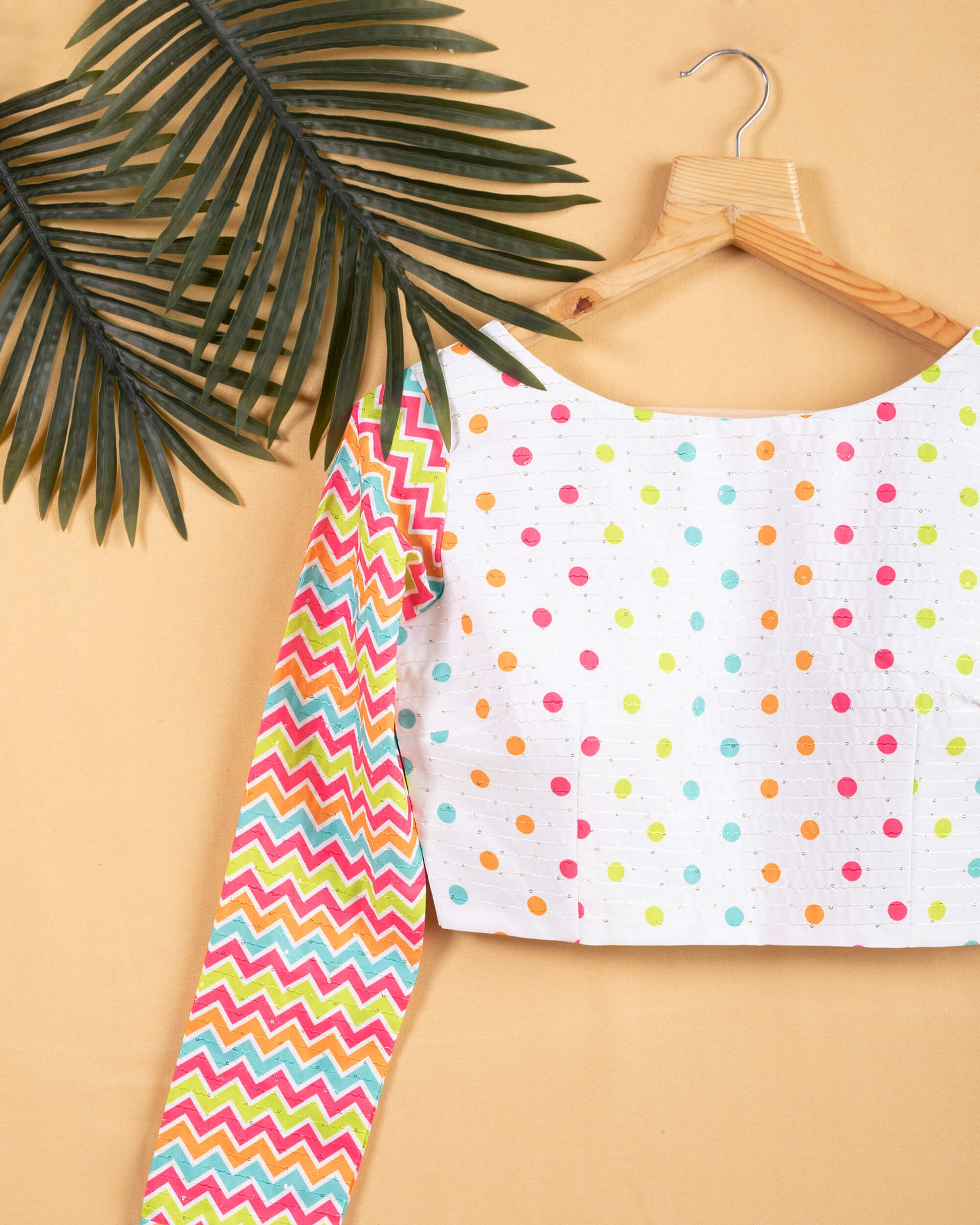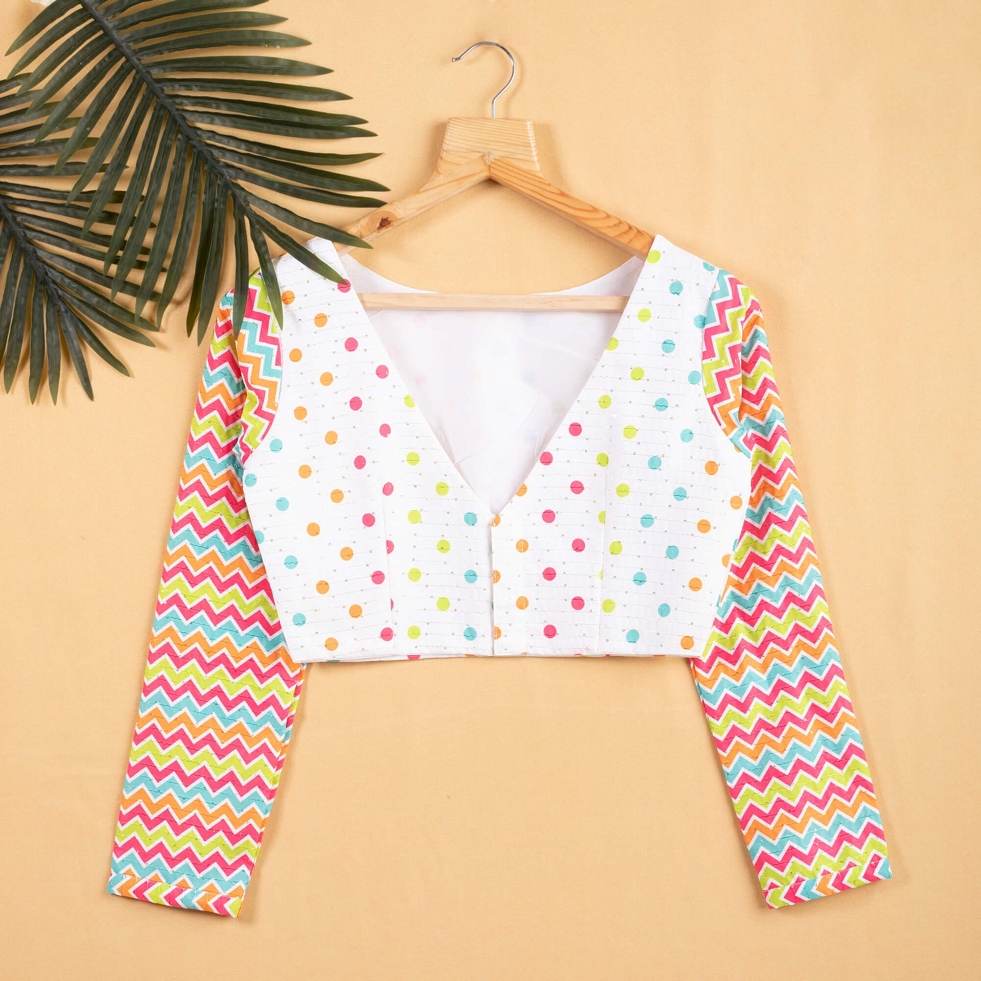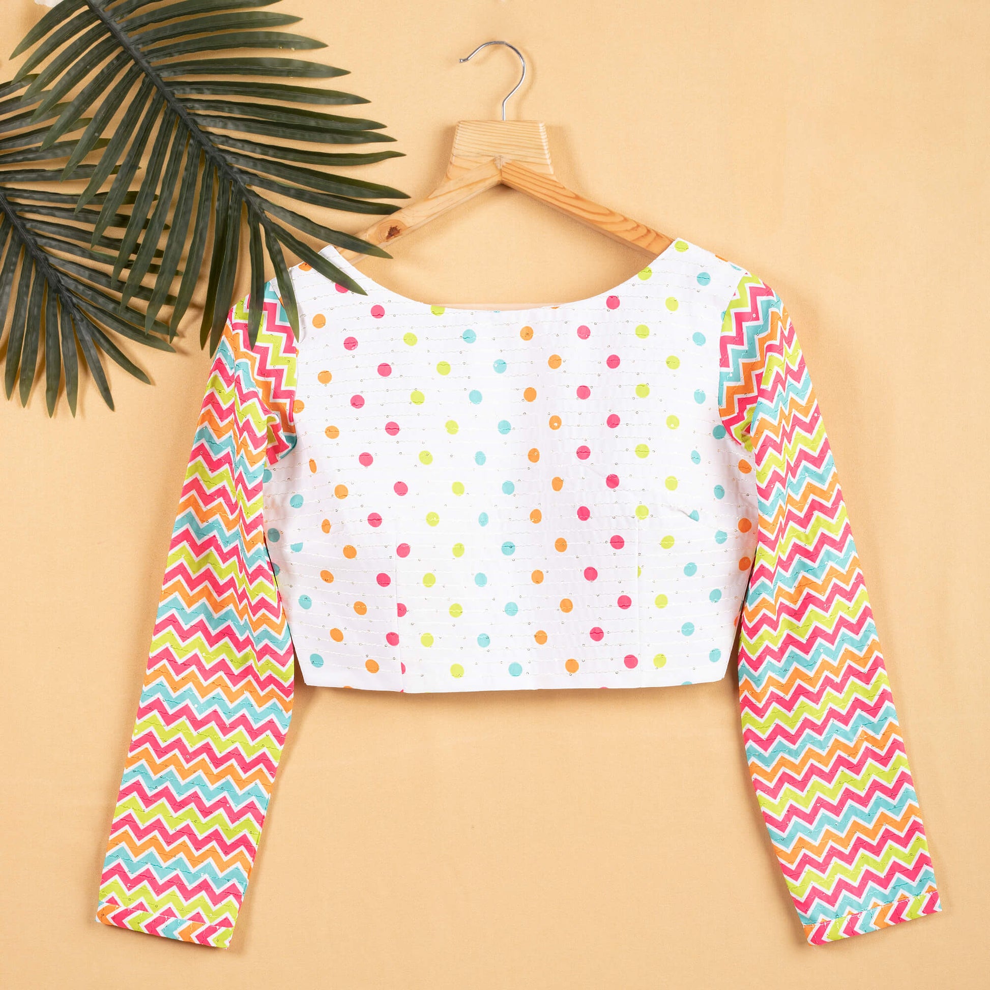 Blouse in Polka Dota & Chevron pattern looks wonderful. It features boat-neckline and is full sleeve. The fabric is soft and lightweight making it comfortable to wear. Suit this blouse with a saree and arrive in style.