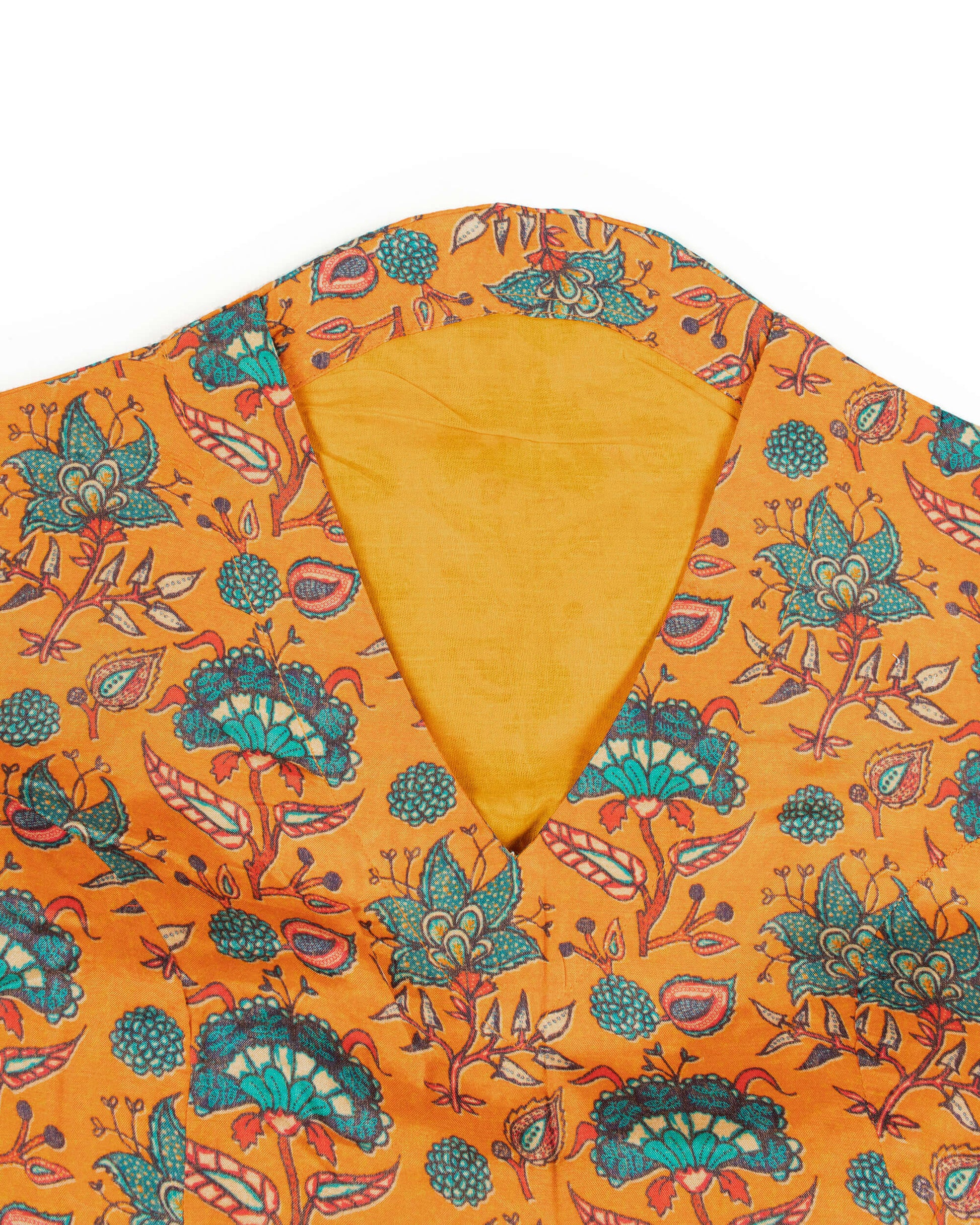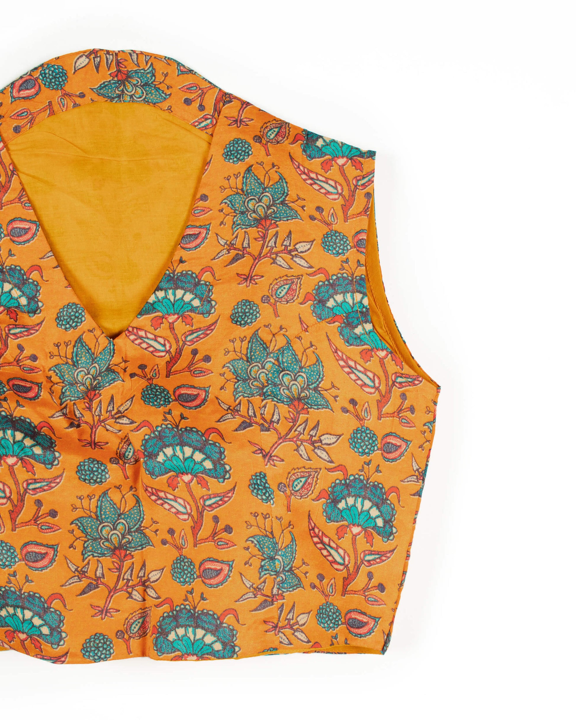 Viscose Muslin blouse is sleeveless and has a V-neckline with a size zip closure.The patternn formed on the blouse appears fabulous.This fabric is soft, breathable and maintains shape.Match this blouse with a saree to give yourself a fashion treat.