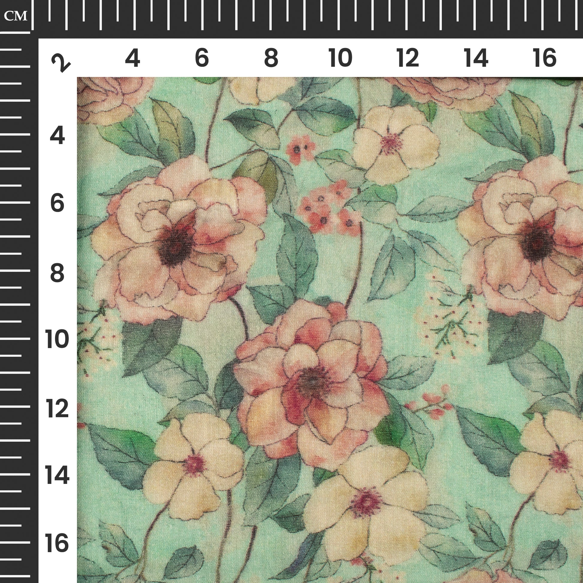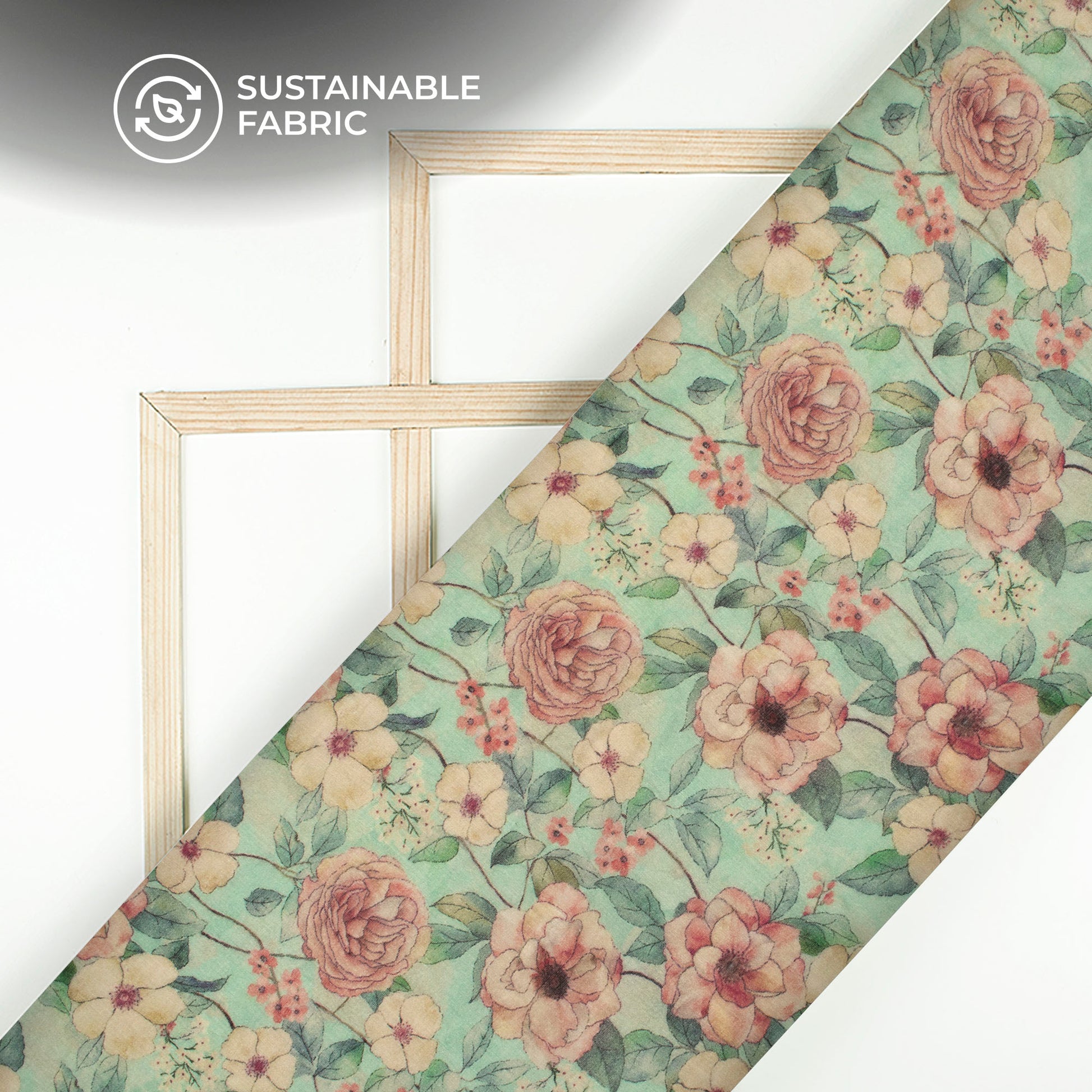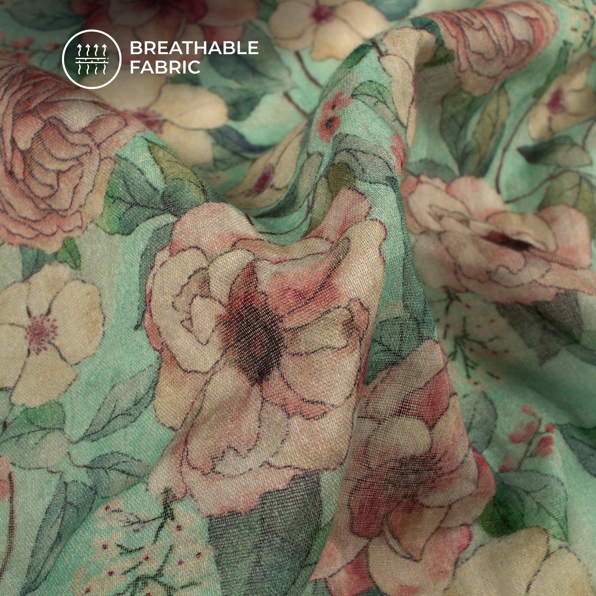 Mint Green And Peach Floral Digital Print Pure Cotton Mulmul Fabric