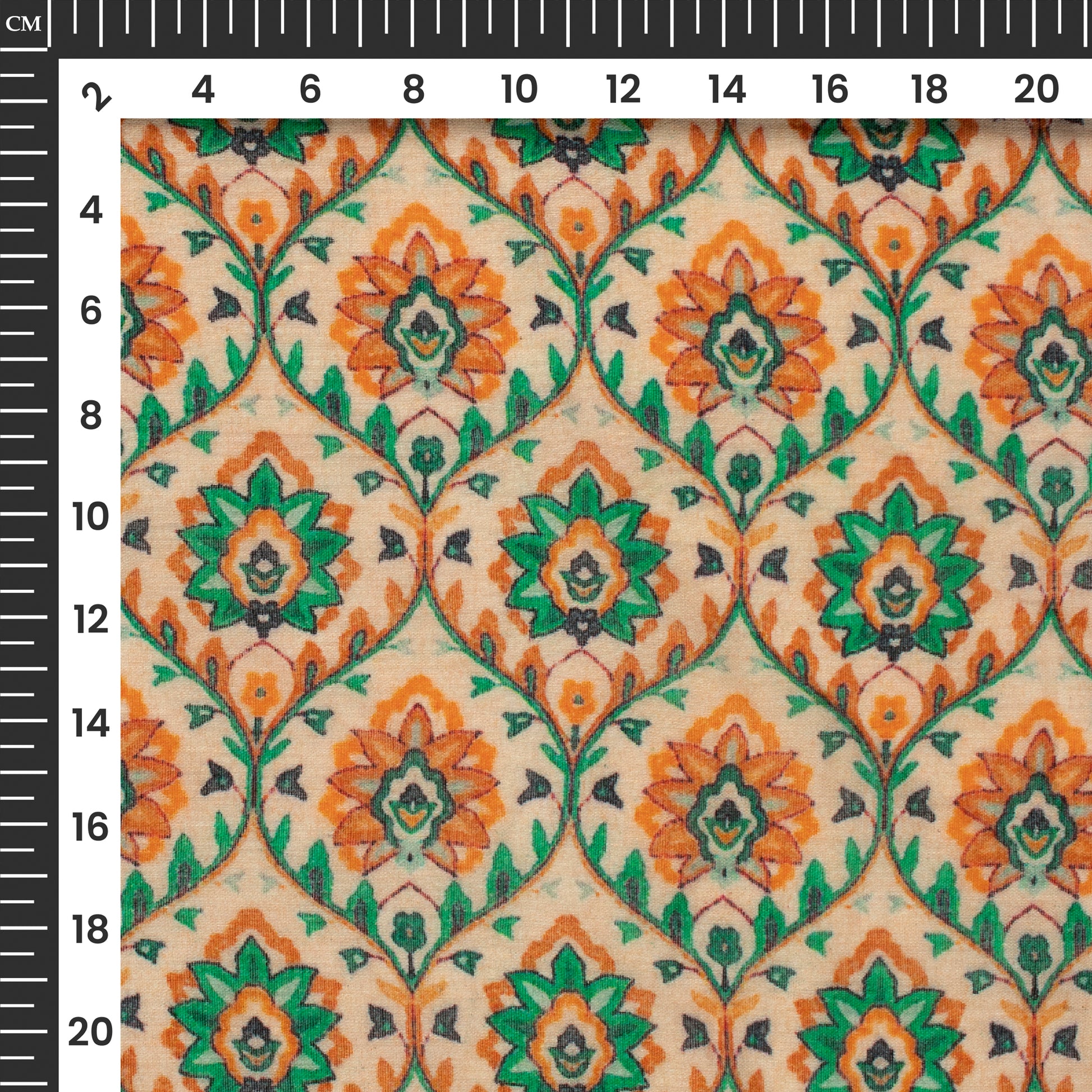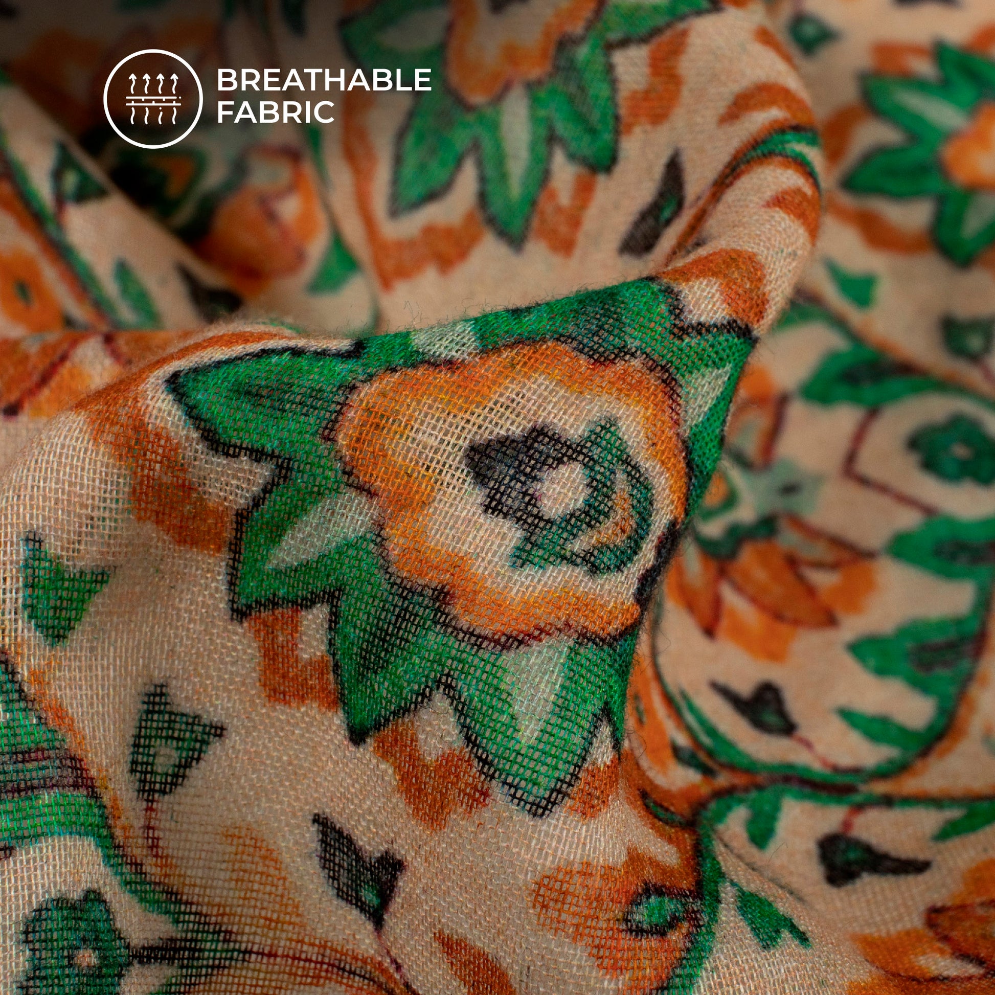 Exclusive Pale Orange And Green Floral Digital Print Pure Cotton Mulmul Fabric
