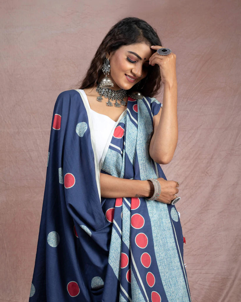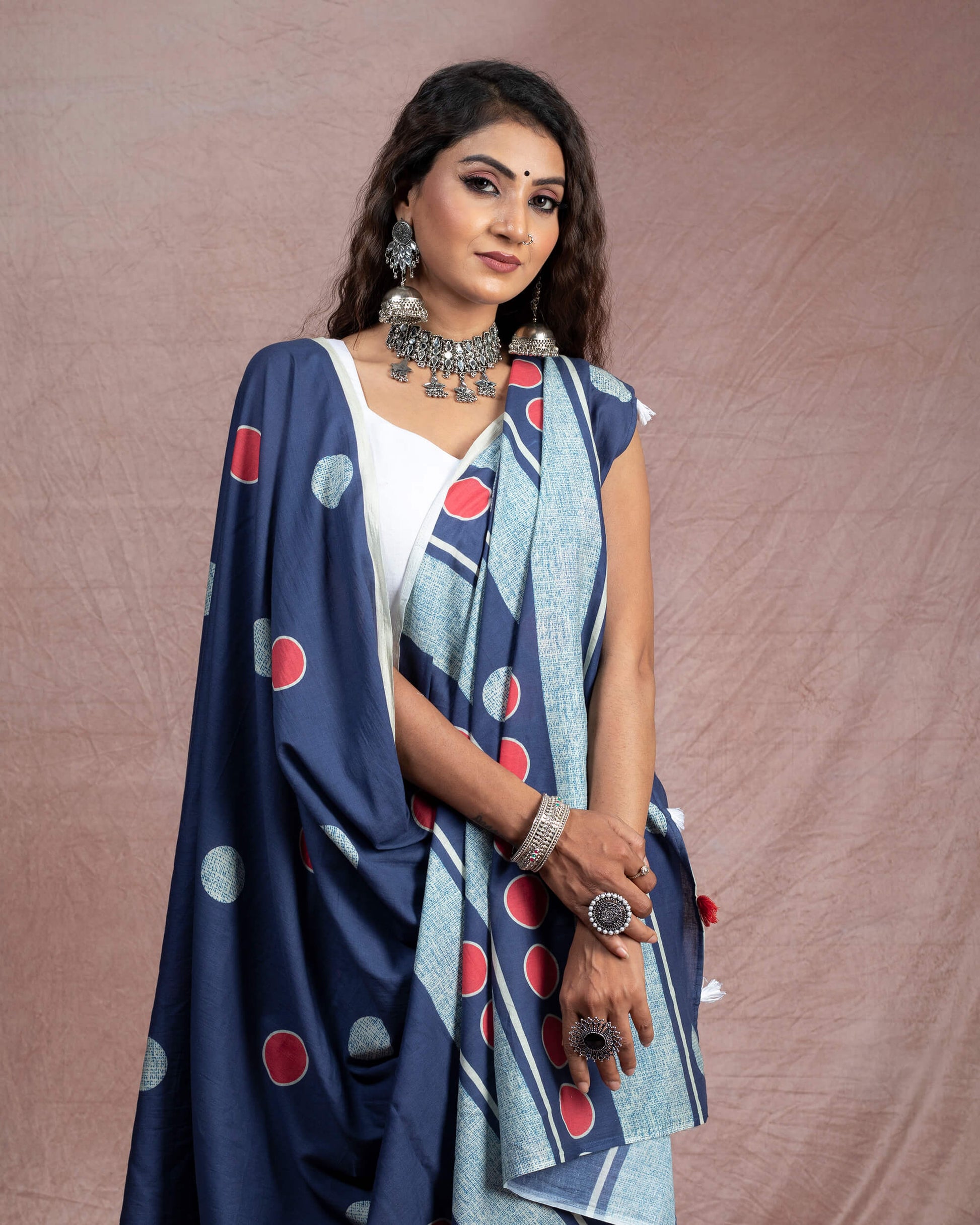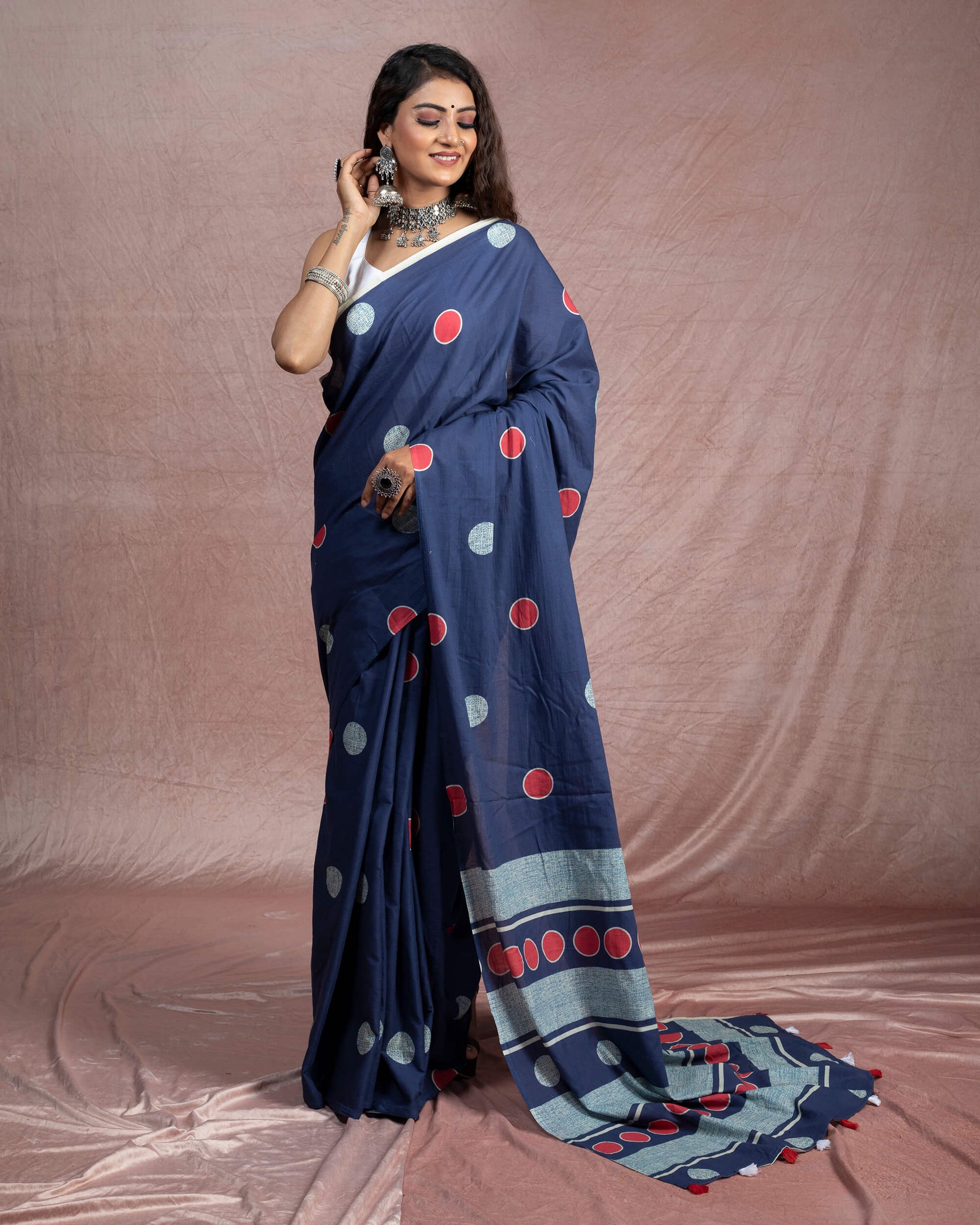Navy Blue And Red Polka Dots Pattern Digital Print Cotton Mulmul Saree With Tassles