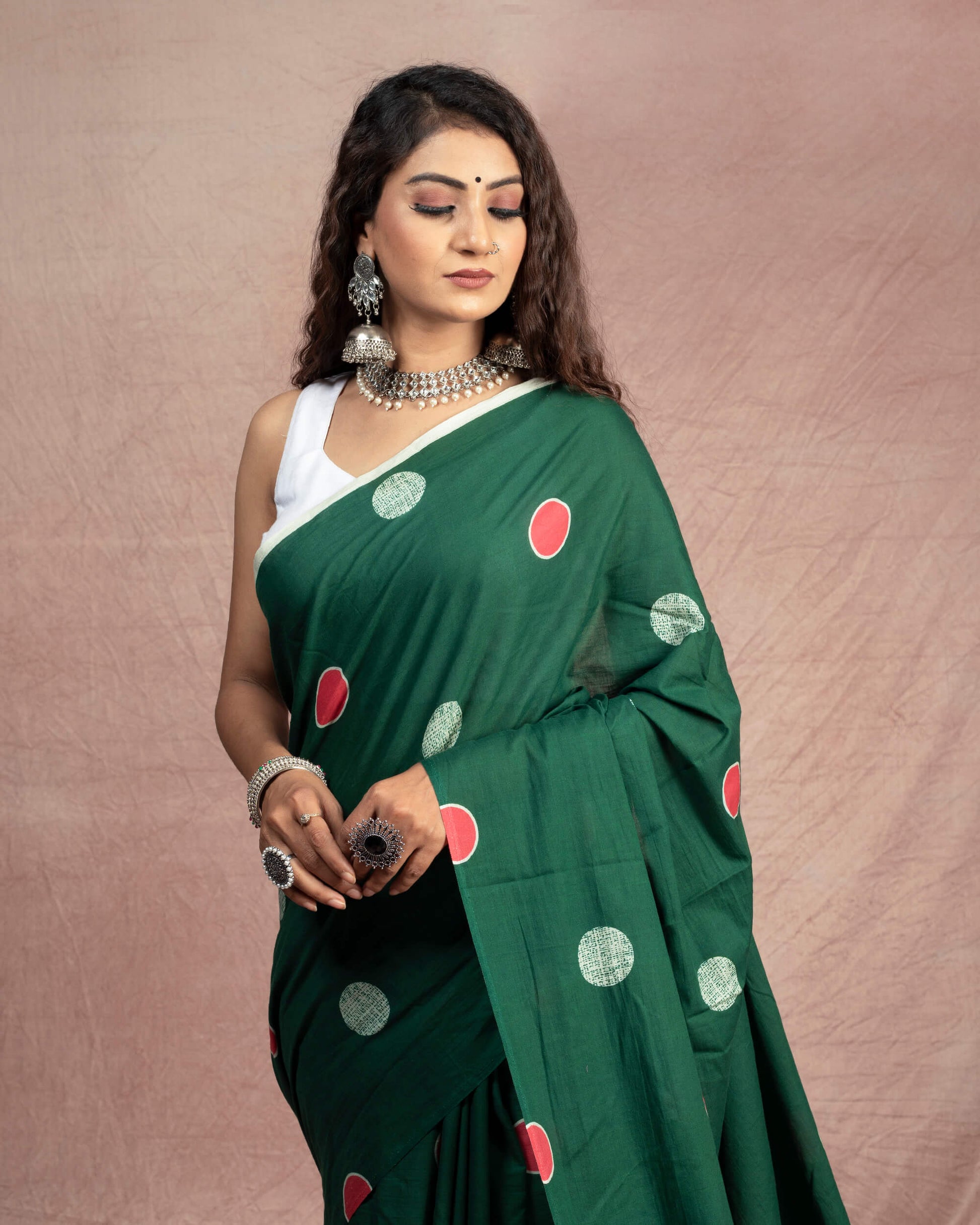 Sacramento Green And Red Polka Dots Pattern Digital Print Cotton Mulmul Saree With Tassles