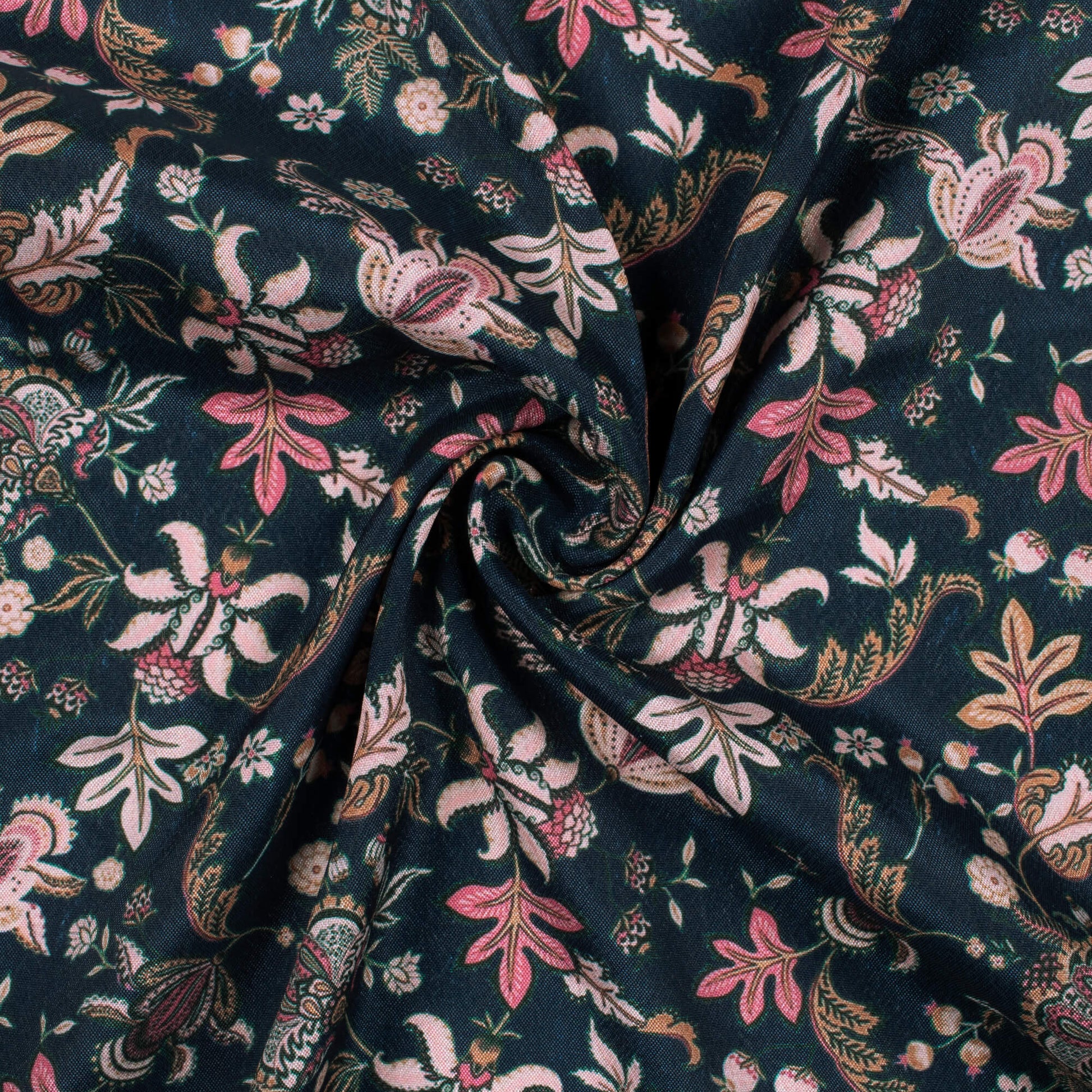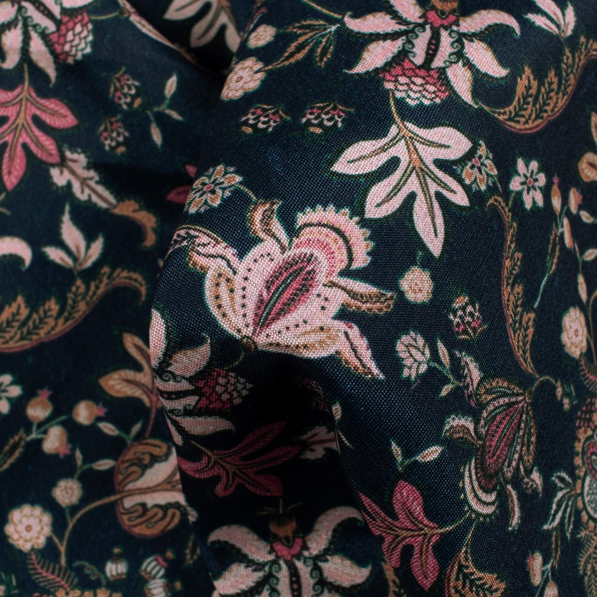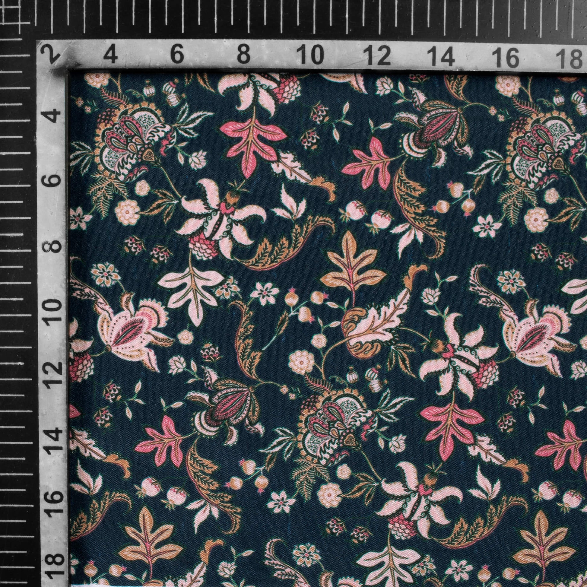 Prussian Blue And Beige Floral Pattern Digital Print Crepe Silk Fabric
