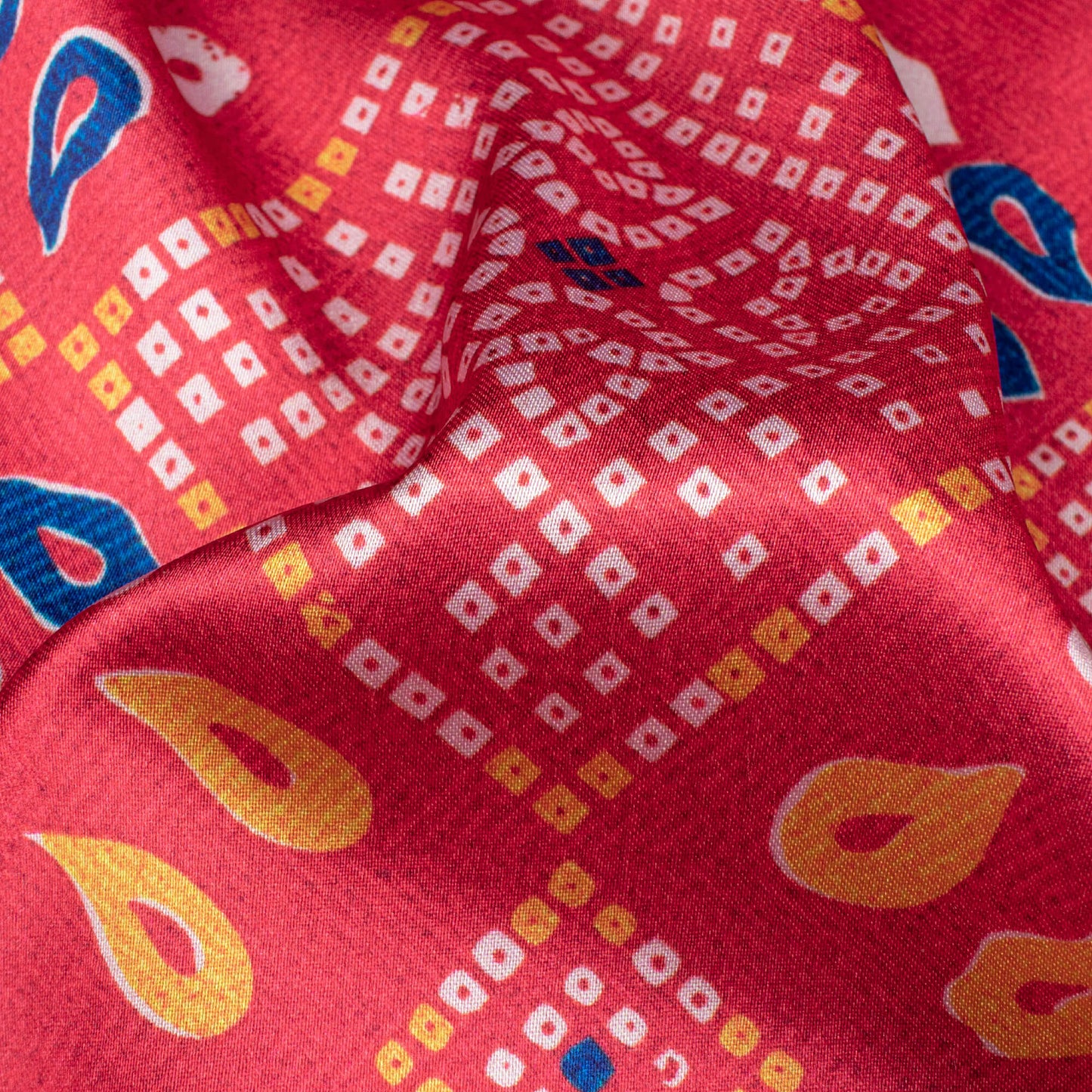 Vermilion Red And Dark Blue Bandhanii Pattern Digital Print Japan Satin Fabric